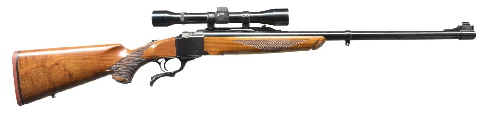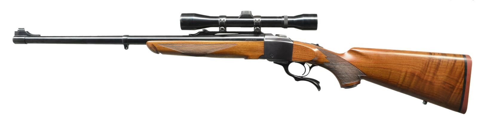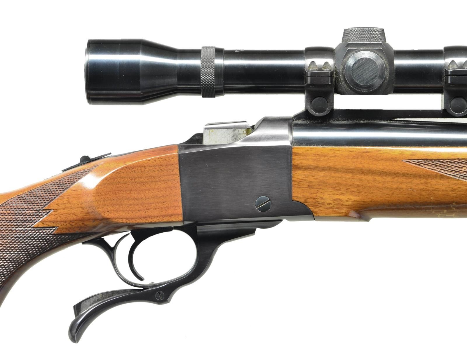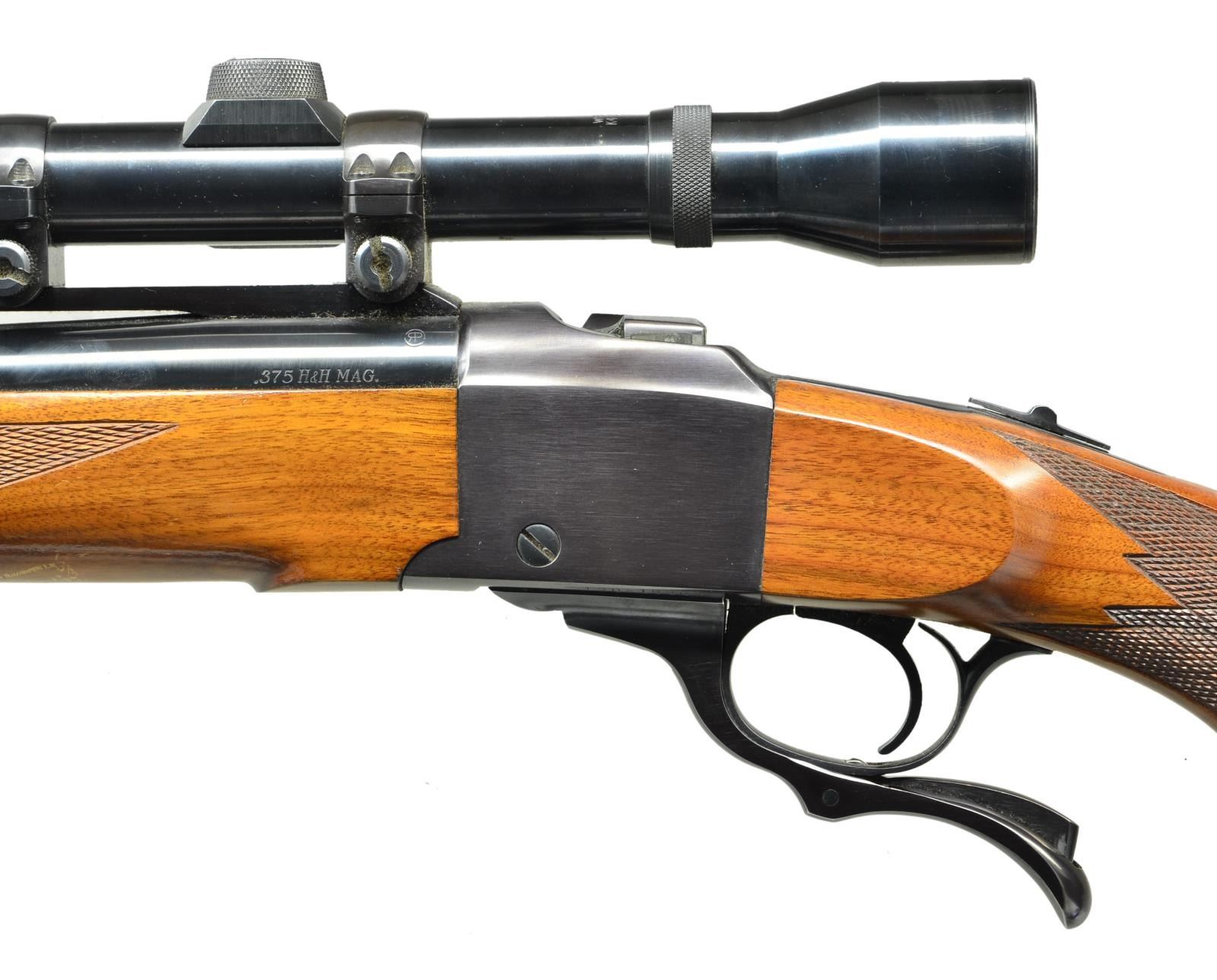 Cal. 375 H&H Mag. S# 130-15362. Bbl. 24" heavy bbl. w/ band style front sight having easy user changeable brass bead sight; folding leaf rear on Ruger quarter rib. Ruger rings w/ steel Weaver K4-1 post crosshair reticle scope. Mfg. 1975 w/out warning marks. Checkered walnut stock set w/ Alex Henry forend & red pad buttstock having sling stud plus steel grip cap; bbl. band front swivel base. CONDITION: stock set has handling marks principally on bottom of forend & toeline of buttstock. Rifle metal finish near excellent & some very faint pinprick spots on scope finish. Near excellent bore & optics. (22-3249/NW). MODERN. $750-1,000.
