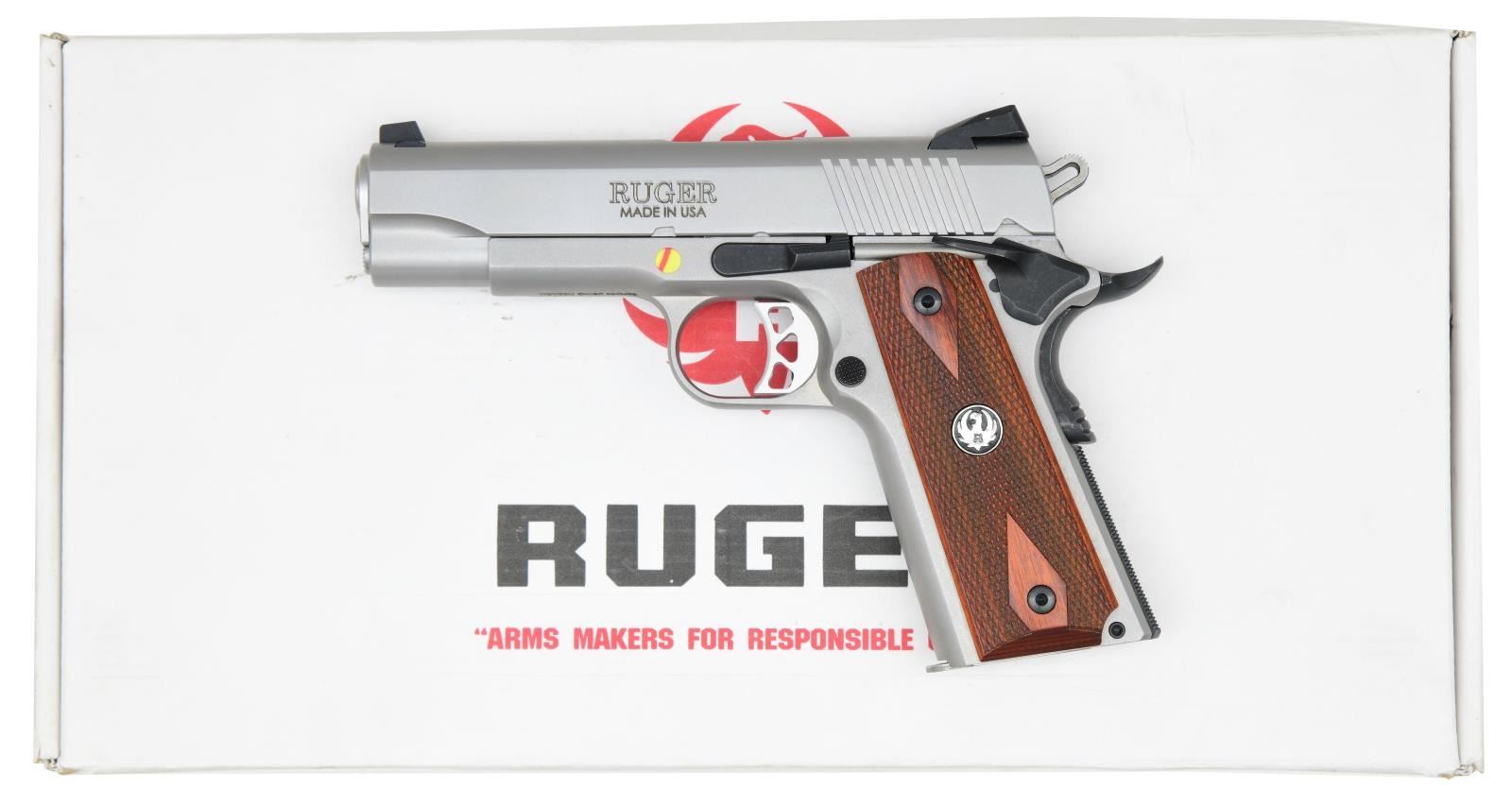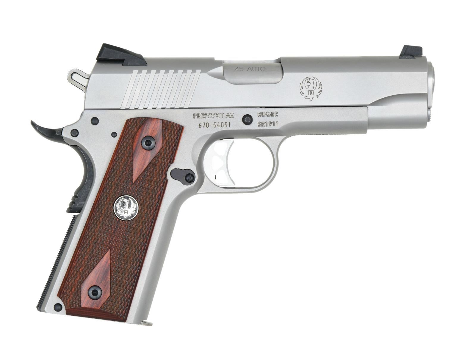 Cal. 45 ACP. S# 670-54051. Bbl. 4.25" throated stainless with chamber inspection port plus flared and enlarged ejection port. Mfg. 2013 (2011 to date for all SR1911's) as Model 06702 in Prescott, AZ, with a low-glare full stainless finish plus matte black accents. Dovetailed 3-dot sights have a windage-adjustable Novak-style rear. Laminated walnut-checkered grips with double diamonds and silver eagle medallions are retained by Allen head screws. Standard enhanced Ruger features include an integral plunger tube, extended magazine release, a silver skeletonized trigger with overtravel adjustment, a titanium firing pin for faster lock time, a black flat checkered mainspring housing, black stylized beavertail grip safety with a memory pad, a skeletonized hammer, a flared magazine well, and extended thumb safety. Slide has angled, square-cut cocking grooves. MAGS: 2 factory stainless 7 rd. with standard flat integral bases drilled and tapped for bumpers. UNATTACHED ACCESSORIES: matching numbered factory box with packaging to include Ruger logo nylon zippered pouch. CONDITION: all aspects are near excellent, appearing new and unfired; still has an inspection sticker on the left of the frame. (23-6931/NW). MODERN. $800-1,100.