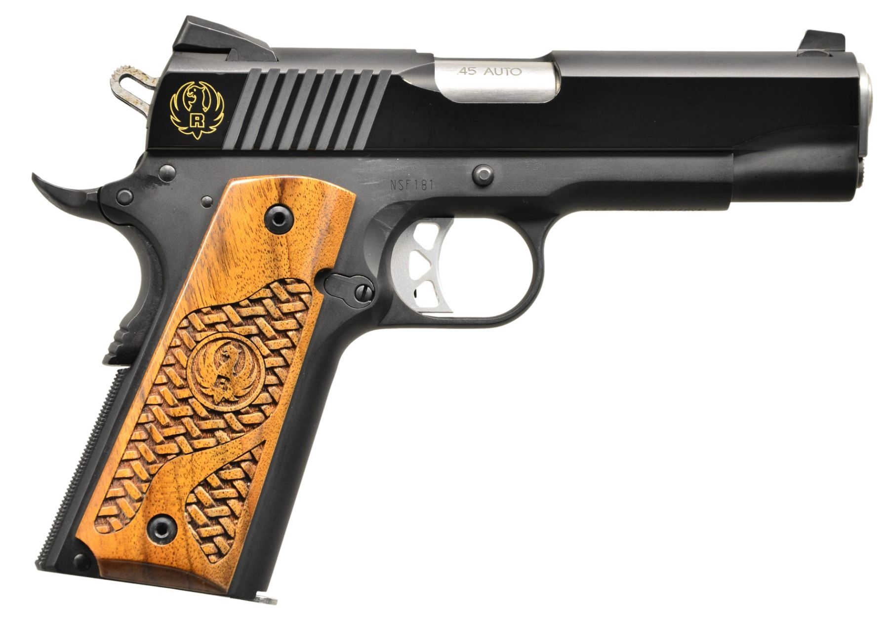 PISTOL. Cal. 45 ACP. S# NSF181. Bbl. 4.25" stainless (bushing, too) throated. Mfg. 2014 as Model 06704 and distributed by Davidson's as a limited edition of 500 units (NSF001 to NSF500) to raise money for the Navy Seal Foundation (NSF). For each pistol sold, $100 was donated to the Foundation. Commander is configured of stainless steel with a high gloss DLC black coating on the slide (matte on the frame); at the rear is the Ruger logo on the right and the NSF logo on the left (both in gold). Standard Ruger enhanced SR1911 features include an integral plunger tube, checkered flat mainspring housing, beavertail grip safety with memory pad, extended thumb safety, flared and lowered ejection port, extended magazine release, skeletonized hammer, and trigger with overtravel adjustment. Dovetailed 3-dot sight set with Novak-style drift-adjustable rear sight. Grips are laser-engraved French walnut with Ruger logos and basket weave gripping surfaces. MAGS: 2 factory bright stainless 7 rd. UNATTACHED ACCESSORIES: matching numbered factory box with packaging to include NSF and Davidson's materials. CONDITIONS: all aspects are near excellent; appears new and unfired. (23-6185/NW). MODERN. $650-900.
