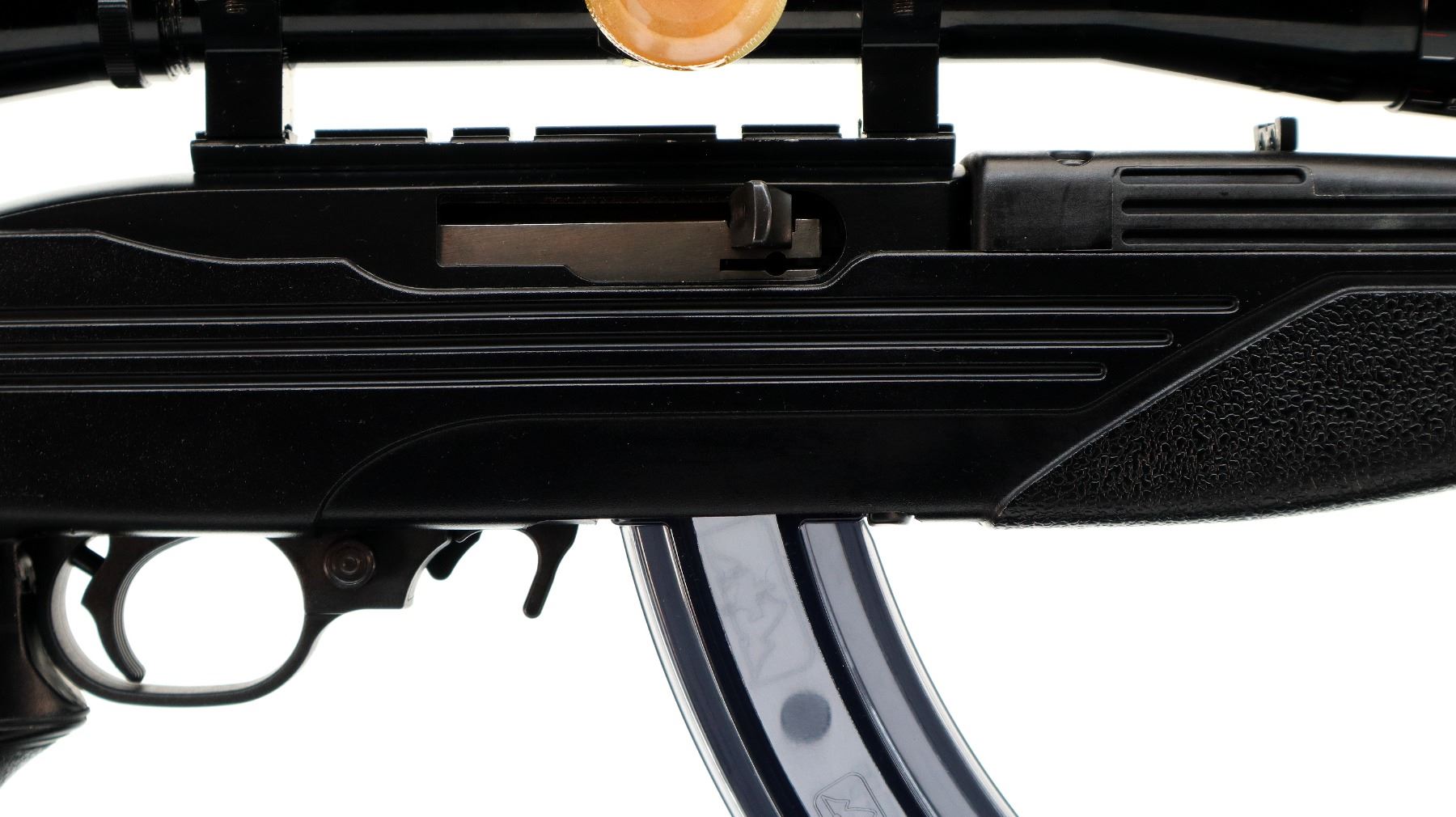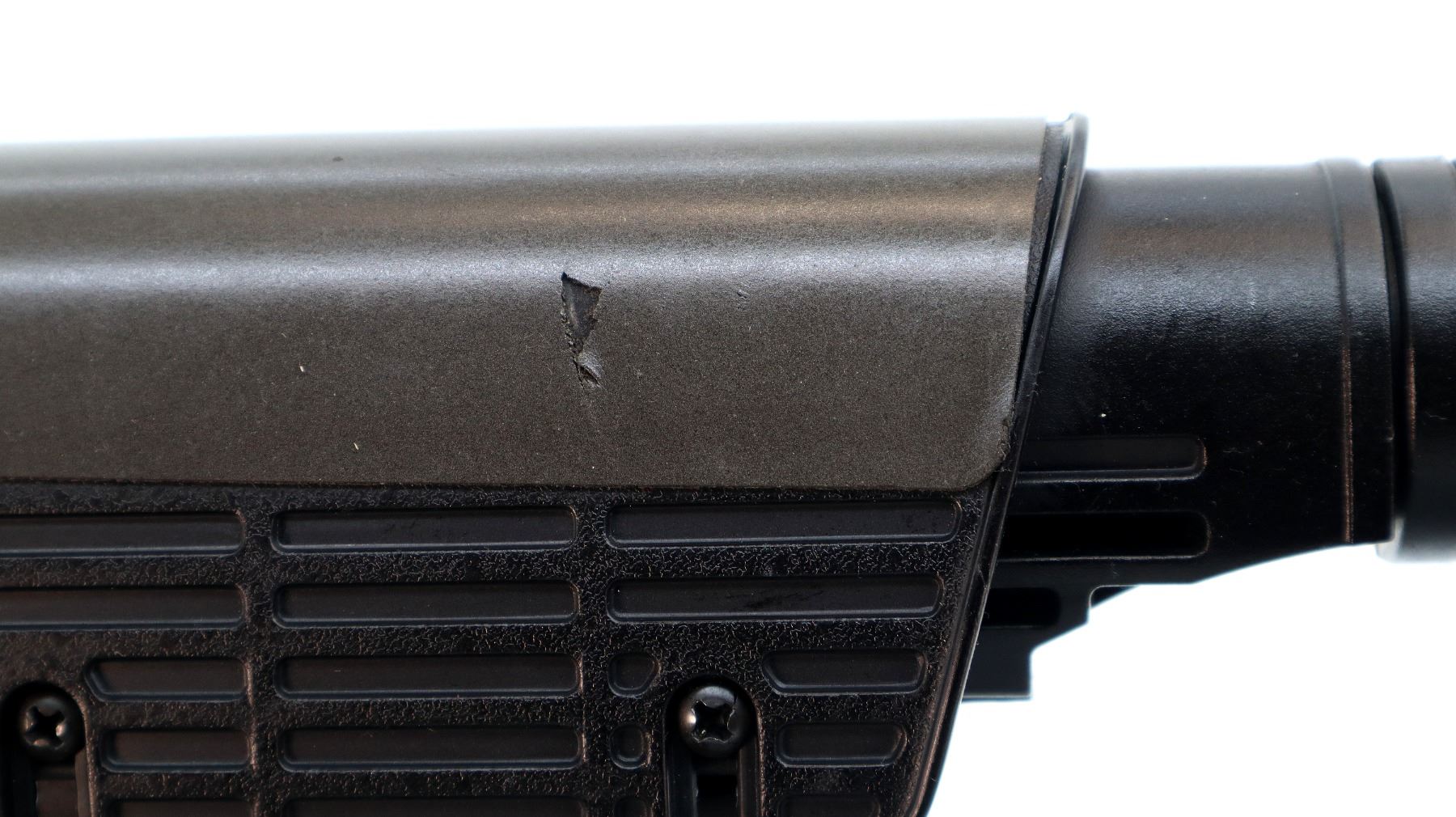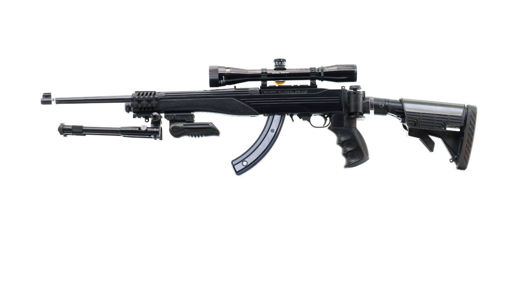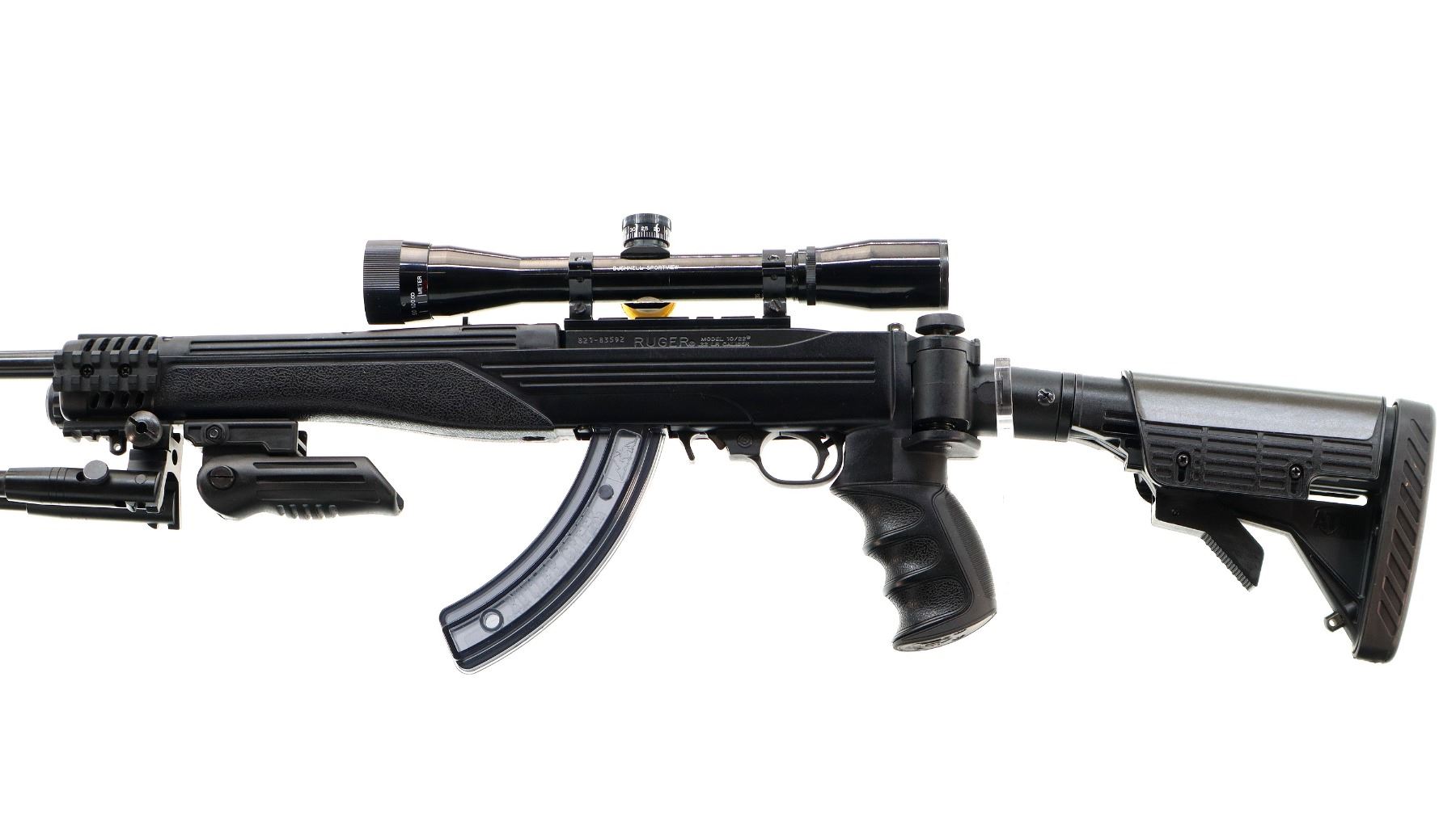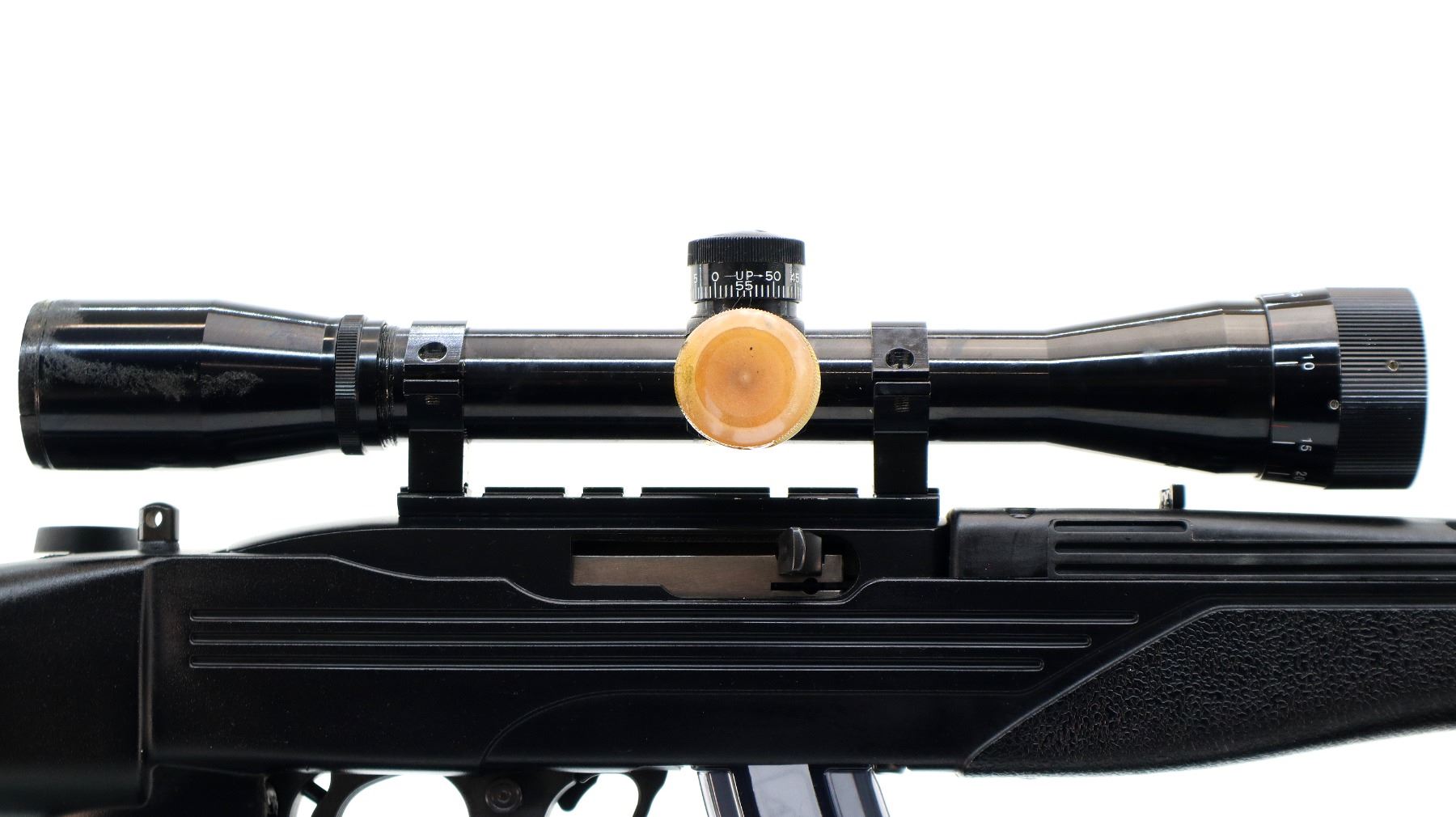 Main Description: Blade front sight with ramp, adjustable folding u notched rear sight, blued barrel, black alloy receiver drilled and tapped with One piece rail and Bushnell Sportview 4x32 AO scope installed, clear optics with duplex crosshair, windage knob has been replaced. Four piece ATI black synthetic stocks, ventilated handguard, textured forearm, finger grooved pistol grip, collapsible and folding butt stock with adjustable cheek rest, black rubber recoil pad, extended mag release, folding front grip and attached bipod, three short rails on forend, right side has a laser installed (not tested), swivel studs.