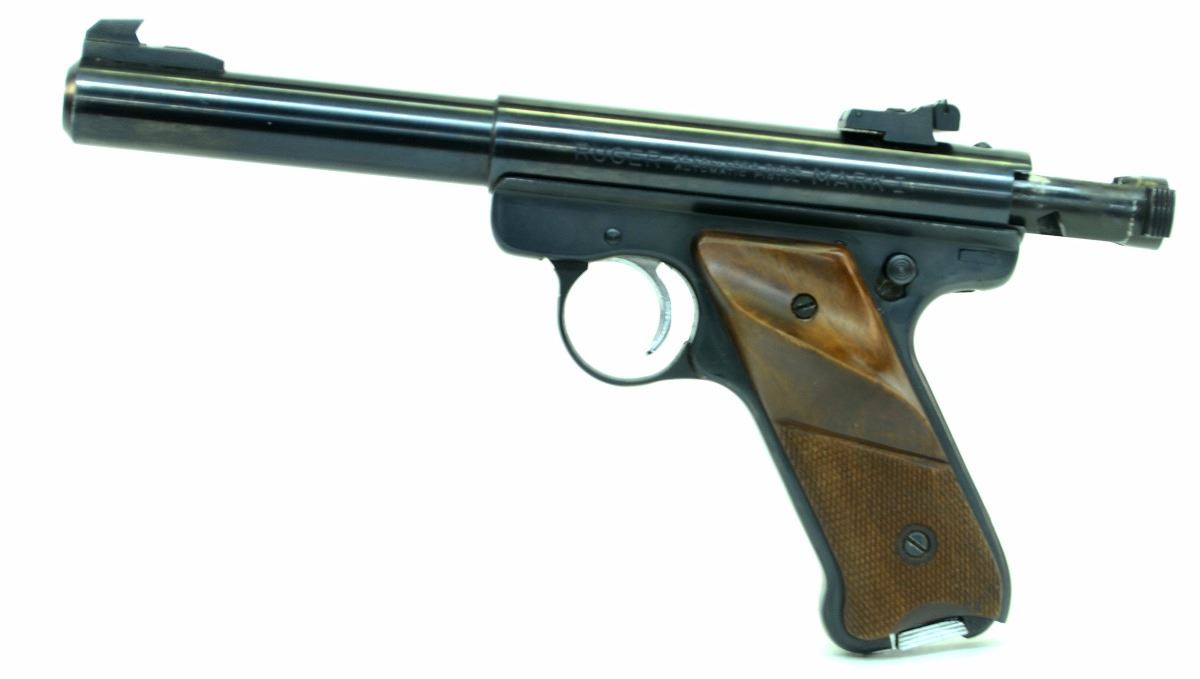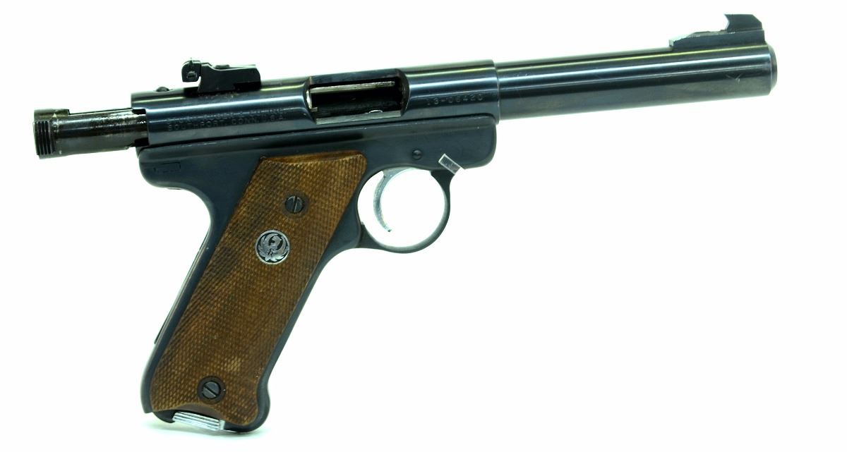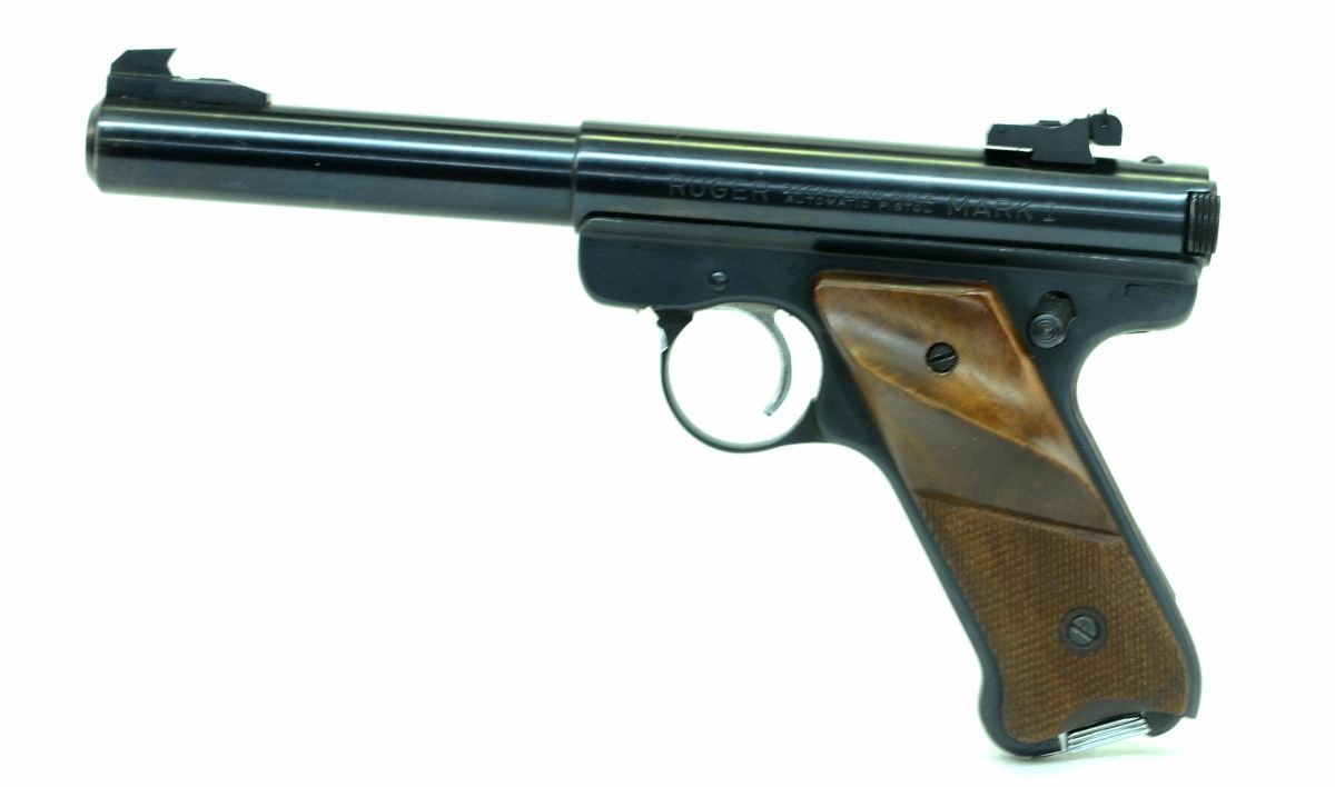STOCK 2240HR-0563-G1, RUGER, MODEL MARK I, CAL 22 LR, SEMI - AUTOMATIC BARREL LENGTH 140mm, COMES WITH HOLSTER AND MAG, ADJUSTABLE TARGET SIGHTS, BULL BARREL, TARGET GRIPS,CONDITION 8/10