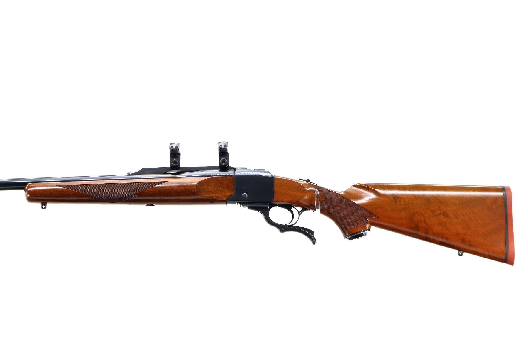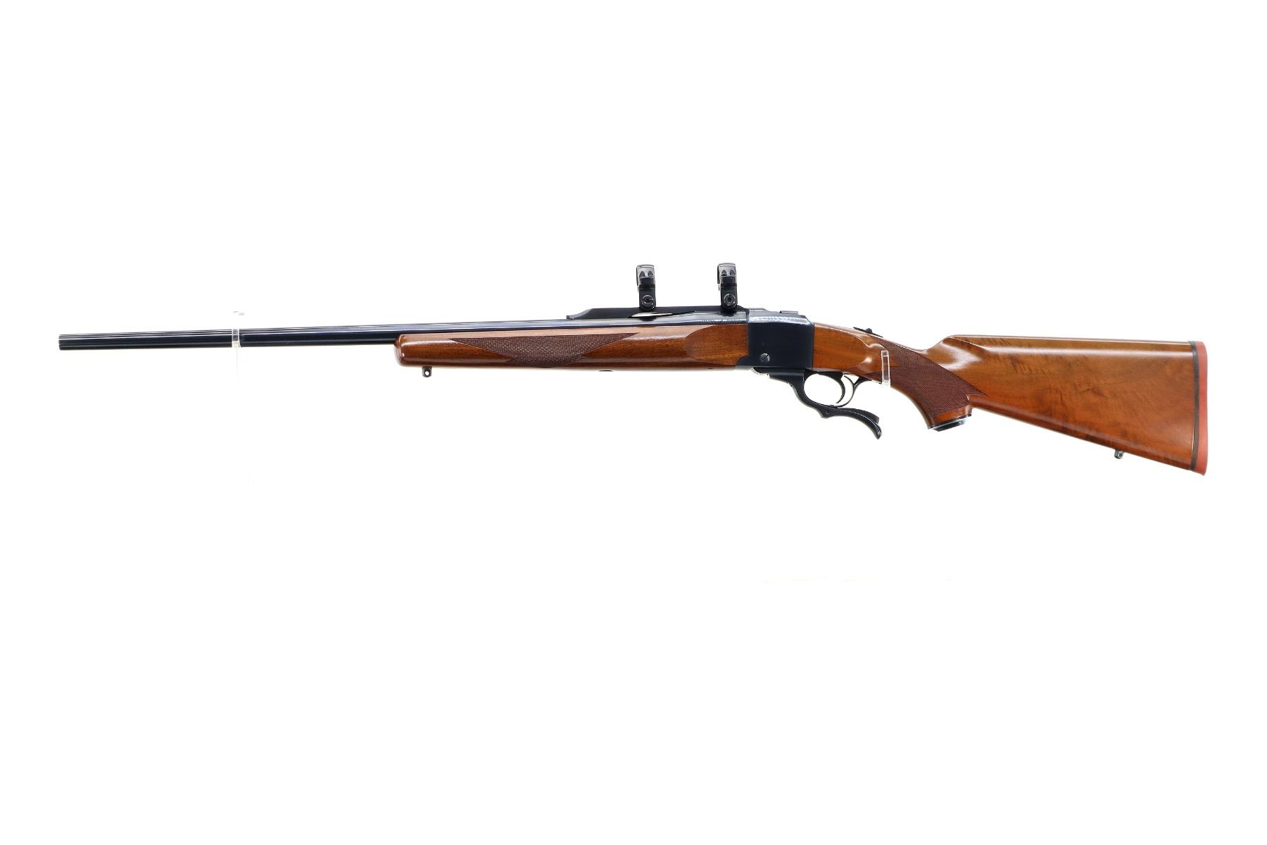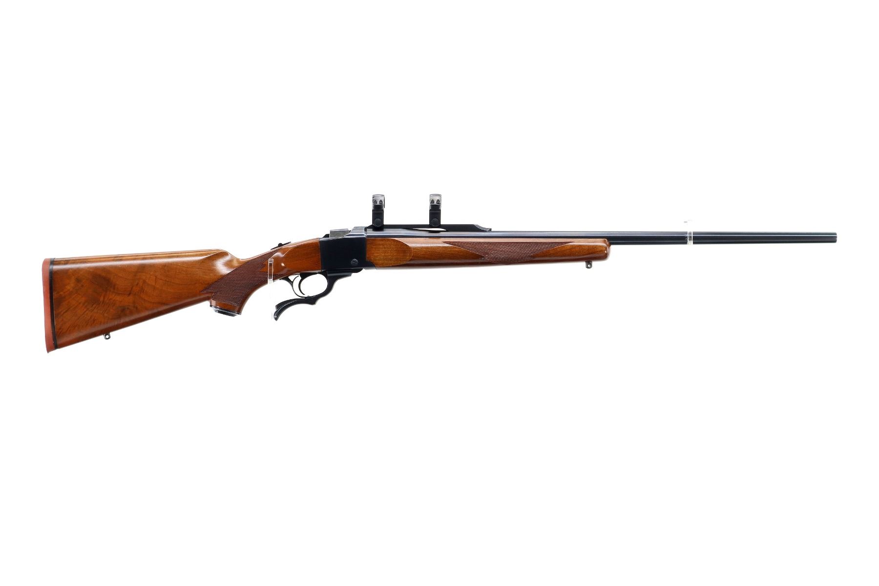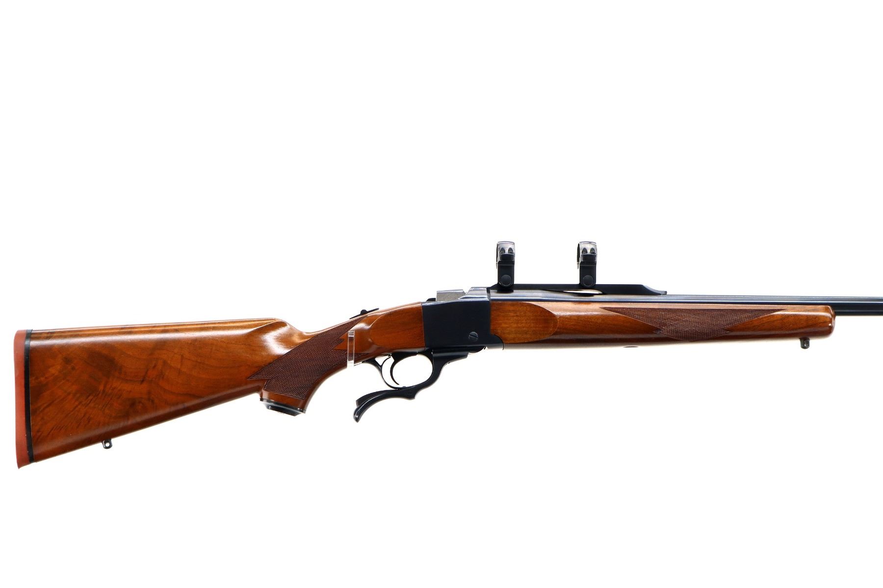 Main Description: No sights, polish blued finish, tapered round barrel with solid rib, integral bases and 1" Ruger rings installed, tang safety. Two piece gloss finish wood stocks, checkered forearm and pistol grip, red rubber recoil pad, grip cap, swivel studs.