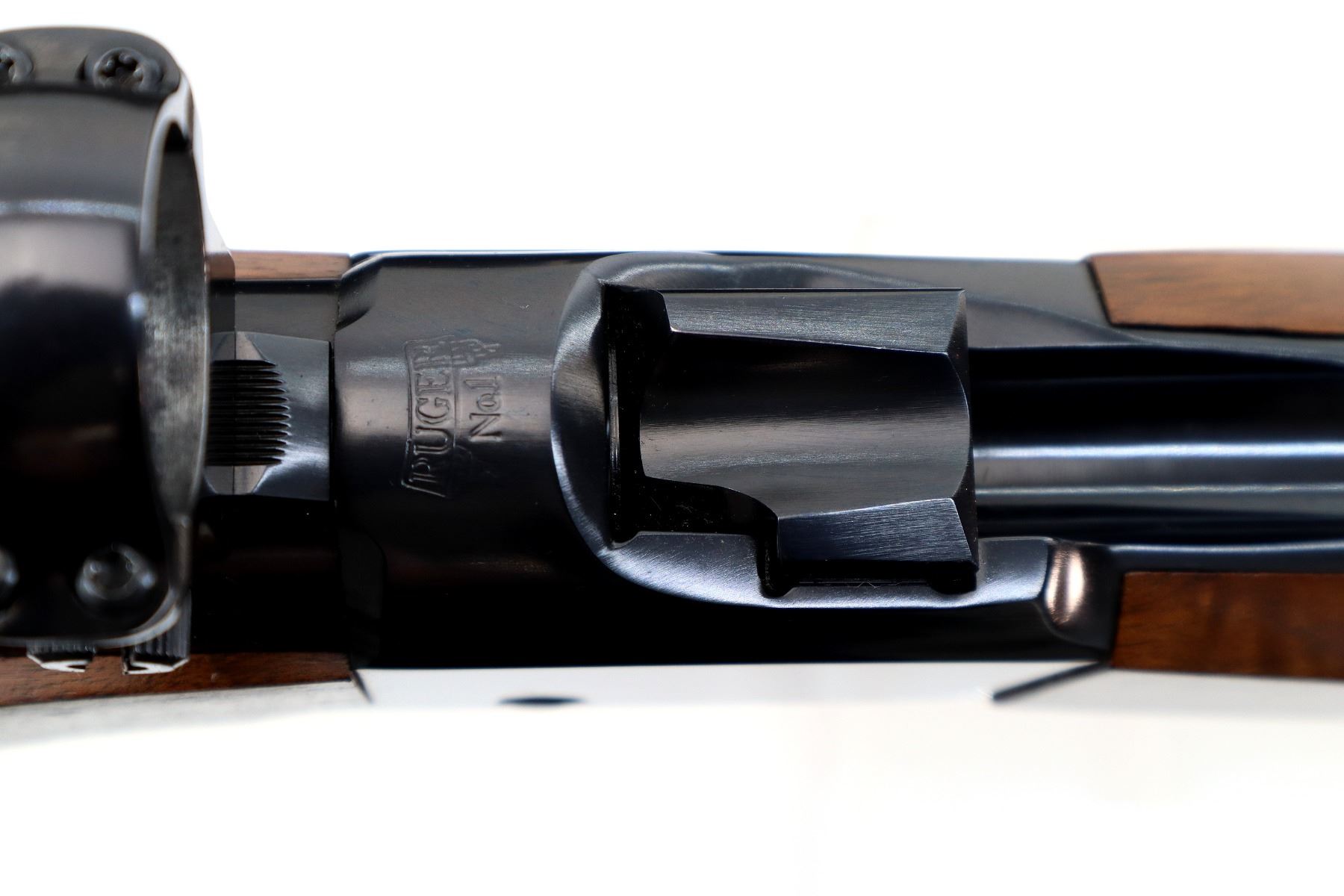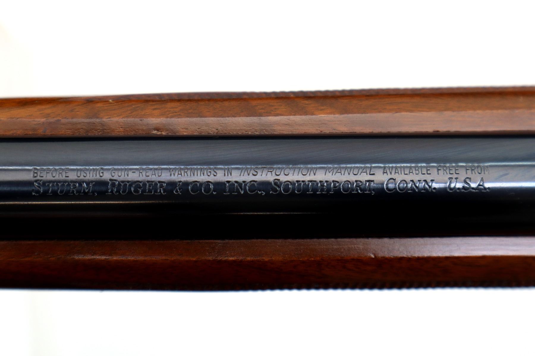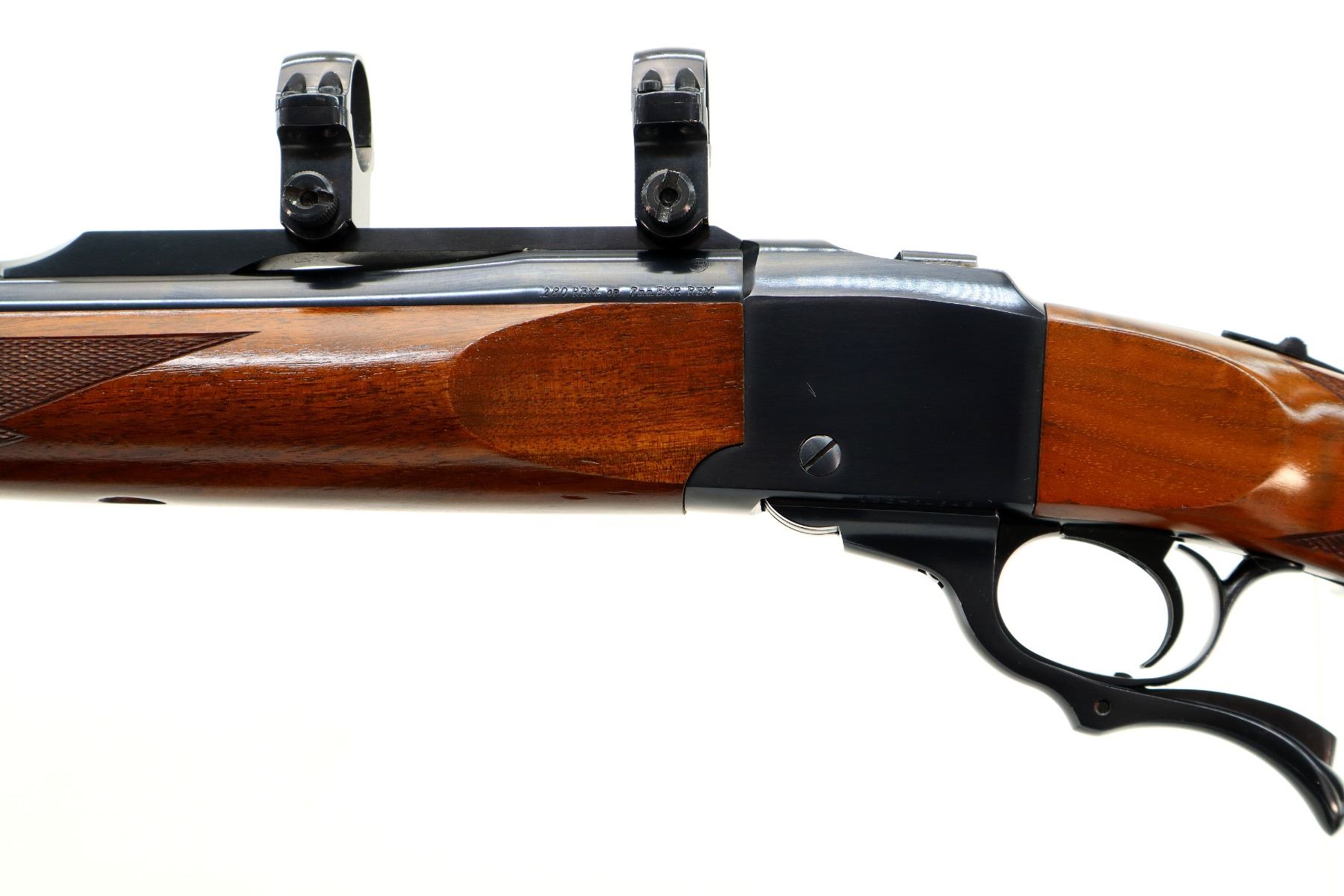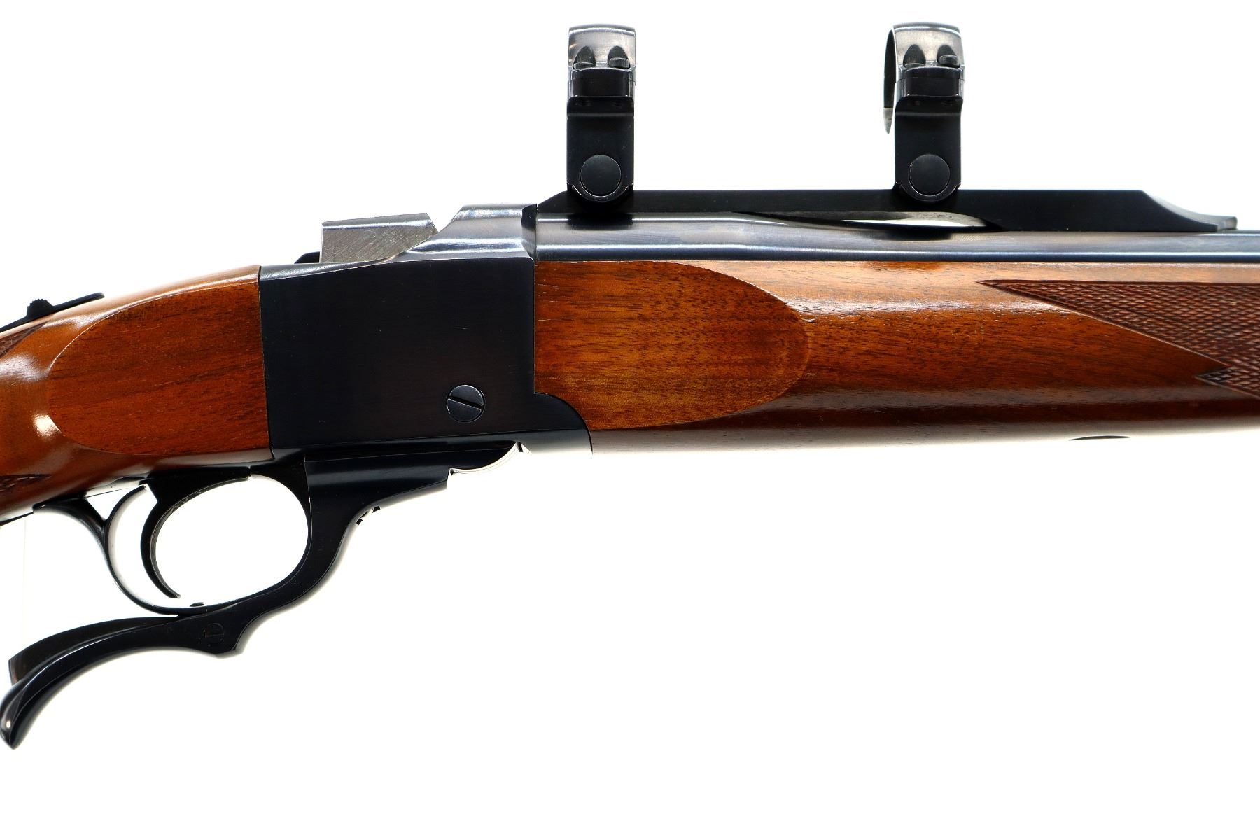 Main Description: No sights, polish blued finish, tapered round barrel with solid rib, integral bases and 1" Ruger rings installed, tang safety. Two piece gloss finish wood stocks, checkered forearm and pistol grip, red rubber recoil pad, grip cap, swivel studs.