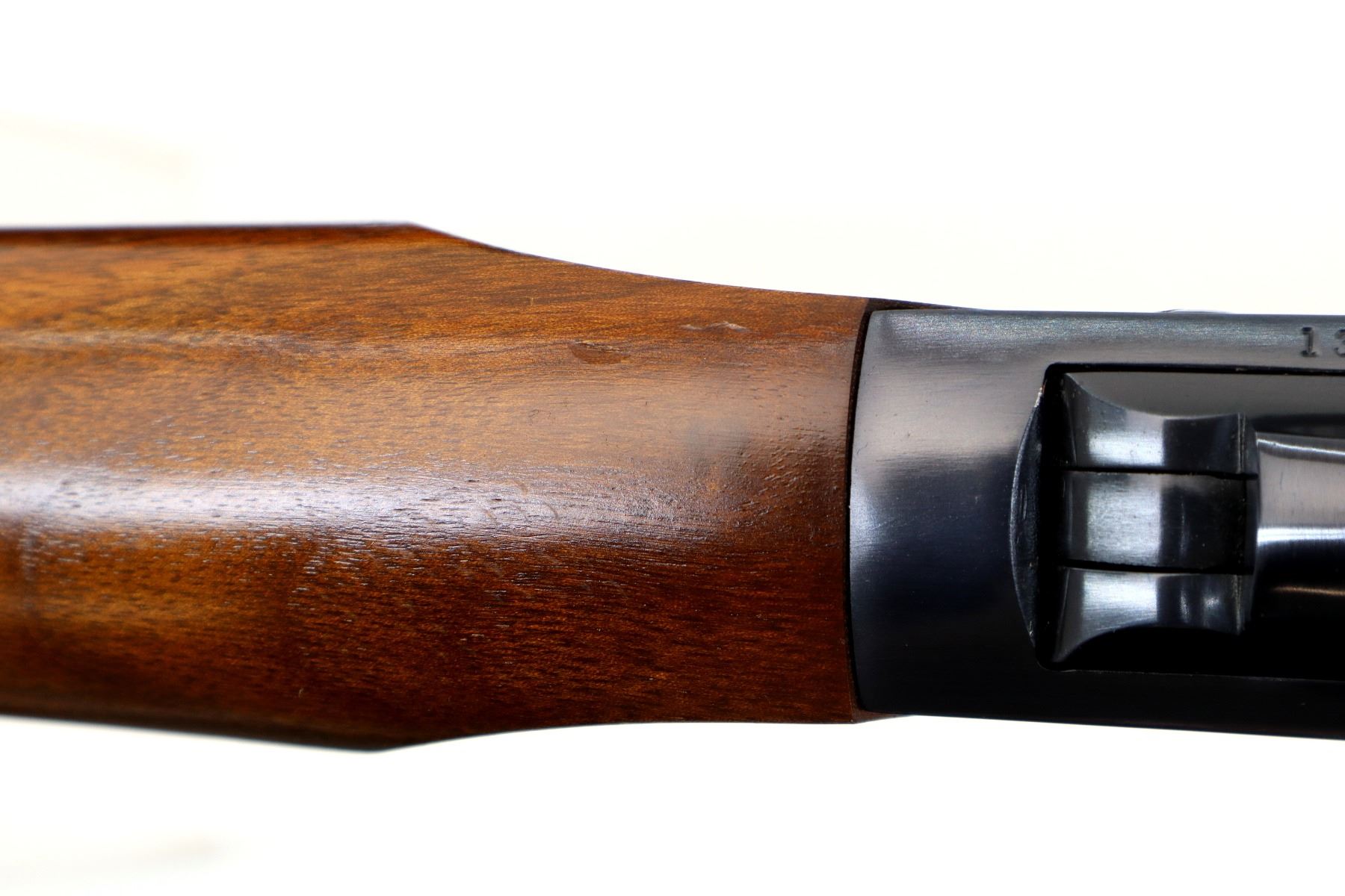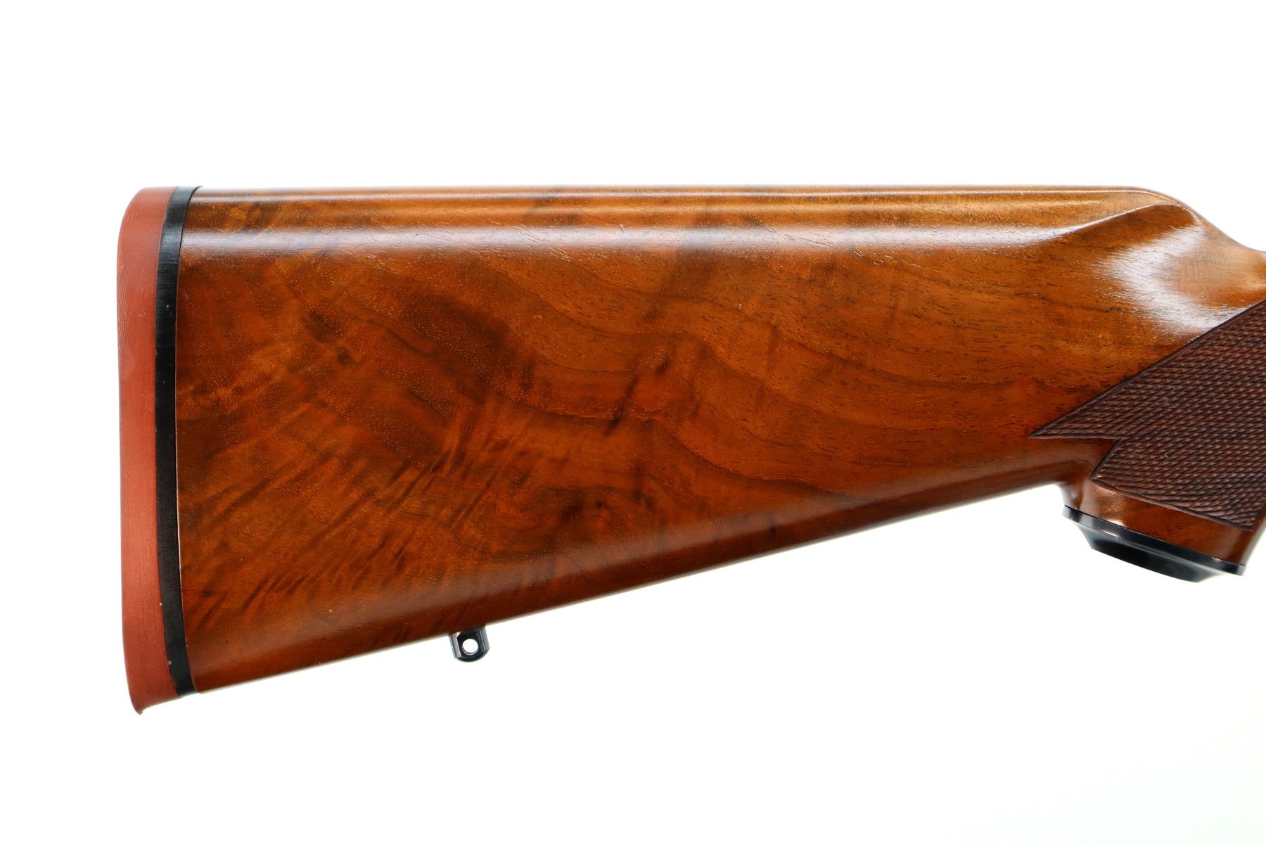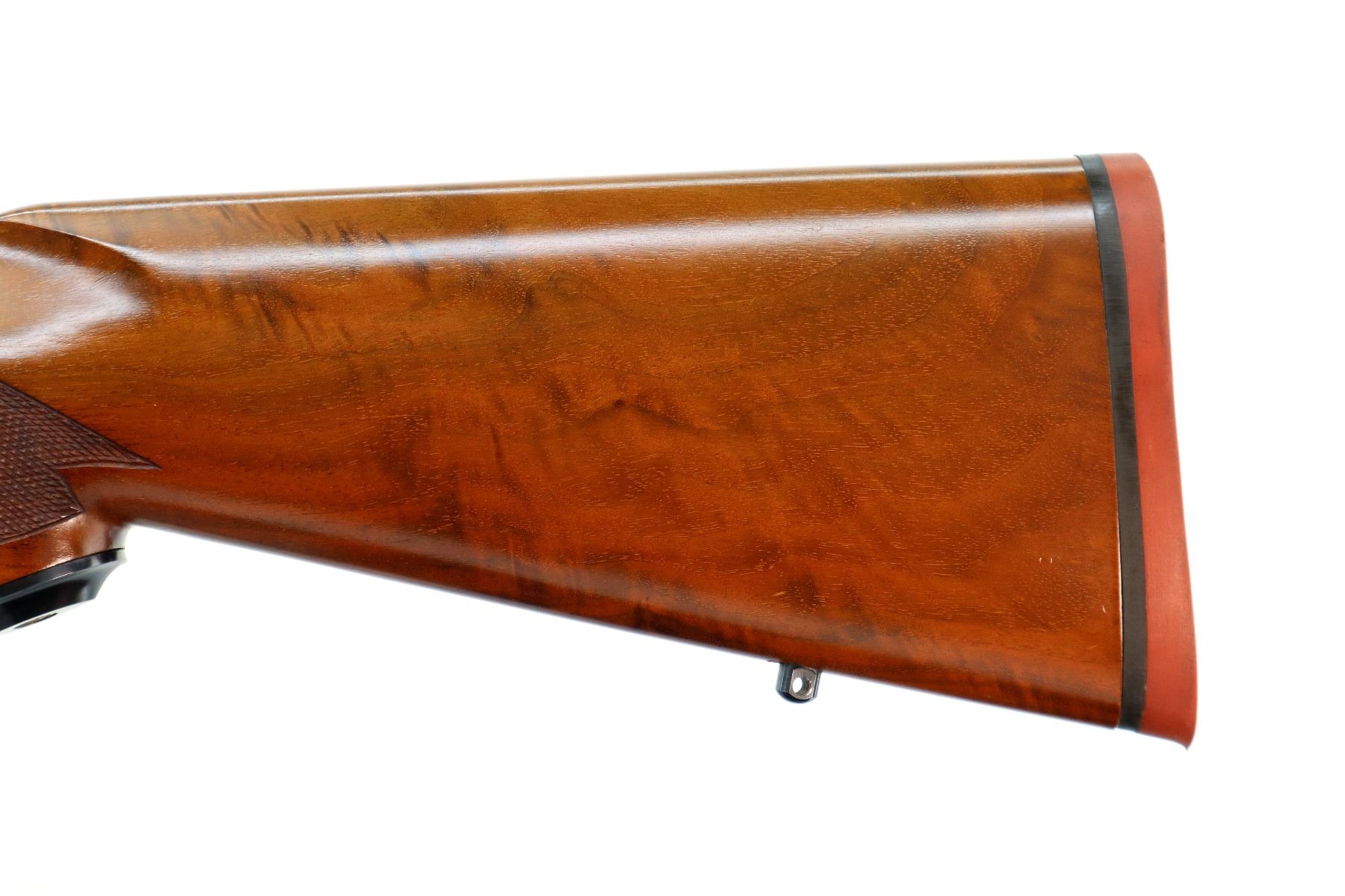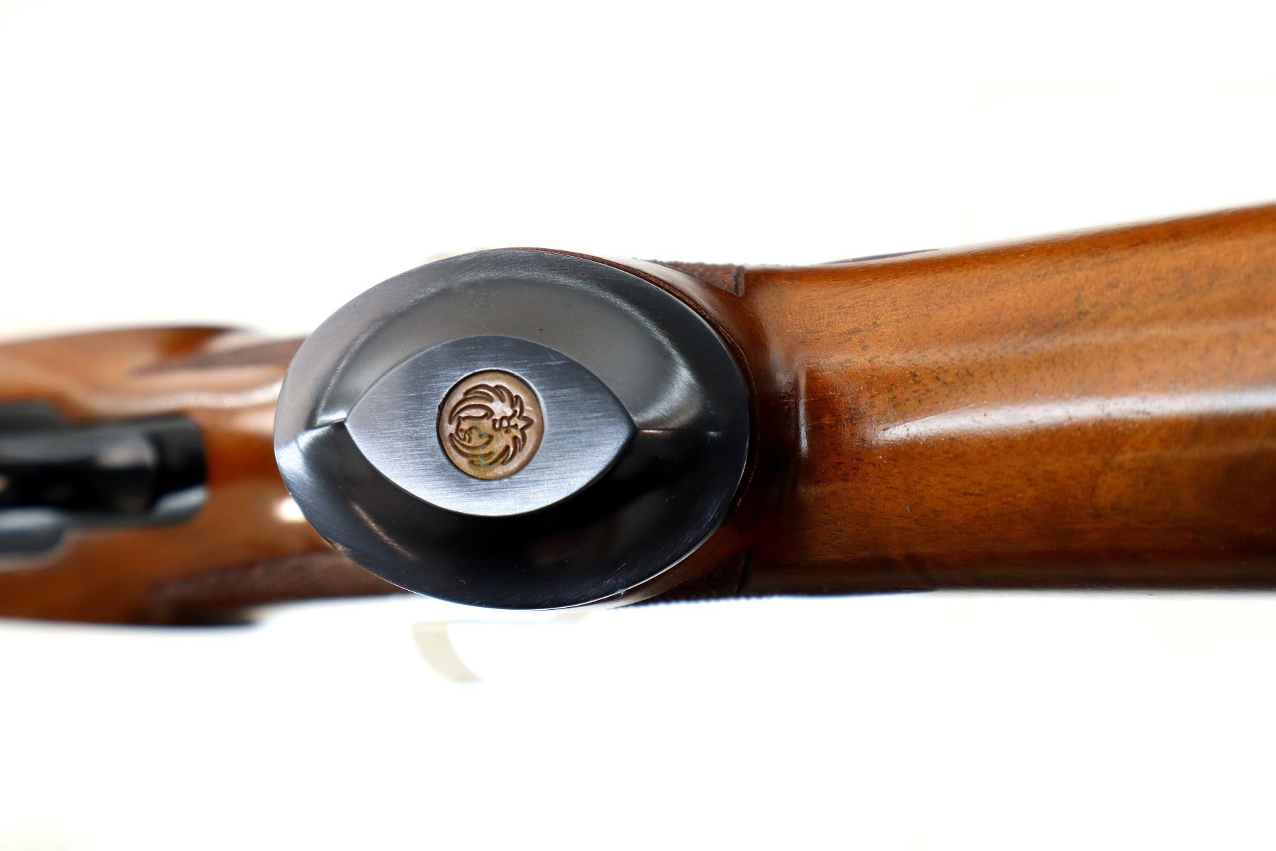Main Description: No sights, polish blued finish, tapered round barrel with solid rib, integral bases and 1" Ruger rings installed, tang safety. Two piece gloss finish wood stocks, checkered forearm and pistol grip, red rubber recoil pad, grip cap, swivel studs.
