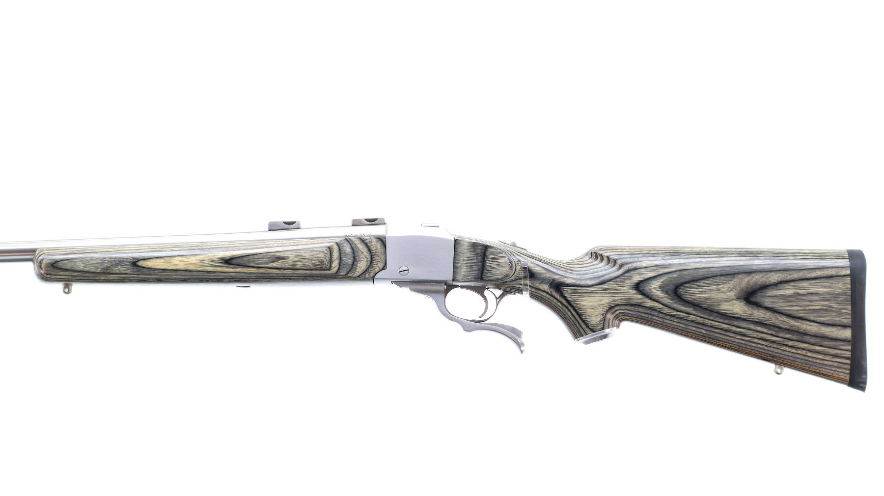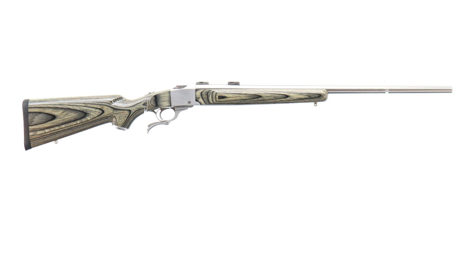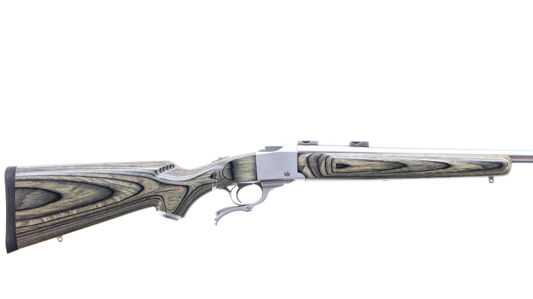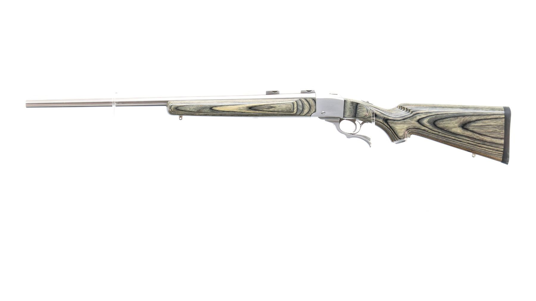 Main Description: No sights, stainless finish, heavy barrel drilled and tapped with factory bases installed, 2 holes drilled and tapped with plug screws installed behind the barrel markings, tang safety. Two piece grey laminate wood stocks, wide forearm, pistol grip, black rubber recoil pad, grip cap, swivel studs.