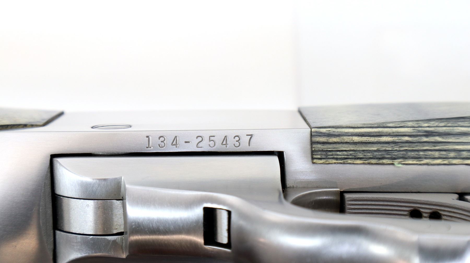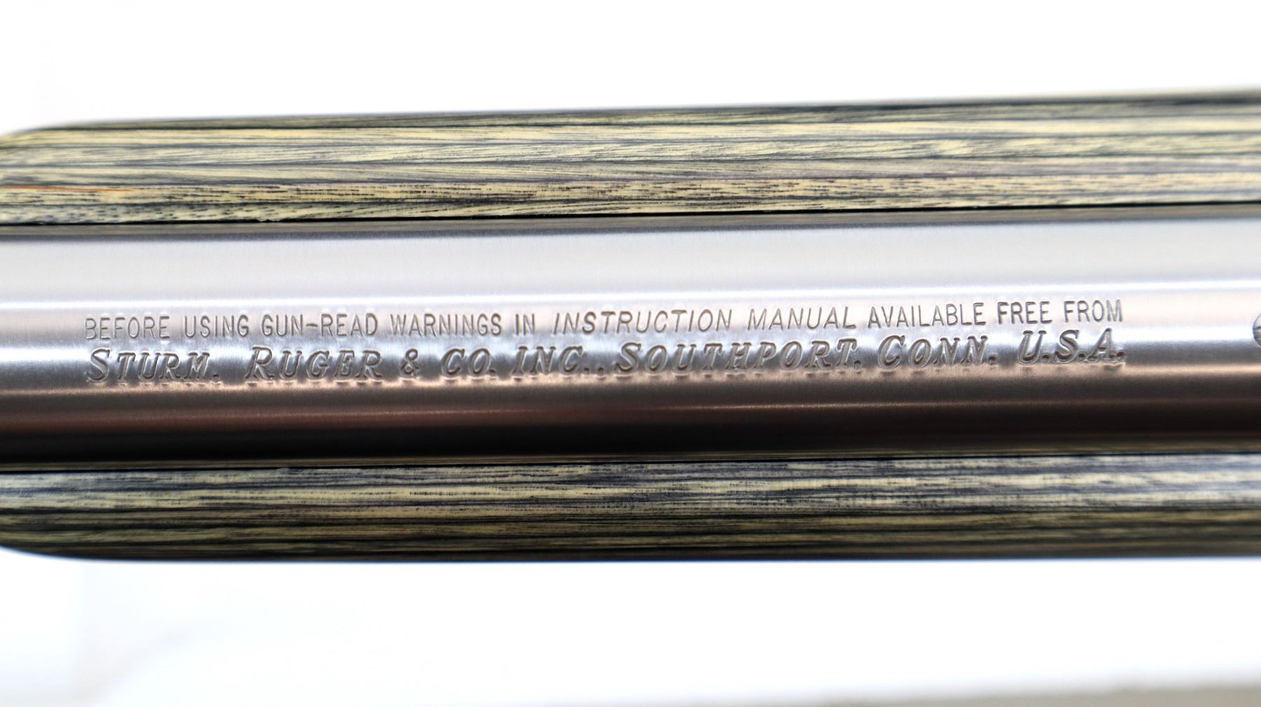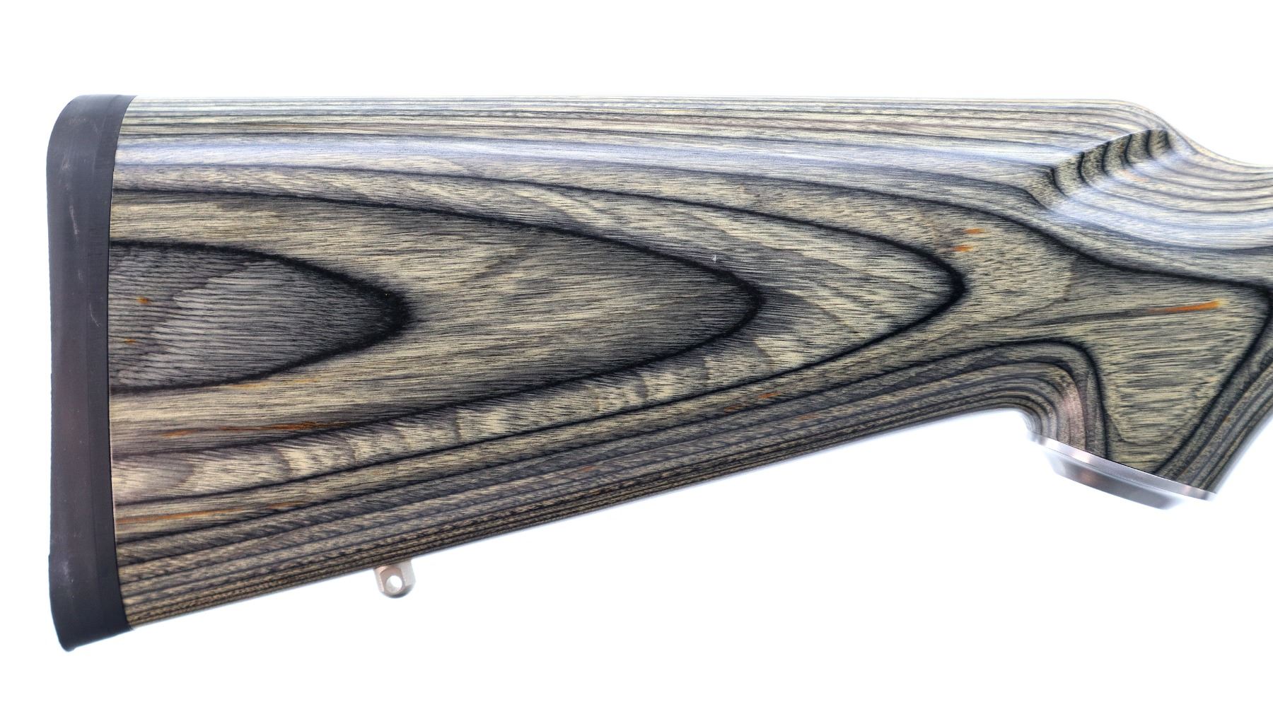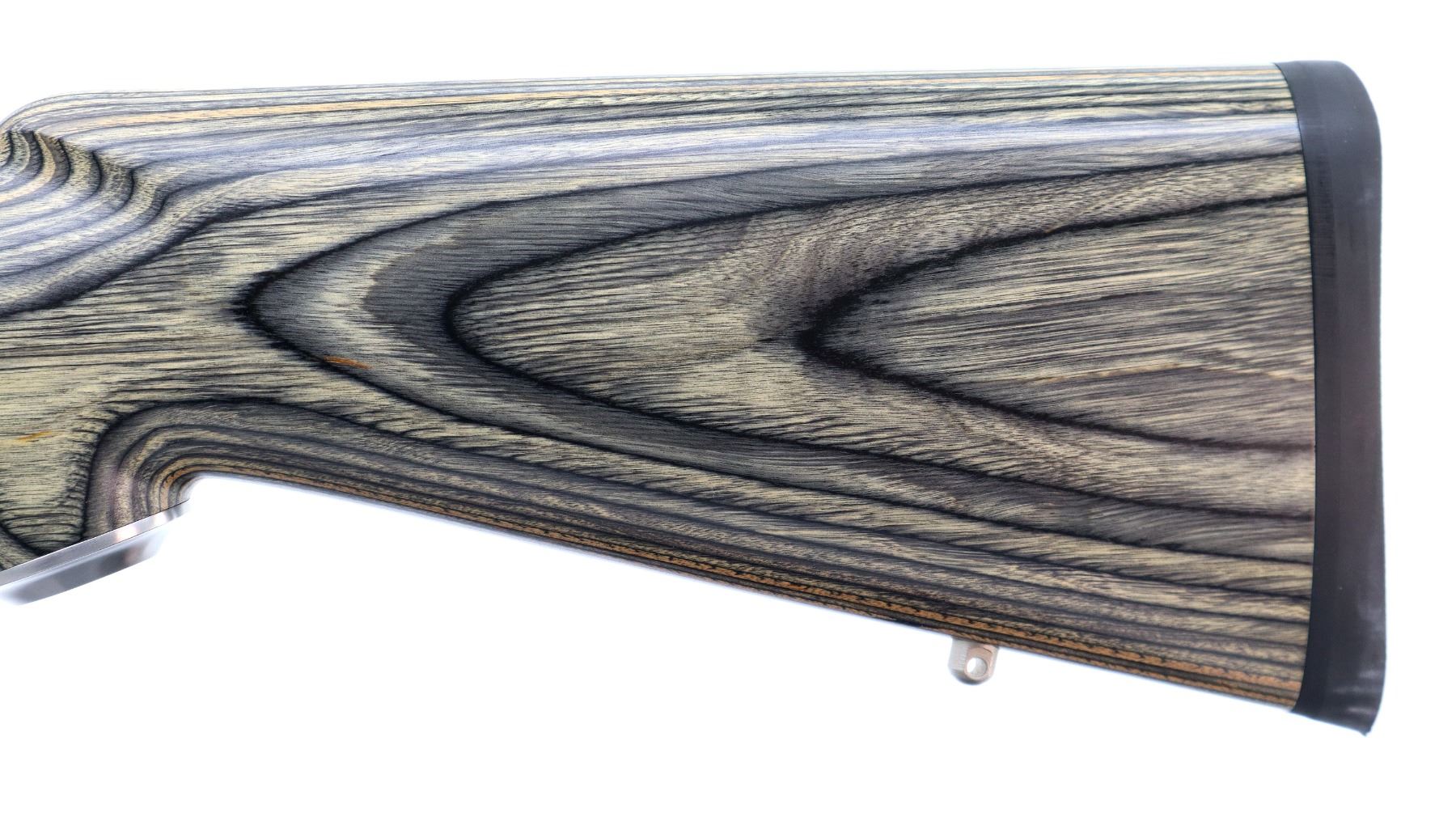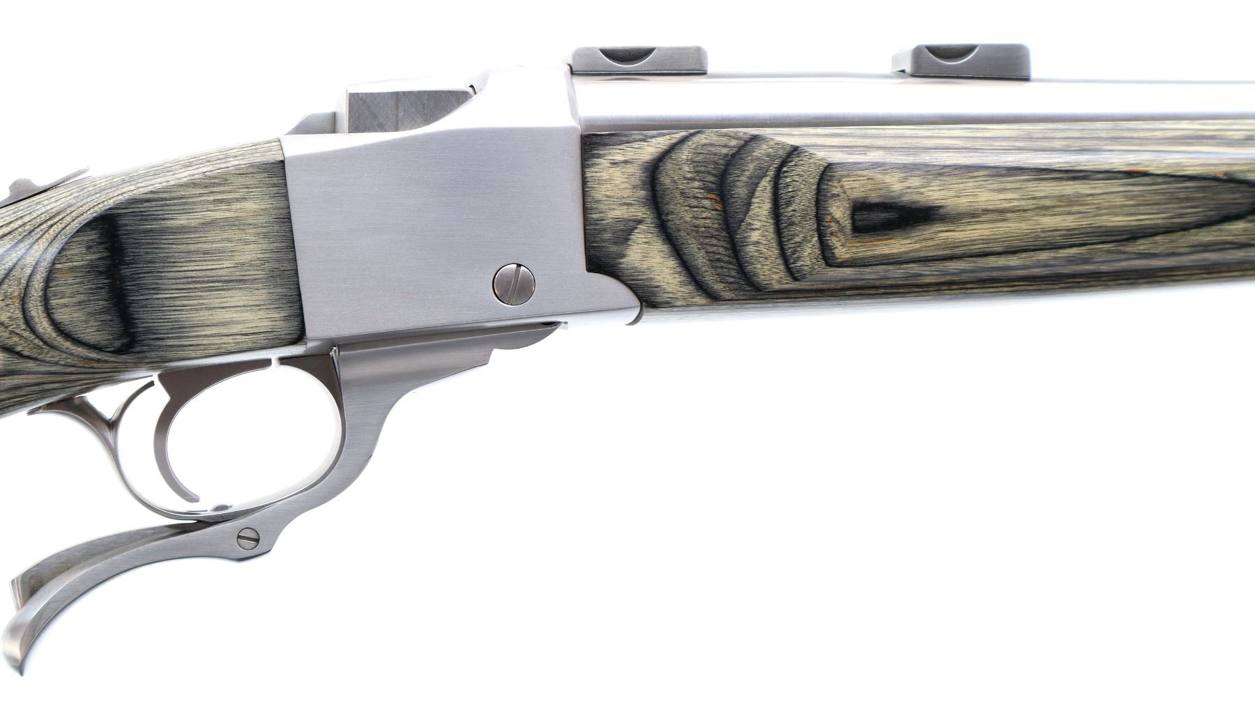 Main Description: No sights, stainless finish, heavy barrel drilled and tapped with factory bases installed, 2 holes drilled and tapped with plug screws installed behind the barrel markings, tang safety. Two piece grey laminate wood stocks, wide forearm, pistol grip, black rubber recoil pad, grip cap, swivel studs.