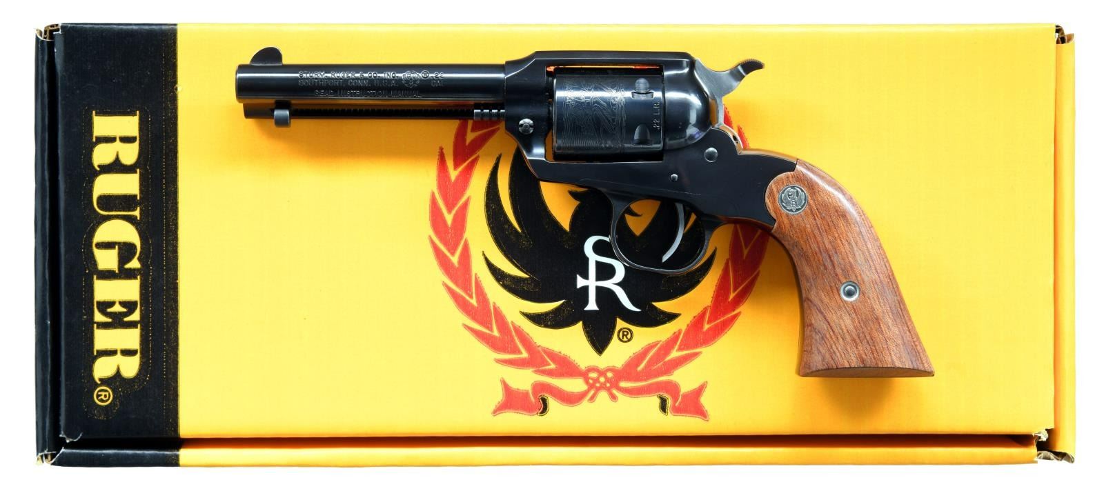 Cal. .22 LR. S# 93-00743. Bbl 4 1/8". Bearcat single action revolver manufactured by Ruger in 1993. Metal components are blued with the frame being mounted with 2 piece Ruger silver medallion smooth wood grips. Engraved bear and mountain lion on cylinder. UNATTACHED ACCESSORIES: shipping box (handwritten on the exterior to match) and factory box containing a .22 Magnum cylinder and factory paperwork. CONDITION: near excellent, with metal components retaining bountiful amounts of their original factory blue finish, showing few minor superficial marks from handling ands storage. Mirror bore, exhibiting well defined rifling throughout. Grips are very excellent. Shipping box and factory box are very good. (23-1771/MLW). MODERN. $450-650.