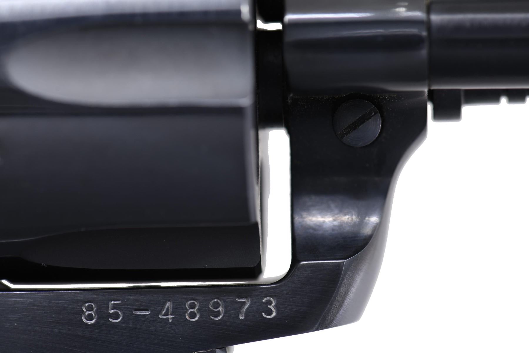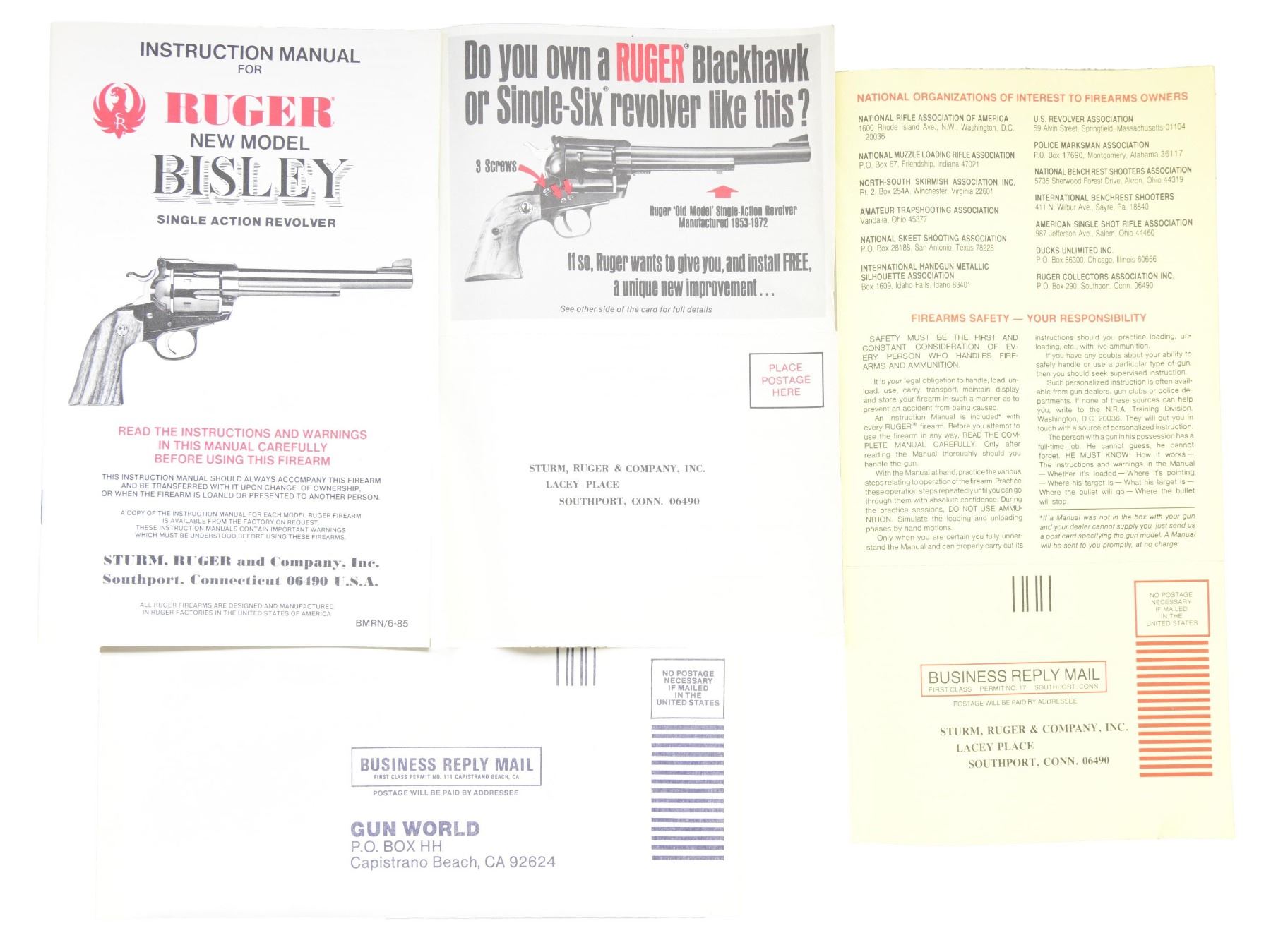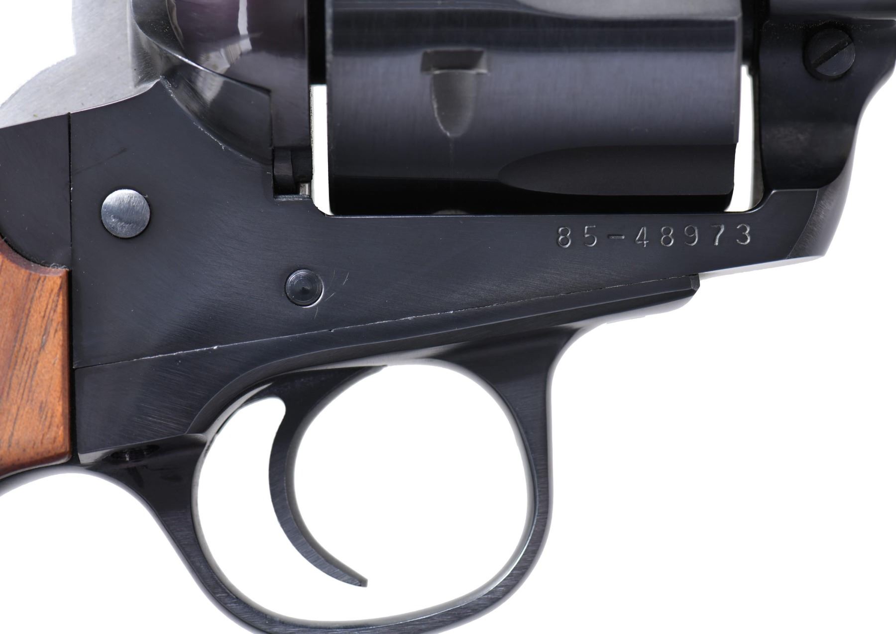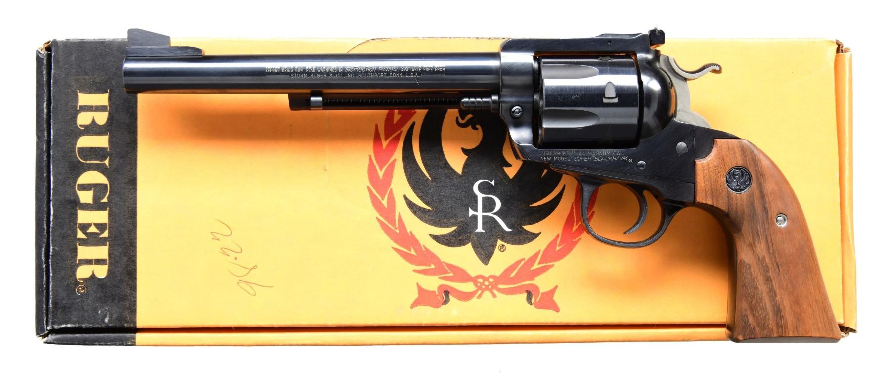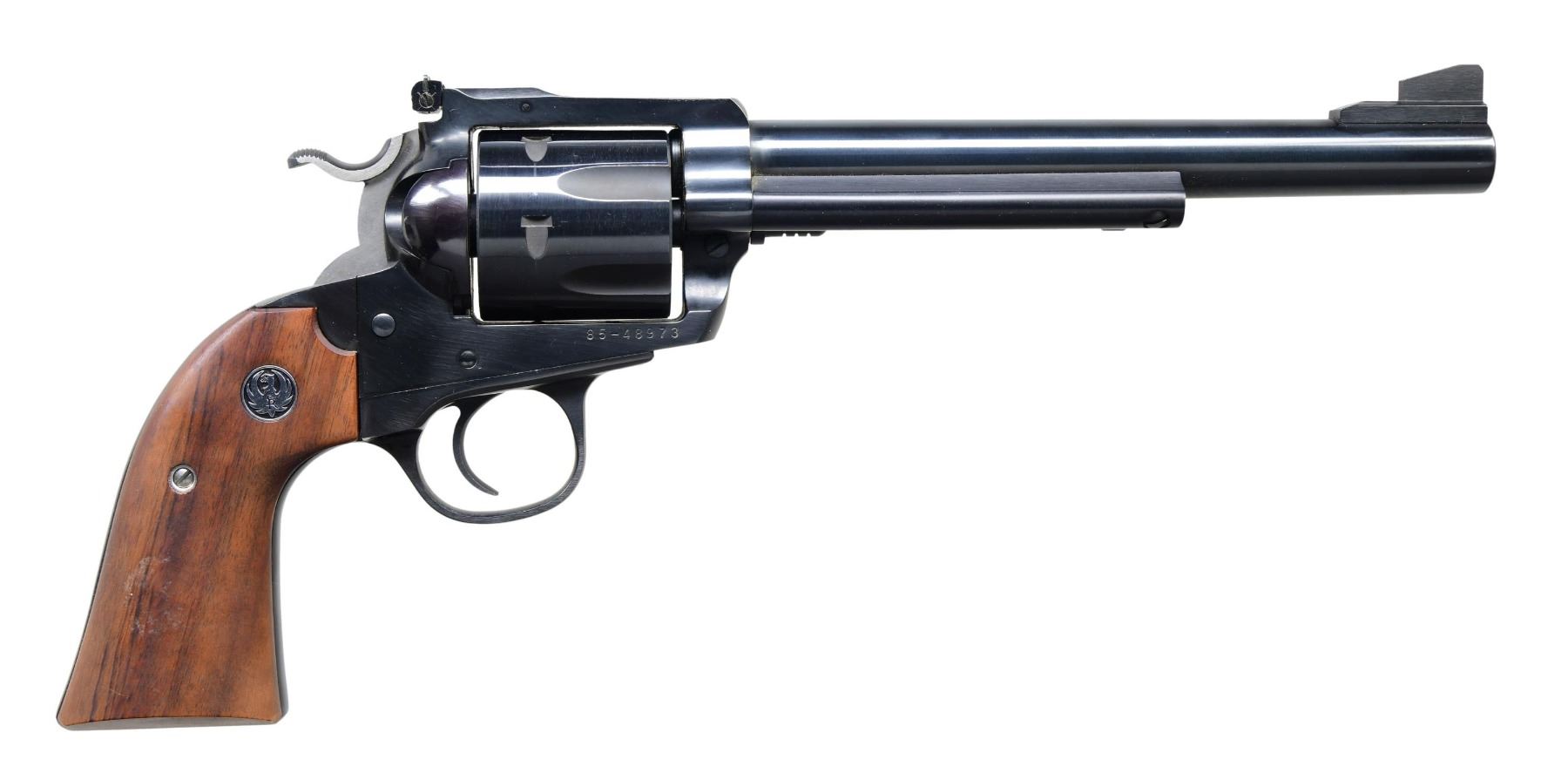 REVOLVER Cal. 44 Mag. S# 85-48973 (1985). This revolver features a blued finish. It has a 7.5-inch barrel, ramp front sight, and adjustable rear sight. The trigger is smooth, and the hammer is the Bisley-style hammer. The frame is the Ruger Bisley configuration. The cylinder holds six rounds and is fluted. The grips are smooth walnut with Ruger medallions. UNATTACHED ACCESSORIES: Factory box, instruction manual, and promotional literature. CONDITION: Overall, this revolver is in near excellent condition. The barrel retains about 95% of its original blued finish. The frame retains about 95% of its blued finish. The grips are in near excellent condition. The bore is bright with strong rifling. MODERN (23-6584/MD) $400-$600.