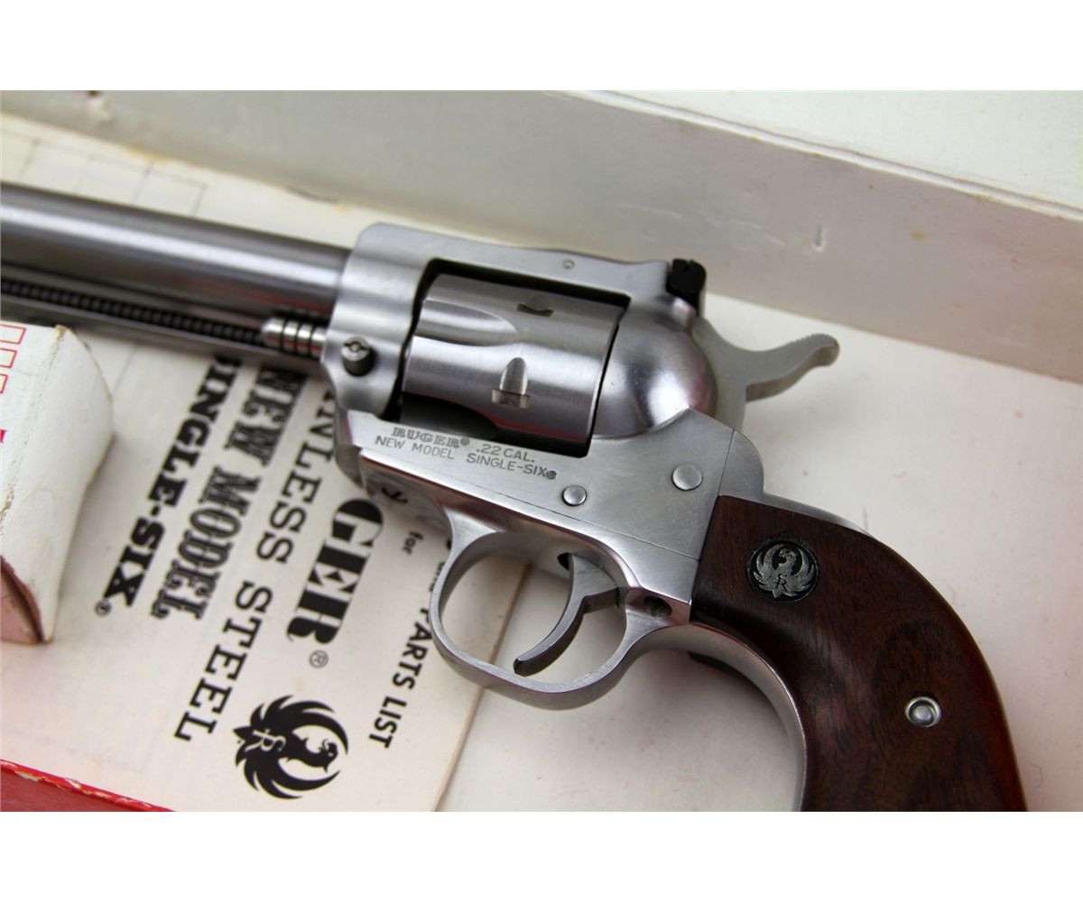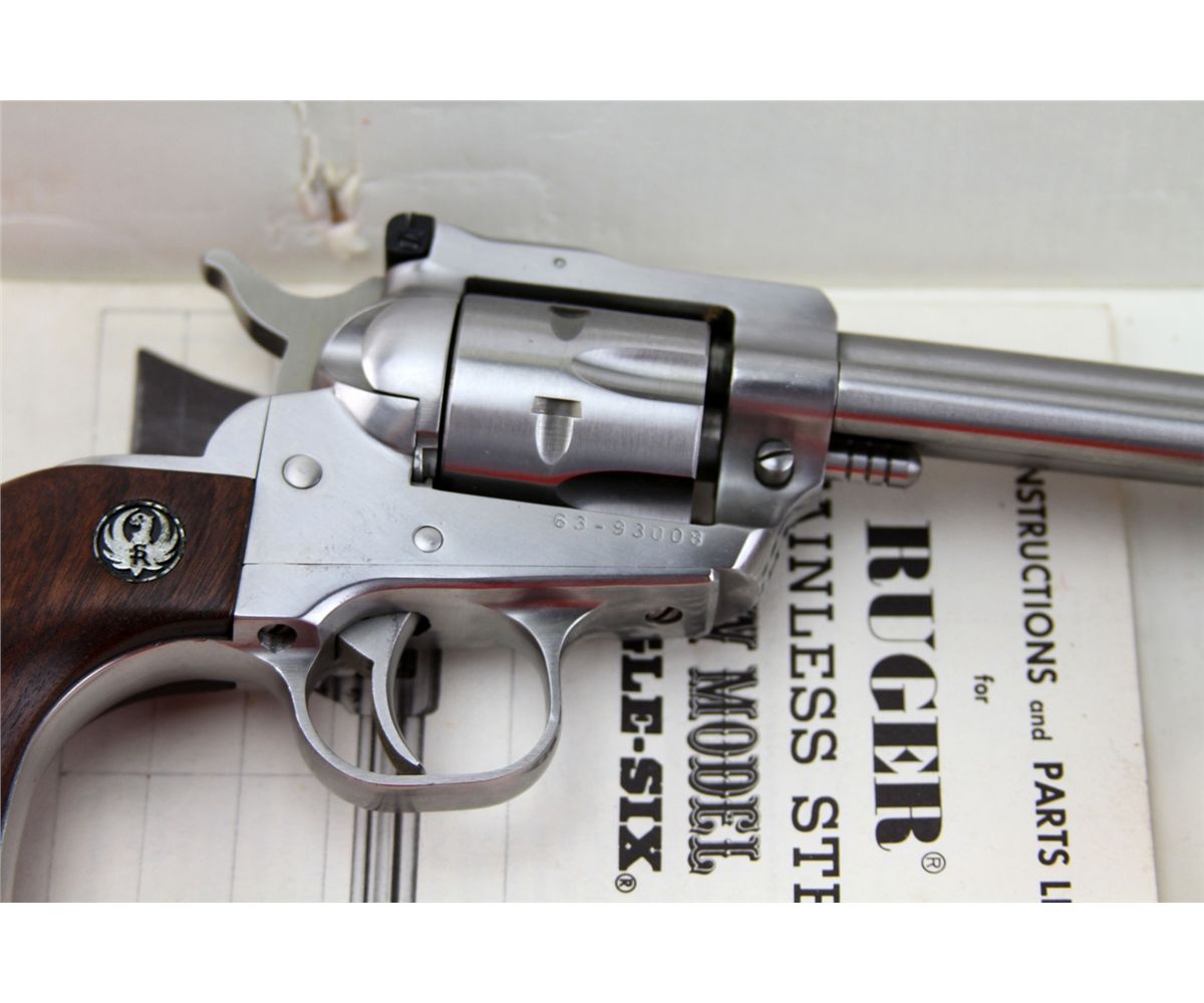 RUGER NEW MODEL SINGLE-SIX BOX WITH EXTRA CYLINDER Ruger New model single six,complete with alternate magnum cylinder, literature, and original box. Type: Revolver Manufacturer: Ruger Model: Single-Six Caliber / Gauge: .22 Serial Number: 63-93003 Condition: Excellent