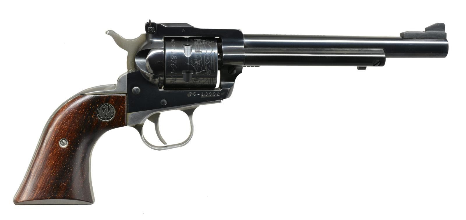 REVOLVER. Cal. 22 LR. / 22 Mag. S# 76-13992. Bbl. 6 1/2" w/ ramp mounted serrated ramp front sight & square notch adj. rear sight. Left side of bbl. marked "1876 Colorado Centennial U.S. Bicentennial 1976". 22 LR & 22 Mag. six shot rnd. cyls. have Centennial roll engraving. Blue finished bbl., cyls. & frame w/ stainless steel grip strap. Butt is marked "1876 Colorado 1976". 2 Piece rosewood grips w/ black Ruger medallions. UNATTACHED ACCESSORIES: wood presentation box w/ blue velour fitted interior containing 22 Mag. cyl. Outside of box lid has Centennial medallion. Inside of box has Ruger eagle trademark. CONDITION: over 98% original finish showing light cyl. drag lines. Near excellent bore. (21-642/DS). CURIO. $400-600.
