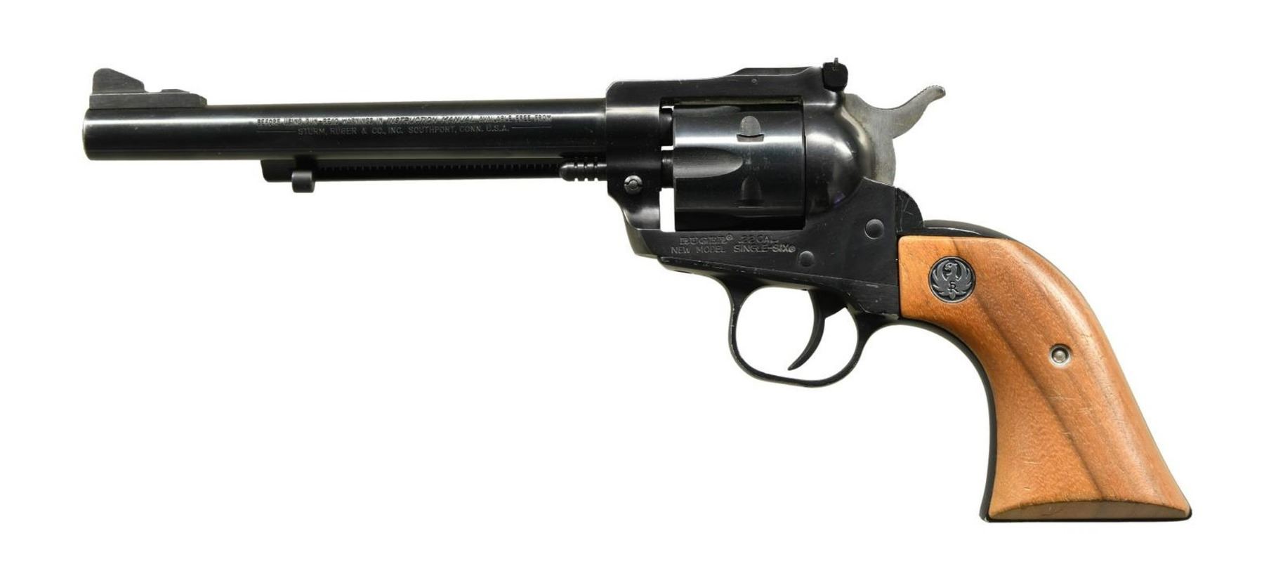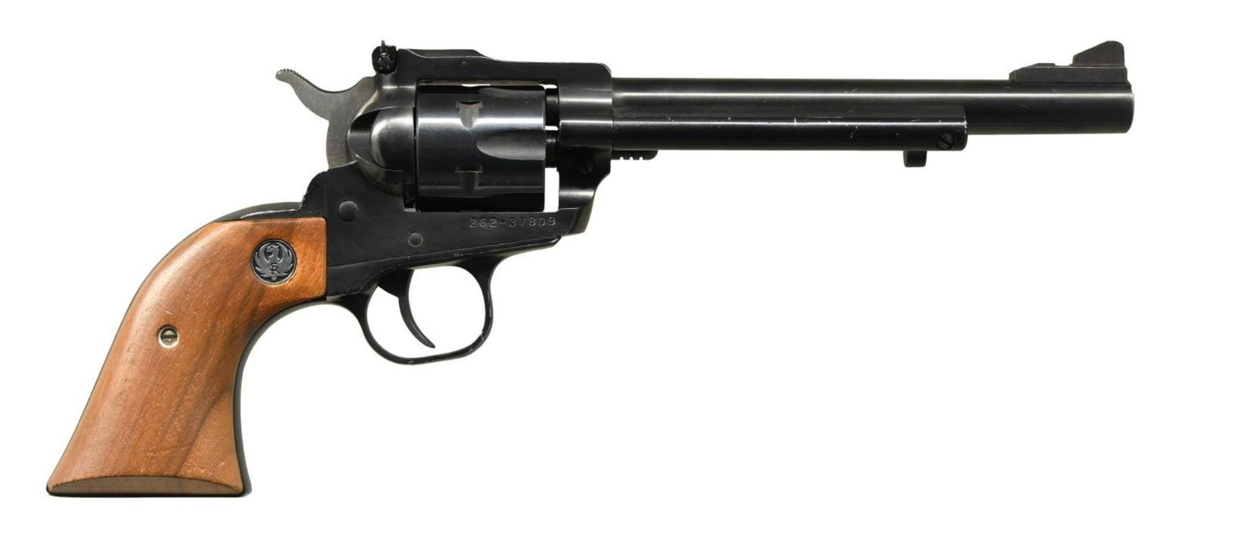 Cal. 22 LR / 22 Mag. S# 262-37809. Bbl. 6 1/2" with screw attached ramped serrated blade sight; frame mounted adjustable rear. Mfg. 1990 (1973 to date) as convertible model having fluted LR cylinder and unfluted Magnum cylinder. Blued with walnut grips having silver eagle medallions. UNATTACHED ACCESSORIES: matching numbered extra unfluted 22 Mag. cylinder. CONDITION: very good to excellent condition with slight high edge wear throughout. Installed LR cylinder is numbered "2033" for another revolver yet is only .001" too long overall (compared to proper 22 Mag. cylinder) and functions properly. Near excellent bore. (23-5243/NW). MODERN. $250-350.