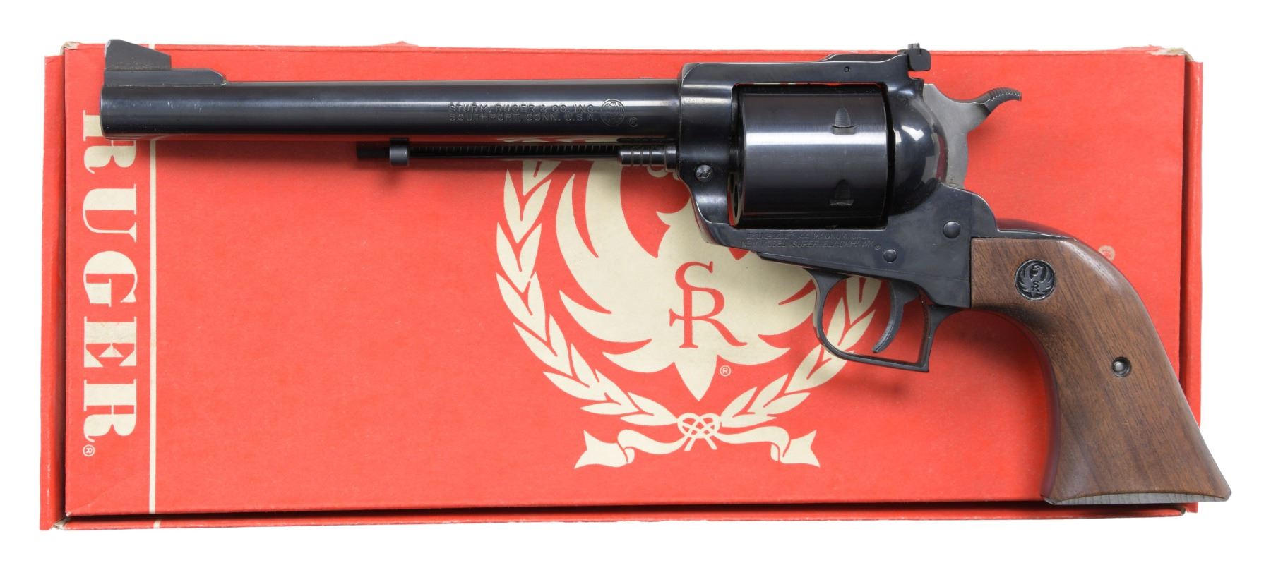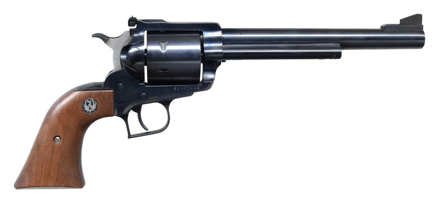 REVOLVER. Cal. .44 Mag. S# 81-77603. Manufactured by Sturm, Ruger & Co. from 1973 to present. Features a blued finish. Barrel length is 7.5 inches. The front sight is a ramped blade and the rear sight is an adjustable notch. It has a standard trigger and a spurred hammer. The cylinder is unfluted and holds six rounds. The grips are smooth walnut with Ruger medallions. UNATTACHED ACCESSORIES: very good to excellent matching numbered factory red 1 piece box with 5-76 manual. CONDITION: Overall condition is very good with approximately 95% of the original blued finish remaining on the barrel and frame. The grips show minor handling marks. The bore is bright with strong rifling. MODERN (23-6716) $350-550.