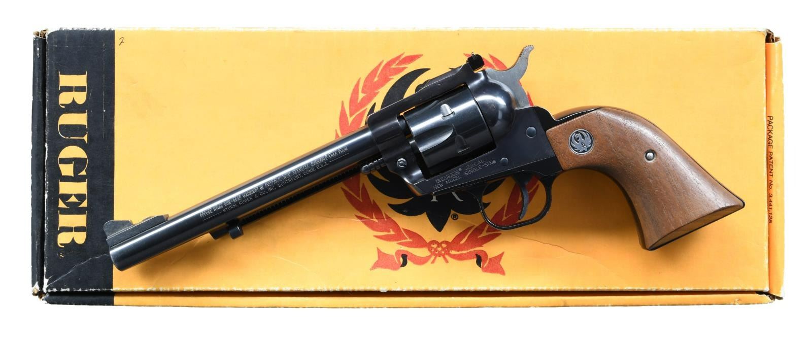 REVOLVER. Cal. 22 LR / 22 Mag. S# 261-05664. Bbl. 6 1/2" with screw attached ramped blade sight; frame mounted adjustable rear. Mfg. 1984 (1973 to date) with fluted matching numbered 22 LR cylinder without firing pin groove. Walnut grips with silver eagle medallions. UNATTACHED ACCESSORIES: original yellow and black one piece box with detached label (enclosed), matching numbered unfluted 22 Mag. cylinder, manual and cylinder box. CONDITION: very good to excellent having some occasional spots of finish loss at high points. Near excellent bore and grips. (23-1519/NW). MODERN. $350-500.
