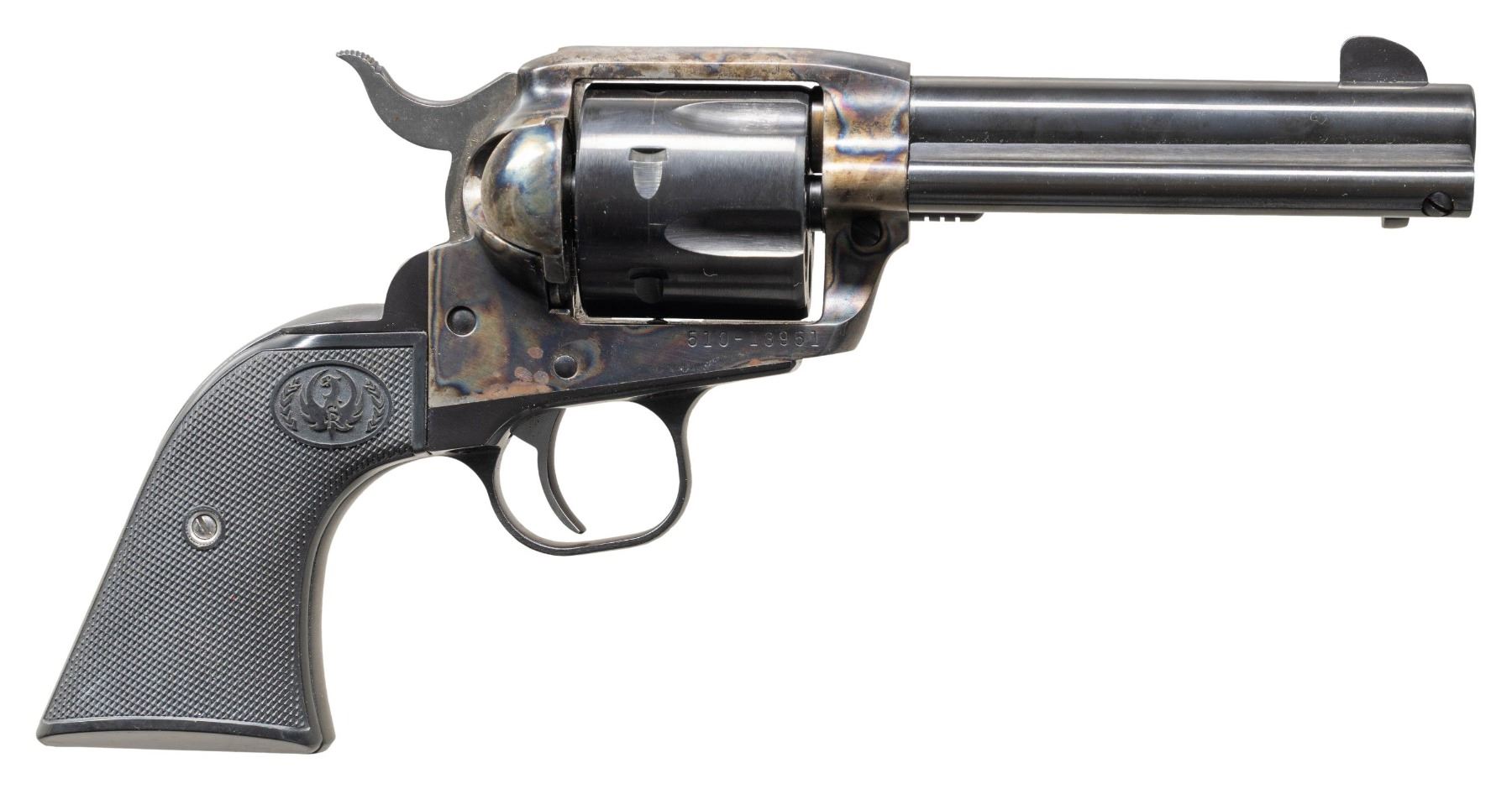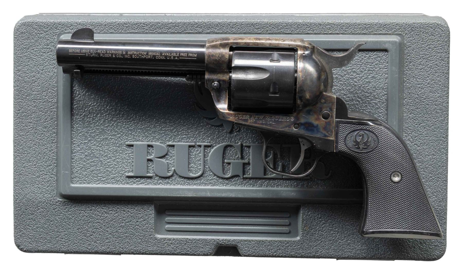 CASE. Cal. 357 Mag. S# 510-13951. Shipped 2006 as Model 05107; Catalog No. NV-34. Bbl. 4 5/8". Blade front sight. Matching numbered 6 shot cyl. Blued barrel & Case colored frame. Two piece black plastic grips. UNATTACHED ACCESSORIES: Ruger case containing manual & keys. CONDITION: very good blue & case colored finish showing handling marks, scratches & spots of oxidation throughout. Very good grips. Very good bore. (25-3656/MD). MODERN. $300-500.