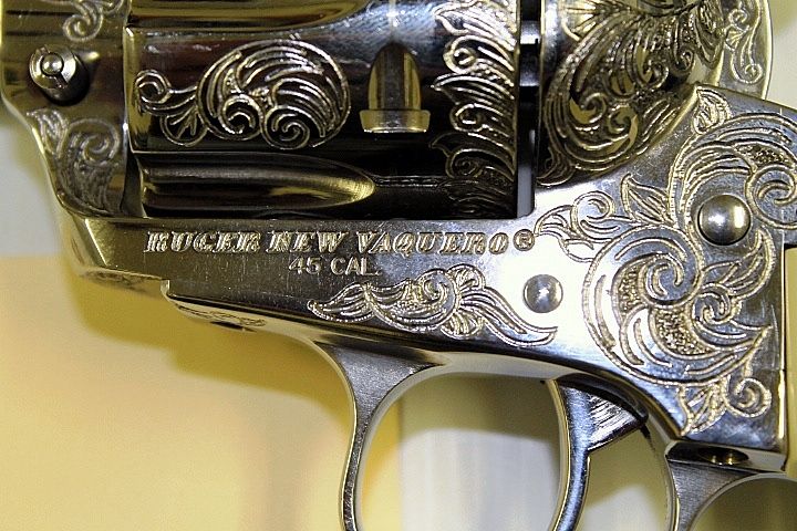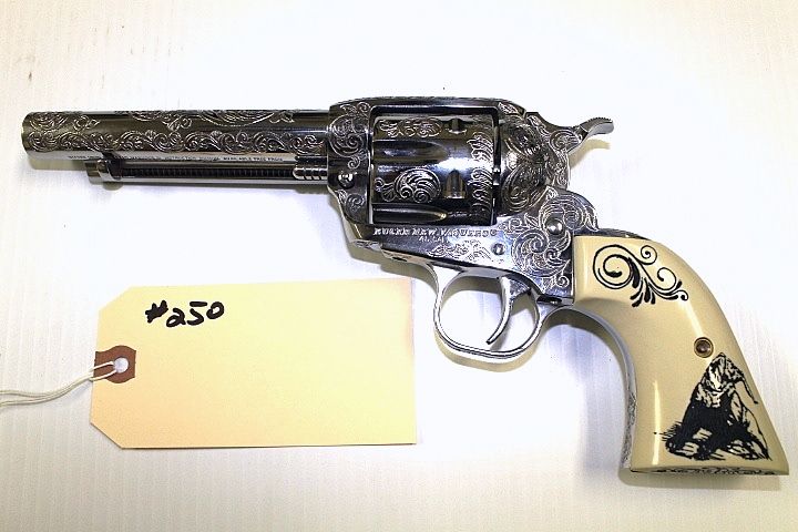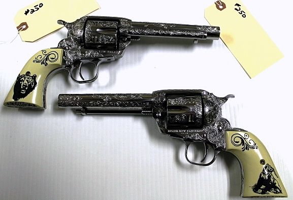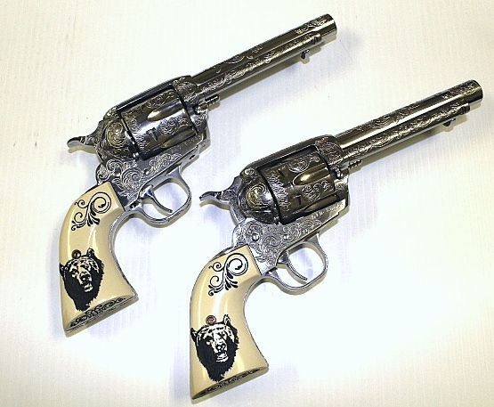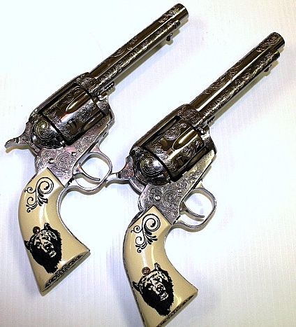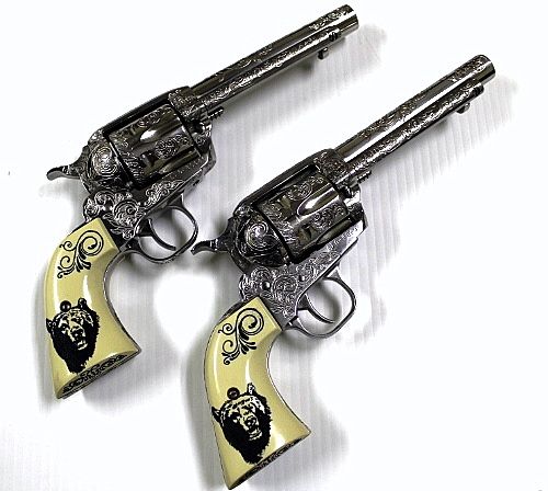 MATCHED PAIR, REVOLVERS, 45 CAL, SEQUINTIAL SERIAL NUMBERS: 510-80642 & 510-80643, 95% ENGRAVED, BEAR ON GRIPS