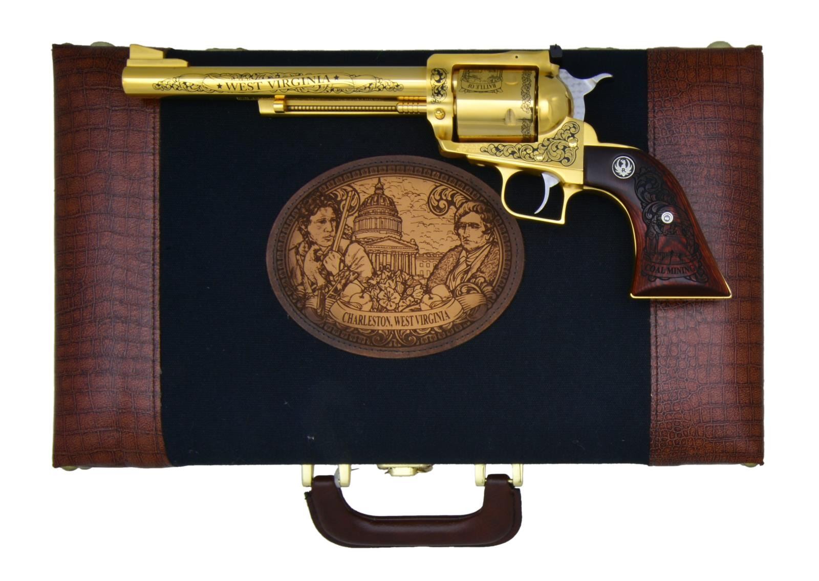 Cal. 44 Rem Mag. S# 88-61063. Bbl. 7 1/2". Gold colored plating with black colored scroll engraving highlights throughout commemorating West Virginia and is #42 of 100 mfg. Serrated ramp, fixed front sight and adjustable rear sight. Unfluted cylinder with jeweled hammer and trigger. Factory grips are marked “COAL MINING” and “DANIEL BOONE”, butt “42 OF 100” and barrel “CHARLESTOWN WEST VIRGINIA”. UNATTACHED ACCESSORIES: brass hinged lockable black and brown fitted case with red velvet interior. CONDITION: all aspects near excellent with an unfired appearance. Bore is near excellent, bright and strongly rifled. (22-2934/CW). MODERN. $1,000-1,500.