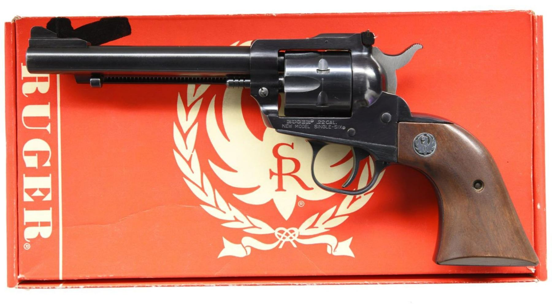 Cal. 22 LR / 22 Mag. S# 63-45334. Bbl. 5 1/2" with screw attached ramped serrated blade sight; frame mounted adjustable rear. Mfg. 1975 (1973 to date) as blued convertible NR5 without "warning" marks on barrel; warnings initiated 1977. Walnut grips with silver eagle medallions. Matching electro pencil numbered cylinders. UNATTACHED ACCESSORIES: red 1 piece factory box having small area of black marker on lid to hide prior writing. Factory packaging to include boxed (missing end flap tab) fluted 22 Mag. cylinder. Shipping sleeve with user pen marking plus normal factory markings; both items matching numbered. CONDITION: about near excellent overall with occasional very small marks and hint of thinning at muzzle along with light turn line. (23-6052/NW). MODERN. $300-400.