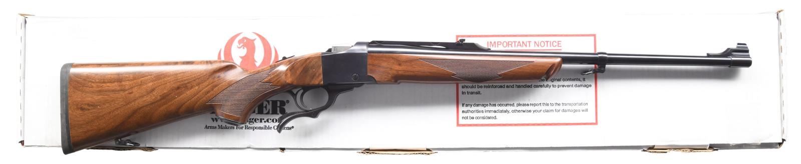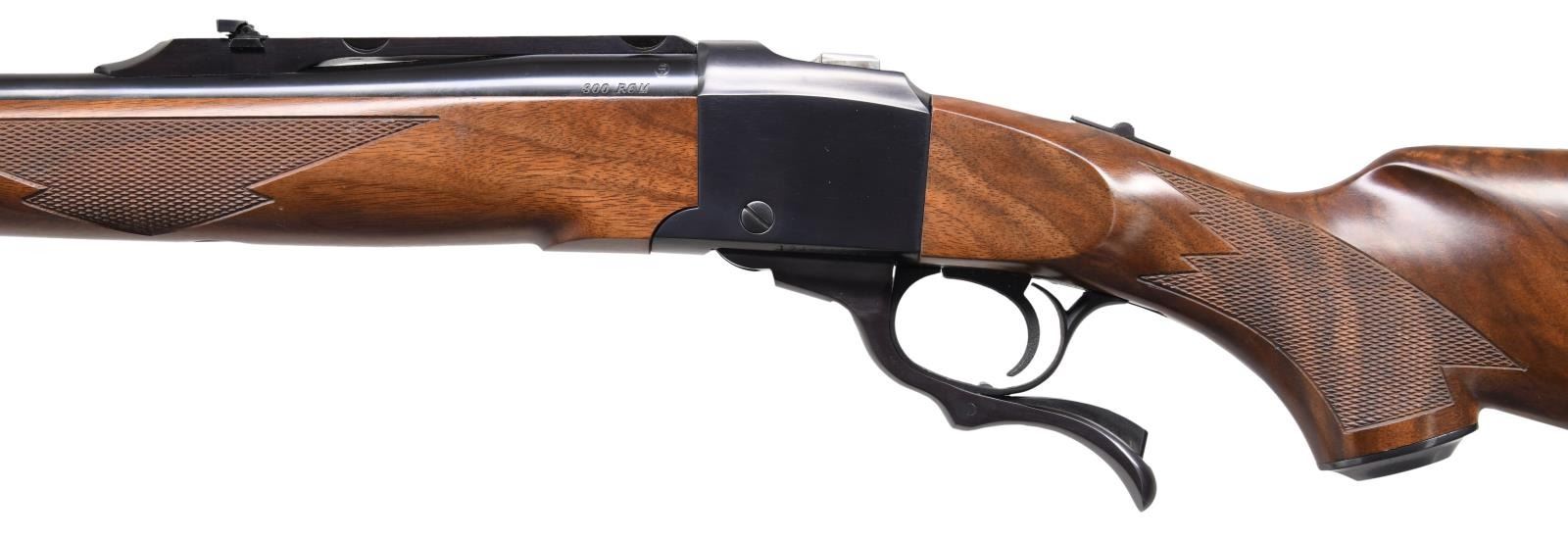 Cal. 300 RCM. S# 134-31519. Bbl. 20" lightweight with ramp-mounted bead front sight & folding leaf rear sight on quarter rib. Alexander Henry forearm and steel-capped pistol grip stock of fancy walnut with cut checkering, sling swivels, & solid black pad. 300 RCM was mfg. 2009–2012 exclusively. UNATTACHED ACCESSORIES: original box with matching label. Box contains instructions, a registration card, special offer card, NRA advertisement, a red Ruger tag, & trigger lock. CONDITION: over 98% blue. Wood shows several scratches & marks. Near-excellent bore. (23-6751/DS). MODERN. $1,000-1,500.
