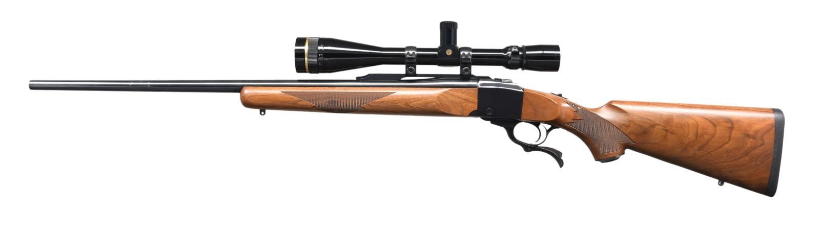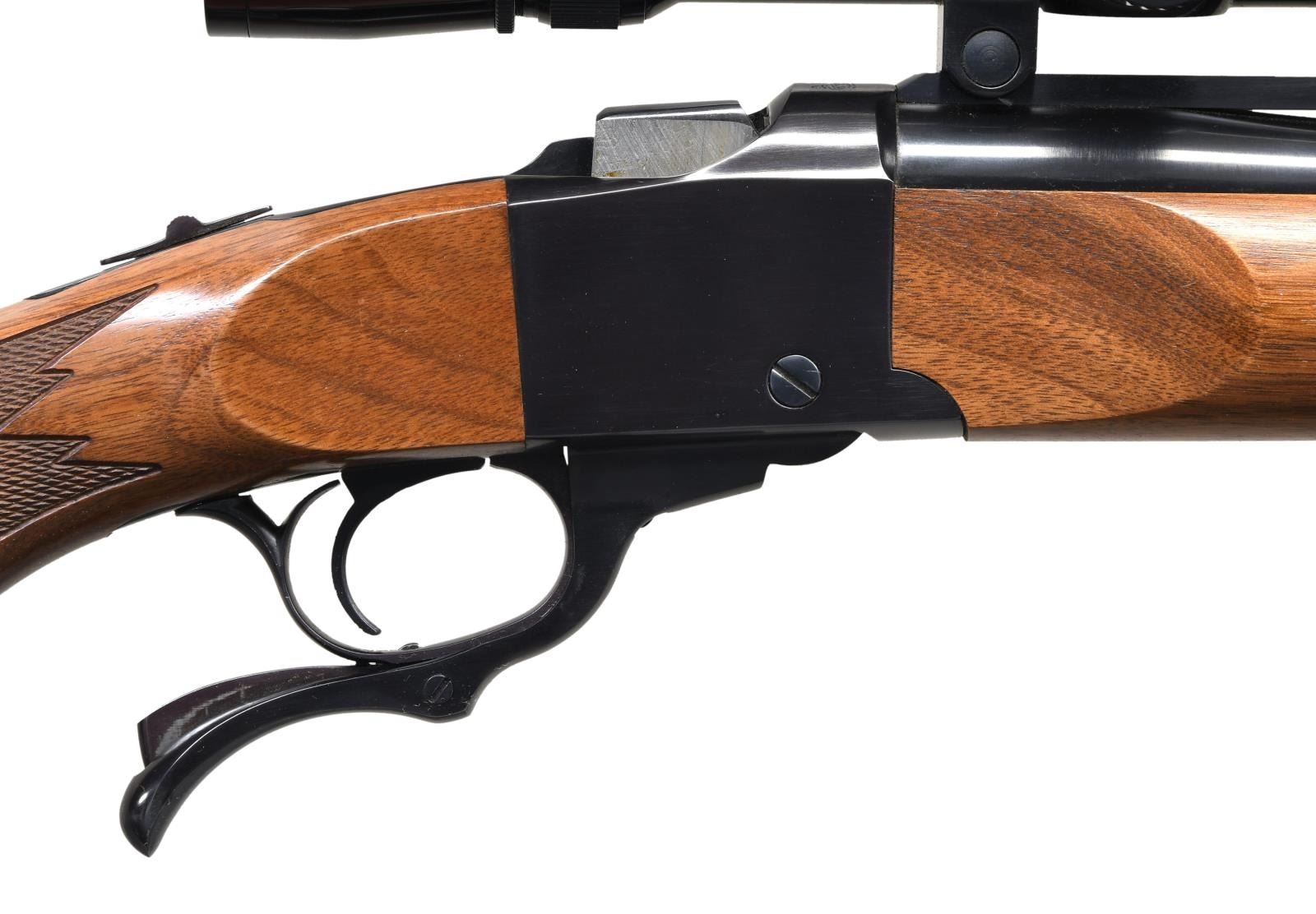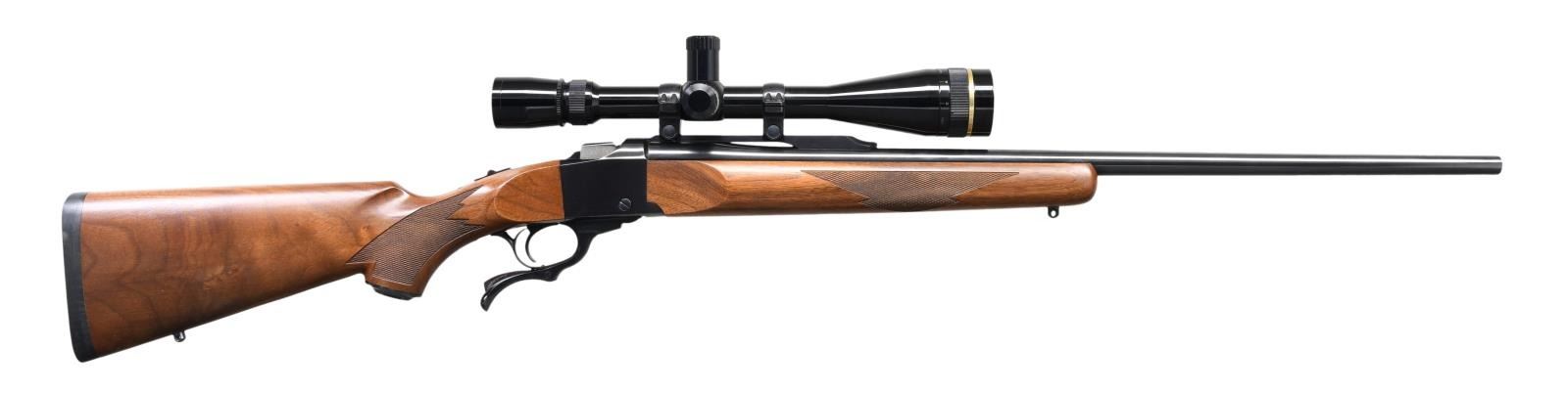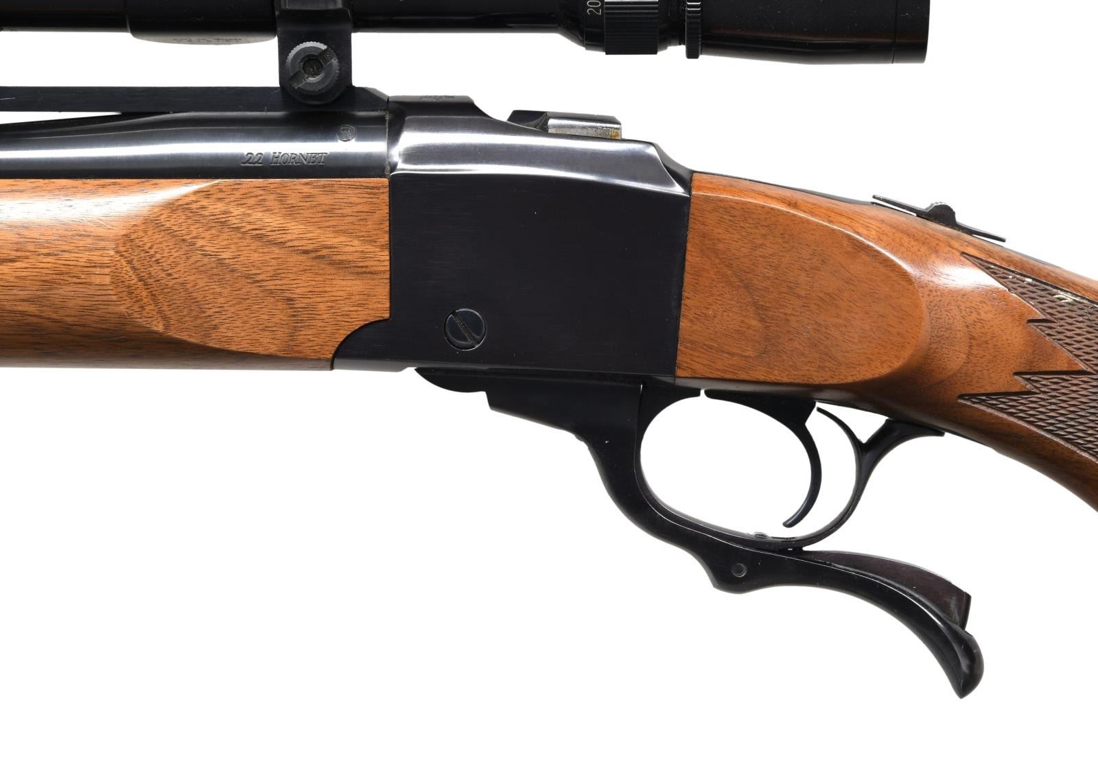 Cal. 22 Hornet. S# 133-29371. Bbl. 26" with a quarter rib. Leopold Vari-X III 6.5x20 E.F.R. gloss finished scope with duplex reticle on Ruger rings. Blue finish. Semi-beavertail forearm and capped pistol grip stock of nicely grained walnut with cut checkering, swivel bases, and black pad. Mfg. 1996. CONDITION: 97% blue, showing small spots of light pitting on the bbl. Stocks have a very good finish. Bright, near-excellent bore. Scope has bright optics. (23-6357/DS). MODERN. $1,200-1,700.
