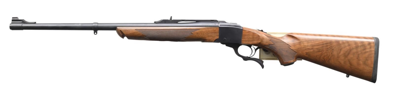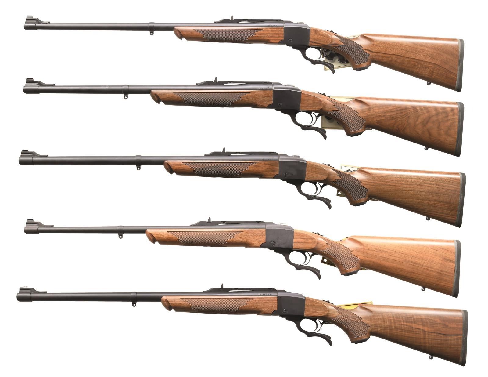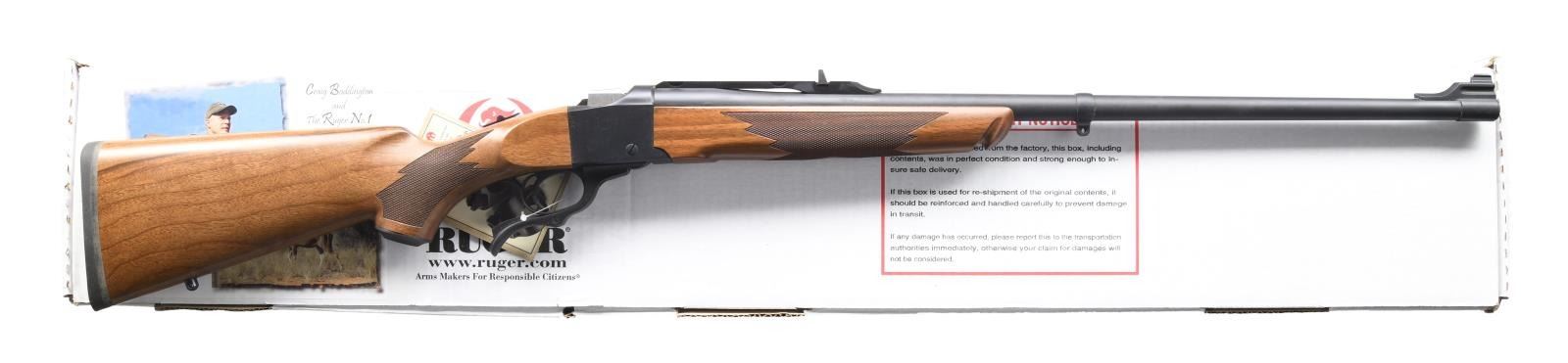 SERIES 5 RIFLE SET. Well-known outdoor writer Craig Boddington collaborated with firearms distributor Lipsey's to produce a special series of number one rifles. This limited five gun set is chambered in optimal calibers for hunting African species. Only 250 sets were produced having the same serial number on each rifle with a different prefix. Features include matte blue finish, Band mounted white bead front sights with standing V notch rear sights on quarter ribs for Ruger rings. All have Alexander Henry forearms & capped pistol grip stocks of fine Circassian walnut, cut checkering, swivel bases, steel grip caps and solid black pads. 1) No. 1-S-KUDU. Cal. 300 H&H magnum. S# CB3-00131. Bbl. 26" with 1 in 10" twist. CATALOG WEIGHT: 8 lbs. (23-6478/DS). 2) No. 1-S-LION. Cal. 375 Ruger. S# CB1-00131. Bbl. 22" with 1 in 12" twist. CATALOG WEIGHT: 7.25 lbs. (23-6479/DS). 3) No. 1-H-BUFFALO. Cal. 450/400 N.E. 3". S# CB2-00131. Bbl. 24" with 1 in 15" twist. CATALOG WEIGHT: 9 lbs. (23-6480/DS). 4) No. 1-A-LEOPARD. Cal. 7x57mm. S# CB4-00131. Bbl. 22" lightweight with 1 in 8.75" twist. CATALOG WEIGHT: 7 lbs. (23-6481/DS). 5) No. 1-8-ELEPHANT. Cal. 450 N.E. 3-1/4". S# CB5-00131. Bbl. 24" heavy contour with 1 in 15" twist. CATALOG WEIGHT: 7.5 lbs. (23-6482/DS). UNATTACHED ACCESSORIES: all have original boxes containing scope rings, trigger locks, instruction manuals & registration cards. Box lids have color photos of Craig Boddington & the specific African game animal. CONDITION: all as new with boxes. ALL MODERNS. $6,000-9,000.