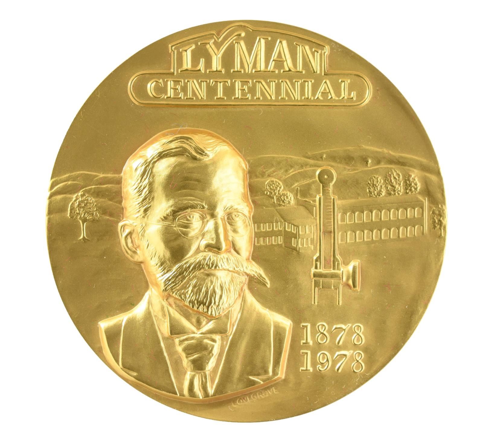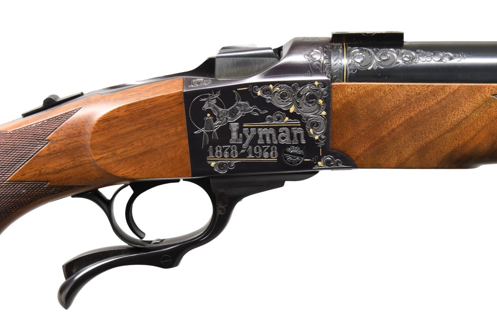 SHOT RIFLE. Cal. 45-70. S# 131-45335. Limited edition of only 101 Grade 1 and 1,000 Grade 2 rifles were mfg. in 1978 to commemorate Lyman's 100th anniversary. Bbl. 28" tapered round "D" weight with scope blocks. Right side of the receiver is marked Lyman 1878–1978 with the running buck logo. Left side is engraved "1938". Bottom of the frame has a hand-engraved issue number, "L-061". Markings are bordered by highlights of the foliate scroll that continue to the upper & lower receiver surfaces, as well as the breech & muzzle ends of the bbl. Bbl. ends have gold bands. Schnable-tipped forend and pistol grip cheekpiece stock of fancy black walnut with a satin finish. Features include a point-pattern hand-checkering steel grip cap & buttplate. UNATTACHED ACCESSORIES: housed in it's original walnut case measuring 48 1/2" x 16 3/4" x 3 1/2". Case has a fitted red velour interior. Inside lid has a presentation plaque certifying this rare rifle, signed by Lyman President J. Mace Thompson. Case contains a 34 1/2" Lyman model 1938 tube scope, brass centennial medallion, and the hardbound book "THE CENTENNIAL JOURNAL". Nickel-finished Lyman loading tool. Lyman mold handles. Lyman 4-loading die set, 1-20 rd. box of Lyman Centennial 45-70, cleaning rod, & case key. CONDITION: near excellent & unused, retaining virtually all original blue. Wood shows a few small handling marks. Near-excellent bore. (23-6391/DS). MODERN. $2,000-3,000.