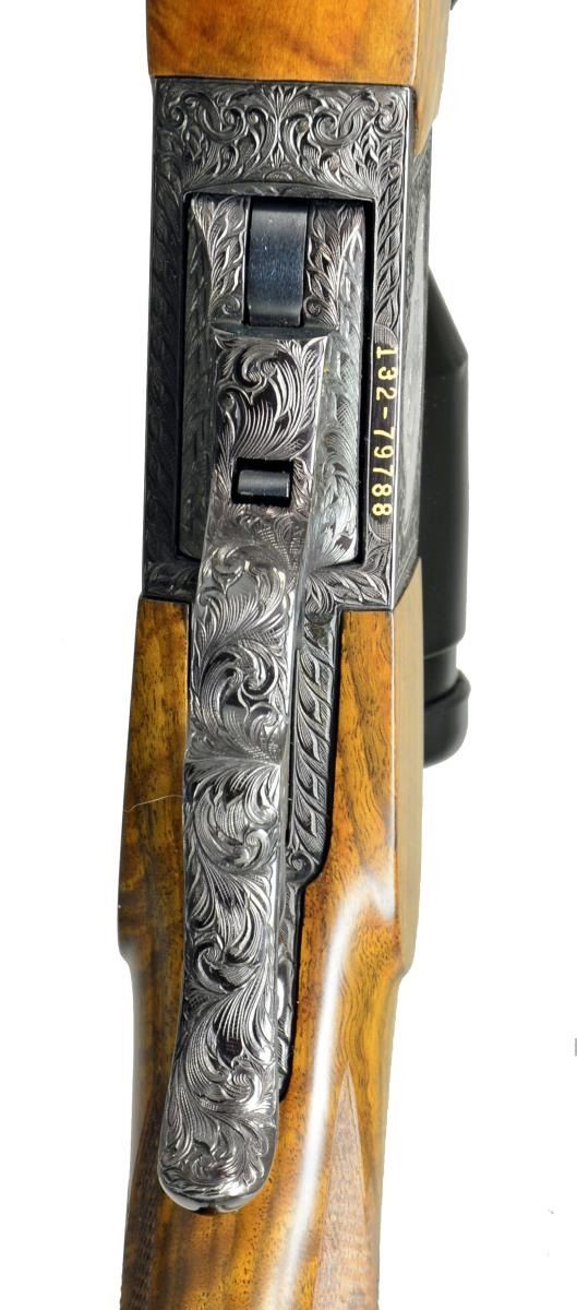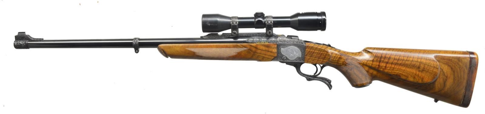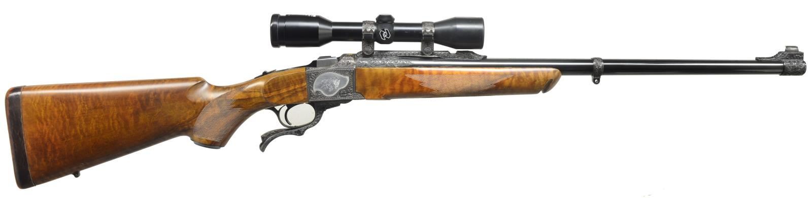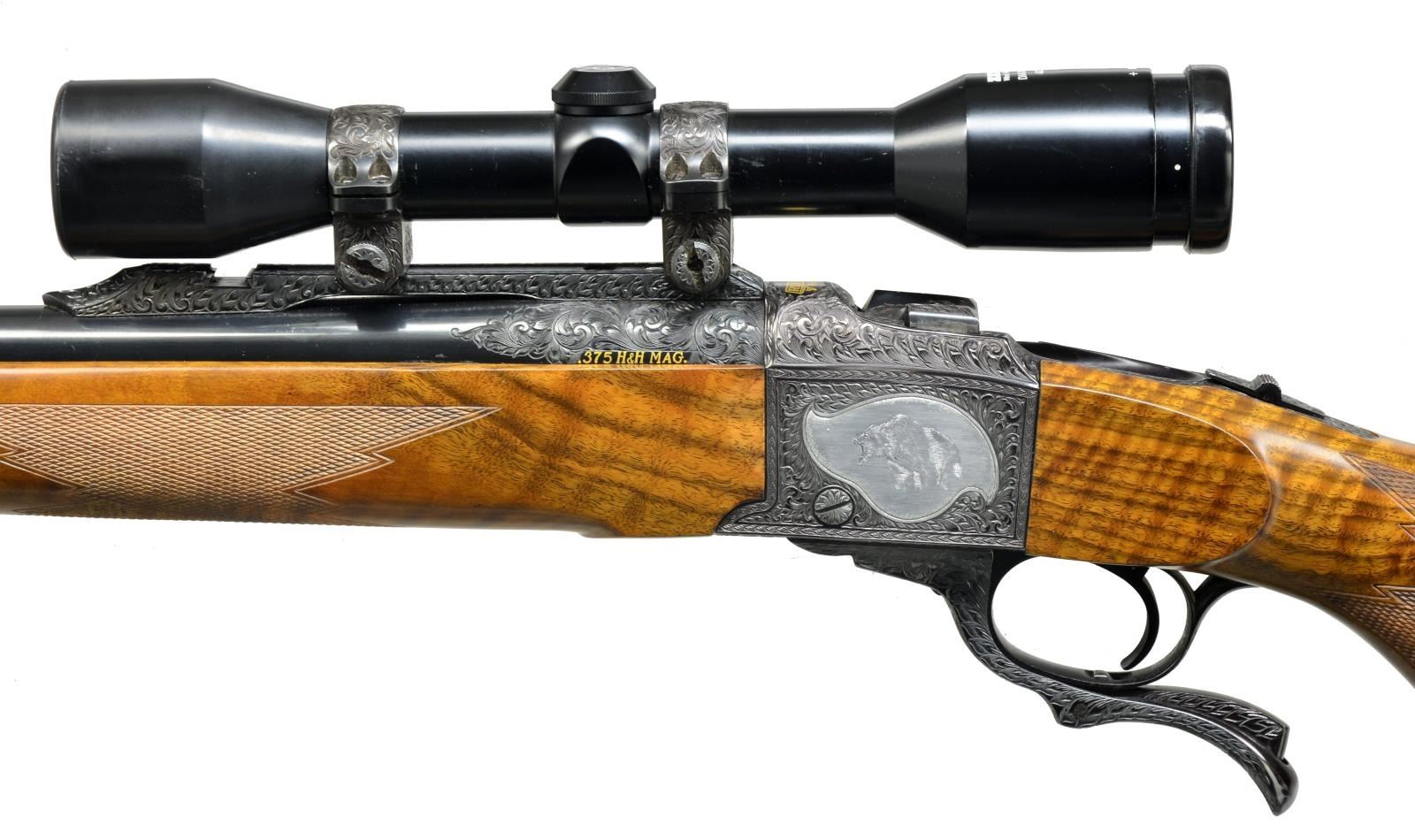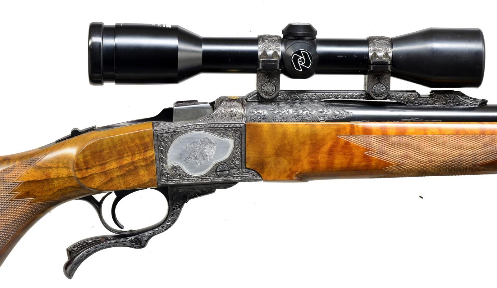 INLAY DEPICTING AMERICAN BIG GAME W/ ZEISS SCOPE. Cal. 375 H&H Mag. S# 132-79788. Bbl. 24". Medium weight factory bbl. w/ warning & Ruger information on top. Cal. is inlayed in gold at left rear, surrounded by 2 3/4" triangles of semi relief shaded scroll. Factory quarter rib, front sight ramp & bbl. band are also fully engraved w/ matching scroll. Standard action continues this theme w/ lg. scroll over receiver ring. “RUGER NO. 1" is in gold on top. Sides have more scroll w/ in feather borders which surrounds shaped, silver inlayed panels engraved w/ heavy American game animals; a snarling grizzly bear is on left & quartering buffalo bull on right. Bottom of action & operating lever are also fully engraved. S# is in gold. Custom buttstock of nicely figured American walnut, measures 14" over reddish brown leather covered pad & features right hand swept shadow line cheekpiece, steel capped pistol grip w/ point pattern checkering & a sling eye on toeline. Matching full forend, has Alexander Henry type groove at front. Rifle is fitted w/ Zeiss “Diatal-C” 4X scope w/ duplex reticle in engraved steel Ruger rings. CONDITION: very fine overall, appears to have very little use since custom finishing, retaining nearly all lustrous blue on metal parts & oil finish on stocks w/ only a few of the tiniest handling marks. Sharp, shiny bore. Scope is very fine w/ minor marks on exterior from repositioning of rings; optically clear. PROVENANCE: Collection of Alan Bradley Shepherd. (20-4004/MGM). MODERN. $3,000-5,000.