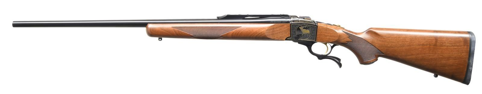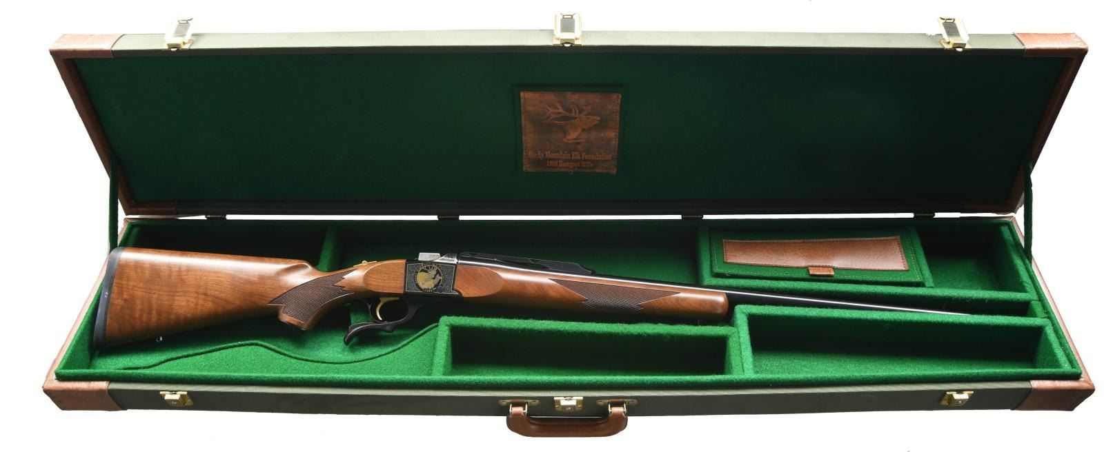 SHOT RIFLE. Cal. 270 Wby Mag. S#133-45981. Bbl. 26". No sights fitted. Scope mount present. Number 114 of only 400 No. 1 rifles made for the Rocky Mountain Elk Foundation banquet in 1998. Receiver has gold elk scenes on both sides & floral engraving w/ gold borders. Blued finish w/ gold safety & trigger. Checkered walnut stock & forend w/ factory recoil pad. Bottom mounted sling studs. UNATTACHED ACCESSORIES: green Rocky Mountain Elk foundation case w/ keys. CONDITION: all aspects near excellent. (23-362/MJC). MODERN. $900-1400.