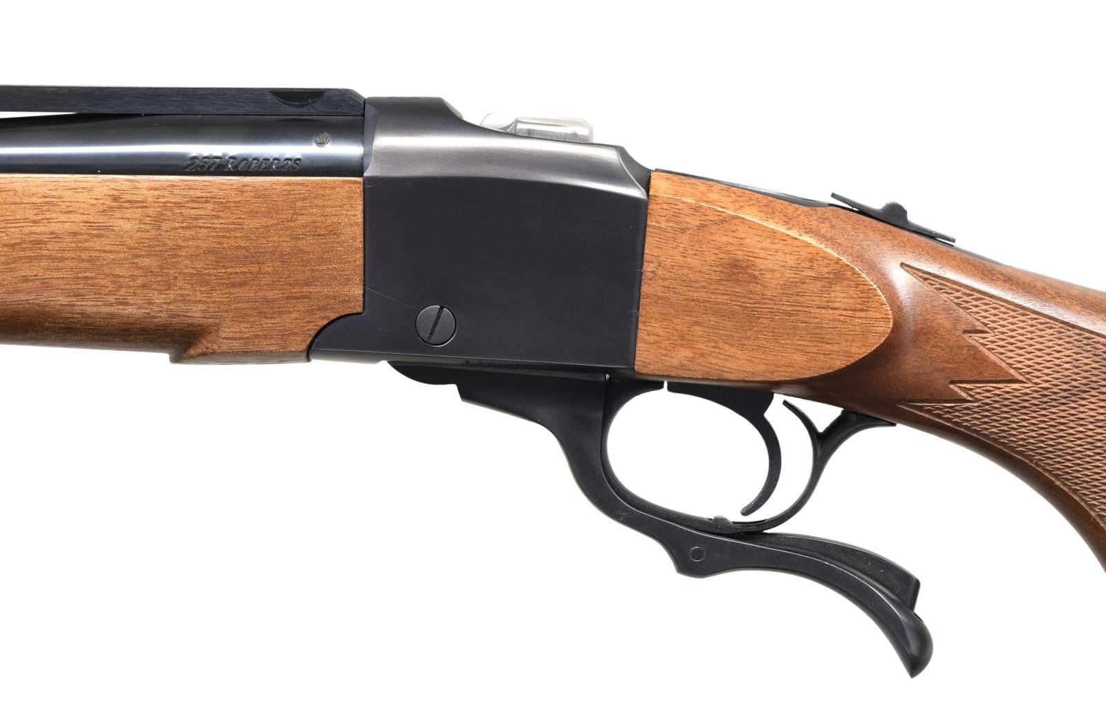 Cal. 257 Rob. S# 134-40288. Bbl. 22". Ramp-mounted bead front sight with folding leaf rear sight on quarter rib. Full-length Mannlicher style forearm and steel-cap pistol grip walnut stock with cut checkering, swivel bases, & solid black pad. Mfg. 2014. UNATTACHED ACCESSORIES: original box containing Ruger rings, sling swivels, Allen wrench, trigger lock, instructions, decal, & advertisements. CONDITION: as new. (23-6769/DS). MODERN. $800-1,200.