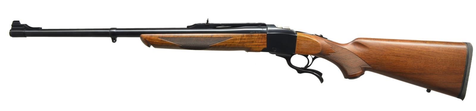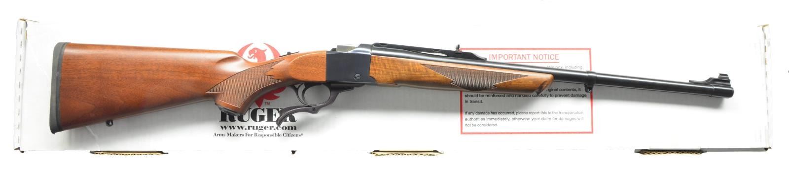 Cal. 45-70. S# 134-37841. Bbl. 22" w/ band mounted bead front sight & quarter rib mounted folding leaf rear sight. Blued falling block action w/ top tang safety. Alex Henry forearm & steel capped pistol grip stock of black walnut w/ cut checkering, solid black Ruger pad & swivel bases, front swivel base is bbl. band mounted. UNATTACHED ACCESSORIES: original box numbered to rifle containing scope rings, swivels, trigger lock, instruction manual & advertising pamphlets. CONDITION: near new retaining over 99% wood & metal finish. Bright near excellent bore. (21-570/DS). MODERN. $700-1,000.