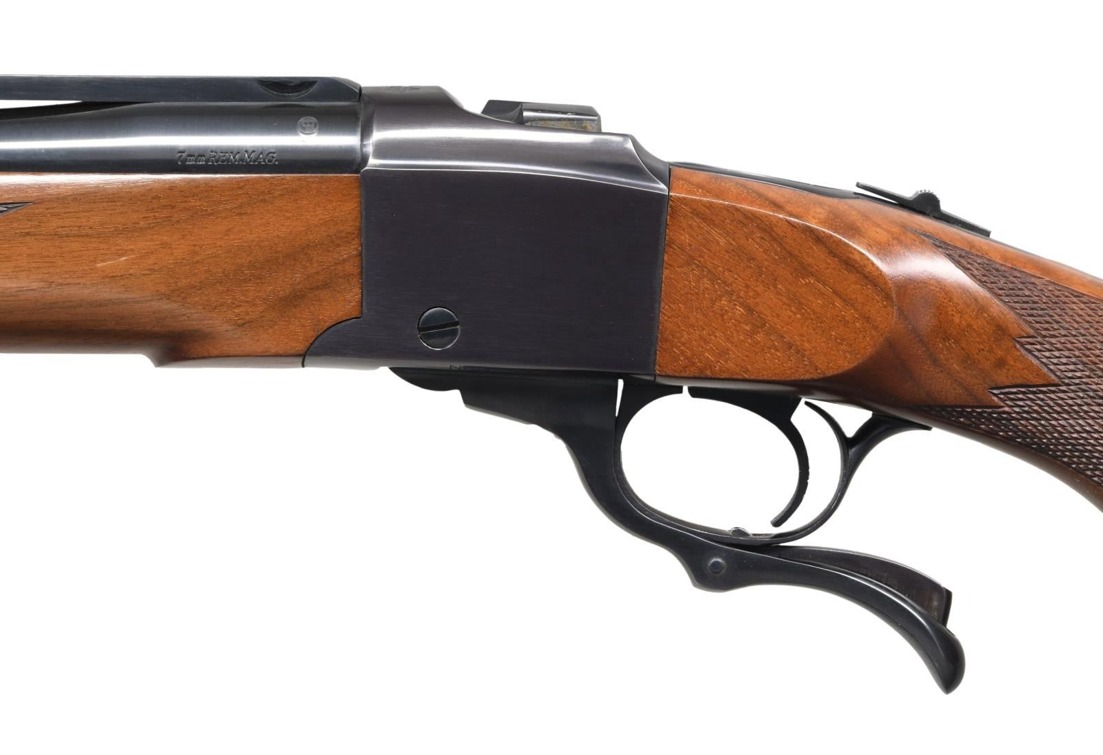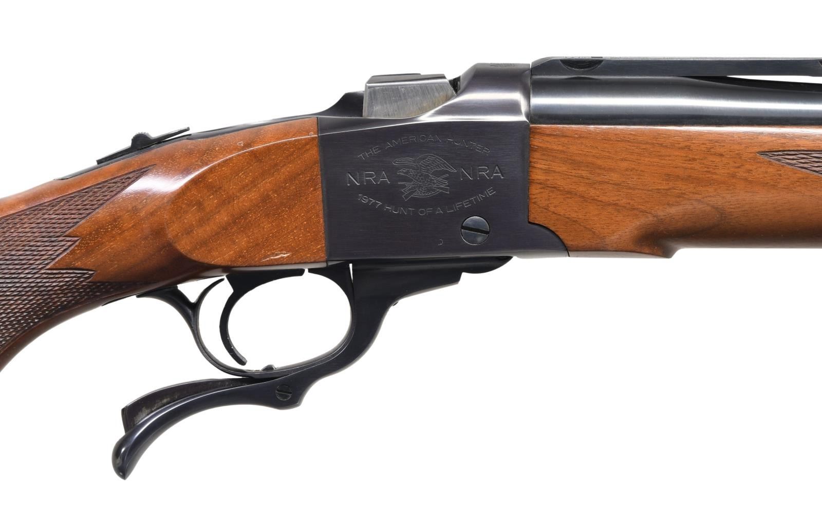 Cal. 7mm Rem Mag. S# NRA39. Bbl. 26". Band-mounted bead front sight with folding leaf rear sight on quarter rib. Right side of the action has NRA with eagle marking and the inscription "THE AMERICAN HUNTER / 1977 HUNT OF A LIFETIME". Alexander Henry forearm and capped pistol grip stock of fancy walnut with cut checkering, swivel bases, and solid red pad. CONDITION: over 98% blue. Stock finish shows a few marks. Near-excellent bore. (23-6410/DS). MODERN. $1,000-1,500.