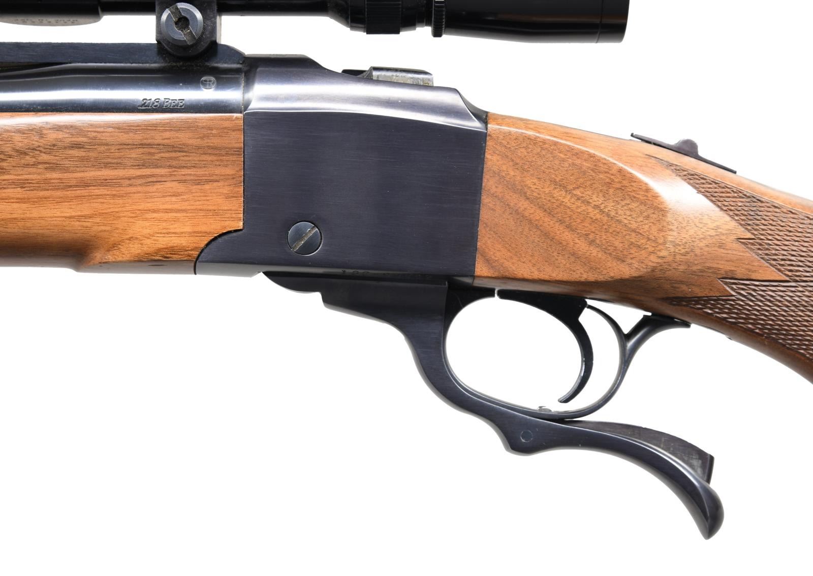 Cal. 218 Bee. S# 132-93882. Bbl. 26". Band-mounted bead front sight with folding leaf rear sight on quarter rib. Leopold Vari-X III 4.5-14x40 AO gloss finished scope with duplex reticle on Ruger rings. Alexander Henry forearm and capped pistol grip stock of fancy walnut with cut checkering, swivel bases, and solid red pad. Mfg. 1990. CONDITION: over 98% blue. Very good wood finish. Near-excellent bore. Scope has bright optics. (23-6395/DS). MODERN. $900-1,200.