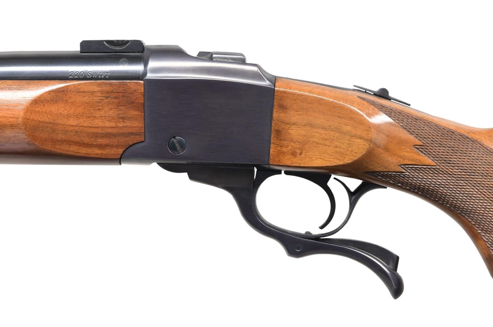 Cal. 220 Swift. S# 131-45928. Bbl. 26", heavyweight with scope blocks. Semi-beavertail forearm and capped pistol grip stock of fancy walnut with cut checkering, swivel bases, and a solid red pad. CONDITION: over 98% blue. Wood finish shows a few small scratches & marks. Near-excellent bore. (23-6379/DS). MODERN. $900-1,400.