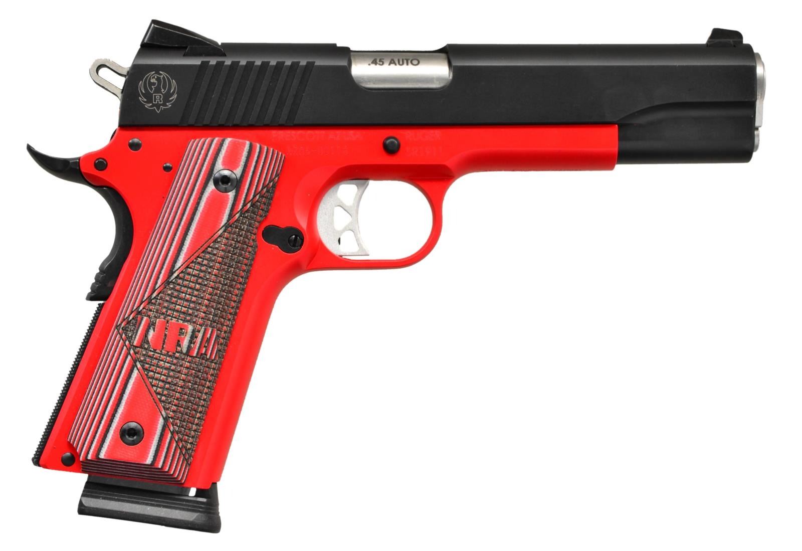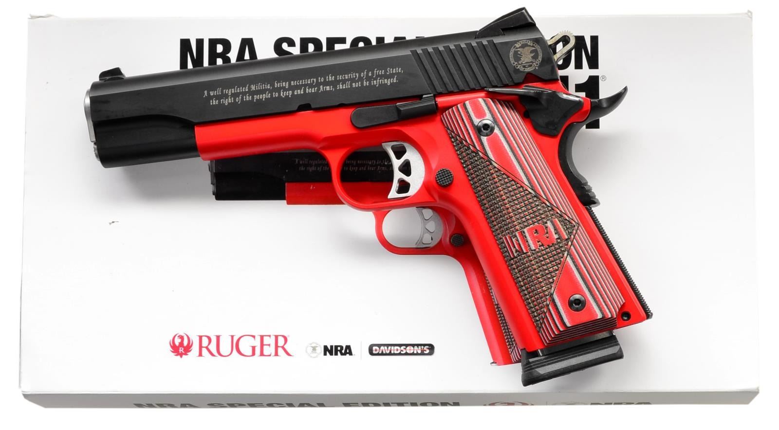 PISTOL. Cal. 45 ACP. S# NRA4-00116. Bbl. 5" throated stainless with chamber inspection port plus matching barrel bushing and spring plug. 1 of 250 limited edition from Davidsons. Mfg. 2018 (2011 to date for all SR1911's) as Model 06746 in Prescott, AZ, with distinctive vivid red Cerakoted frame plus laminated red checkered grips having NRA logo; retained by Allen head screws. Distributed exclusively by Davidson's Distributors. Standard enhanced Ruger features include an integral plunger tube, enlarged ejection port, extended magazine release, silver skeletonized trigger with overtravel adjustment, black flat checkered mainspring housing, black stylized beavertail grip safety with memory pad, skeletonized hammer, flared magazine well, and extended thumb safety. Slide is matte black with 2nd Amendment and NRA markings plus dovetailed 3-dot sight set (windage adjustable rear). MAGS: 2 factory stainless TOTAL; 8 rd. with push button black plastic bumper pad and 7 rd. with standard flat integral base drilled and tapped for bumper. UNATTACHED ACCESSORIES: matching numbered factory box with packaging plus NRA Special Edition box sleeve. CONDITION: all aspects are near excellent, appearing new and unfired. (23-6893/NW). MODERN. $800-1,200.