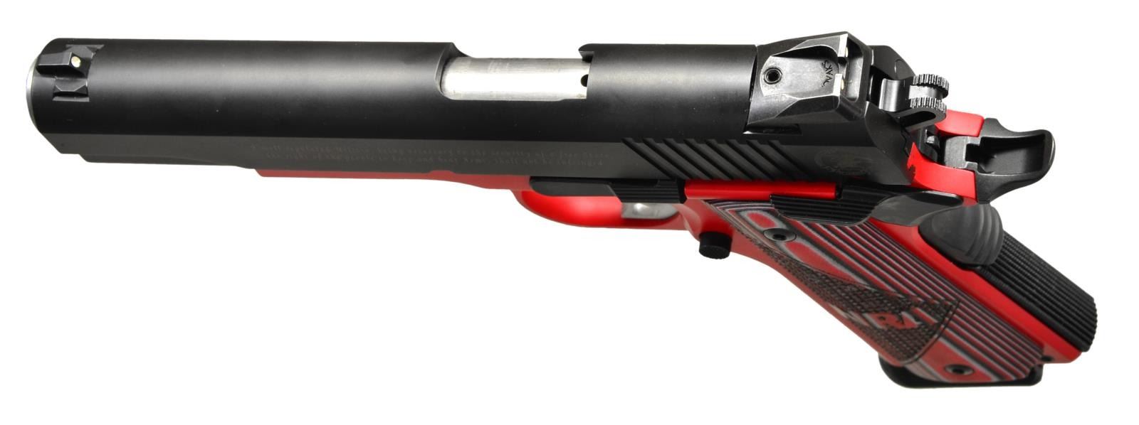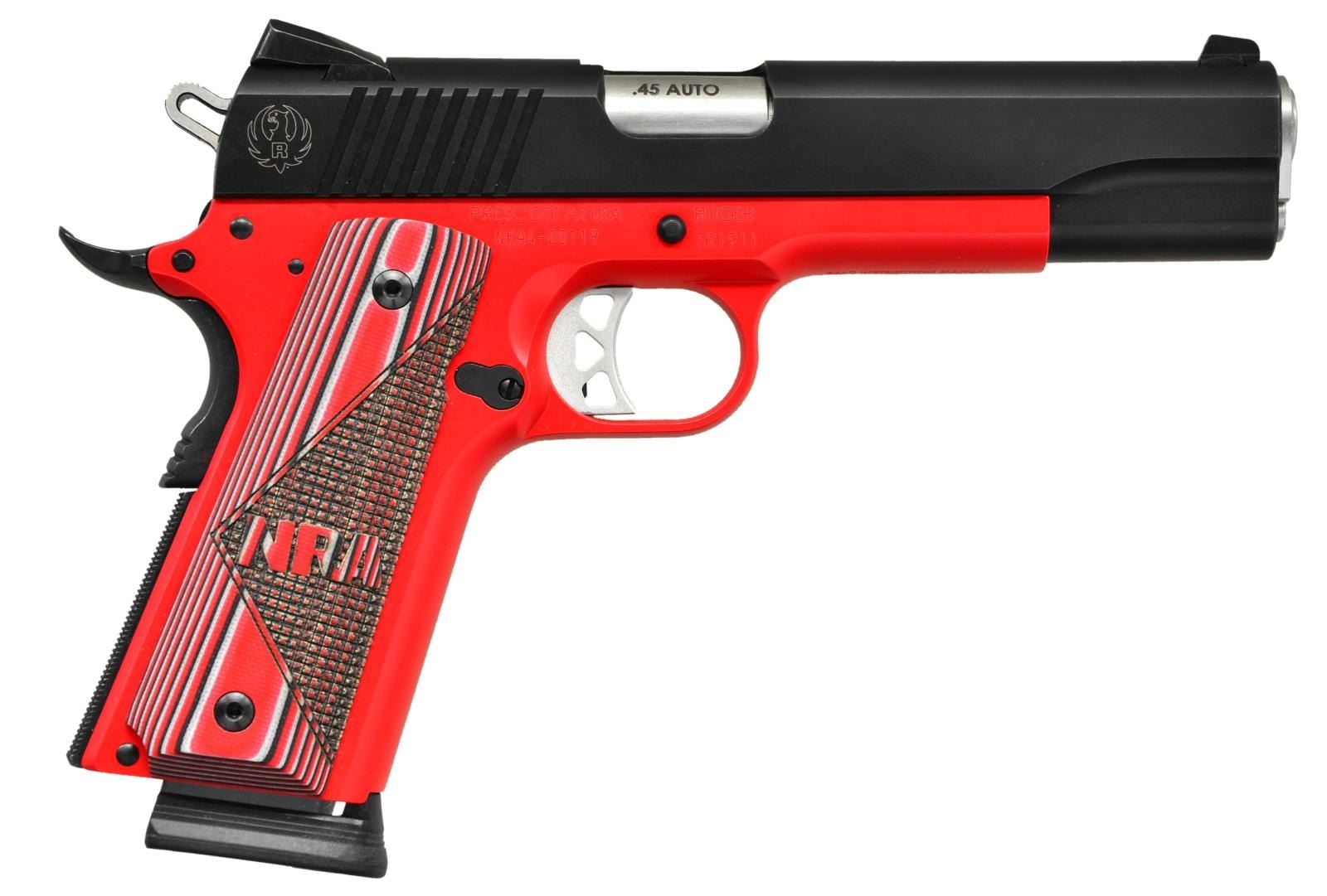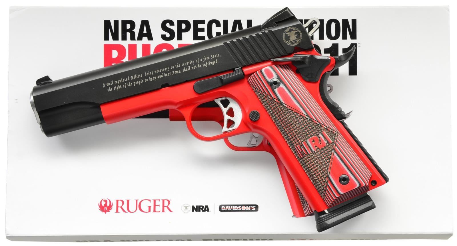 PISTOL. Cal. 45 ACP. S# NRA4-00119. Bbl. 5" throated stainless with chamber inspection port plus matching barrel bushing and spring plug. Mfg. 2018 (2011 to date for all SR1911's) as Model 06746 in Prescott, AZ, with distinctive vivid red Cerakoted frame plus laminated red checkered grips having NRA logo; retained by Allen head screws. Distributed exclusively by Davidson's Distributors. Standard enhanced Ruger features include an integral plunger tube, enlarged ejection port, extended magazine release, silver skeletonized trigger with overtravel adjustment, black flat checkered mainspring housing, black stylized beavertail grip safety with memory pad, skeletonized hammer, flared magazine well, and extended thumb safety. Slide is matte black with 2nd Amendment and NRA markings plus dovetailed 3-dot sight set (windage adjustable rear). MAGS: 2 factory stainless TOTAL; 8 rd. with push button black plastic bumper pad and 7 rd. with standard flat integral base drilled and tapped for bumper. UNATTACHED ACCESSORIES: matching numbered factory box with packaging plus NRA Special Edition box sleeve. CONDITION: all aspects are near excellent, appearing new and unfired. (23-6929/NW). MODERN. $800-1,200.