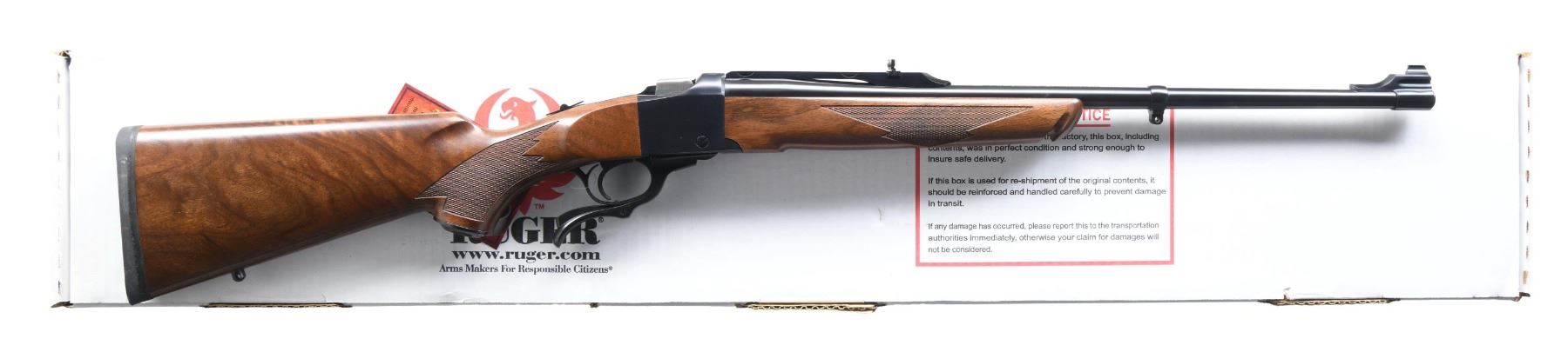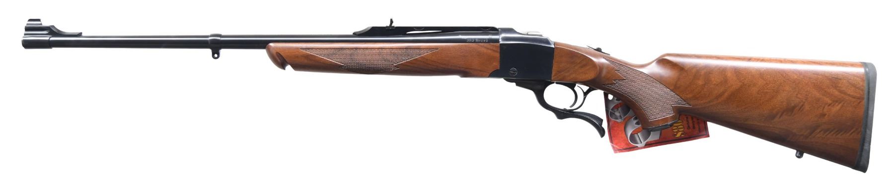 Cal. 204 Ruger. S# 134-35969. Bbl. 22" with banded user changeable brass bead front sight plus folding leaf rear on factory quarter rib machined for Ruger scope rings. Mfg. 2011 as Model 11314 having checkered walnut stock set (Alex Henry forend), grip cap, sling studs and black rubber pad. UNATTACHED ACCESSORIES: matching numbered factory box with packaging to include 1" factory scope rings. CONDITION: all aspects near excellent with new, unfired appearance. (24-3524/NW). MODERN. $800-1,200.