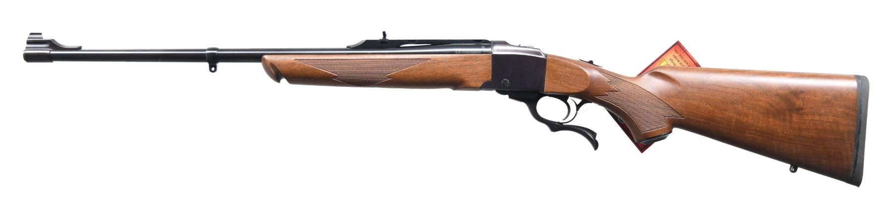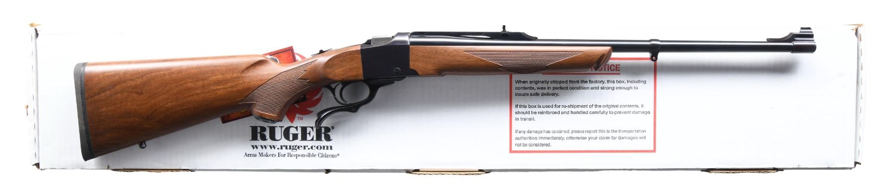 Cal. 6.5 Creedmoor. S# 134-33258. Bbl. 22" with banded user changeable brass bead front sight plus folding leaf rear on factory quarter rib machined for Ruger scope rings. Mfg. 2011 as Model 11356 having checkered walnut stock set (Alex Henry forend), grip cap, sling studs and black rubber pad. UNATTACHED ACCESSORIES: matching numbered factory box with packaging to include 1" factory scope rings. CONDITION: all aspects near excellent with new, unfired appearance. (24-3643/NW). MODERN. $800-1,200.