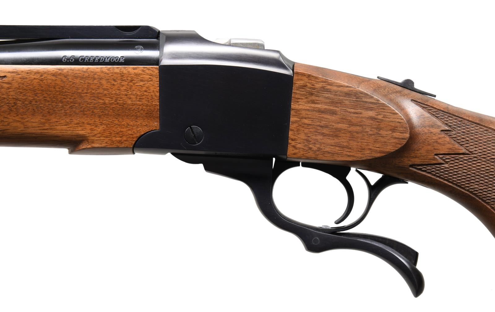 Cal. 6.5 Creedmoor. S# 134-52543. Bbl. 24" hammer forged with barrel band sling base. Mfg. 2018 (1967 to date) as Lipsey's distributor-exclusive Model 21319 with a blued finish. Walnut Alexander Henry stock set has checkered panels, a grip cap, sling studs, and a red rubber butt pad. Factory-installed quarter rib milled to accept Ruger scope rings. UNATTACHED ACCESSORIES: original factory box and packaging to include Ruger scope rings. CONDITION: all aspects are near excellent; appears new and unfired. (23-6384/NW). MODERN. $1,000-1,500.