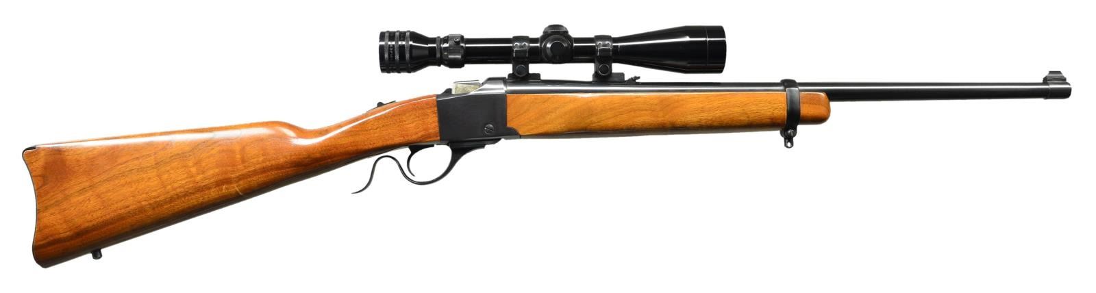 Cal. 30-40 Krag. S# 130-53039. Bbl. 22" w/ band style sight base having bead front sight plus corresponding folding leaf rear. Mfg. 1974 w/out "warning markings" on bbl. Plain straight grip walnut stock set having alloy carbine buttplate & added Uncle Mike's sling studs. Ruger bases & scope rings. Gloss finished Redfield Traditional 3-9 power scope w/ duplex reticle. Very scarce caliber. CONDITION: very close to near excellent metal finish plus similar scope finish. Stock set w/ numerous light marks on buttstock; forend near excellent. Near excellent bore & optics. (22-3248/NW). MODERN. $750-1,000.