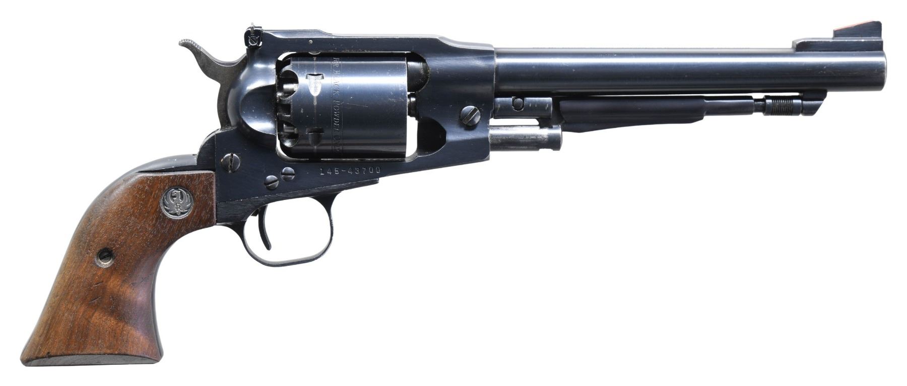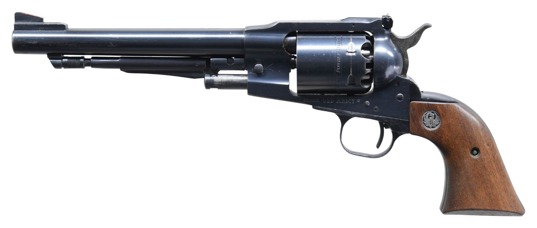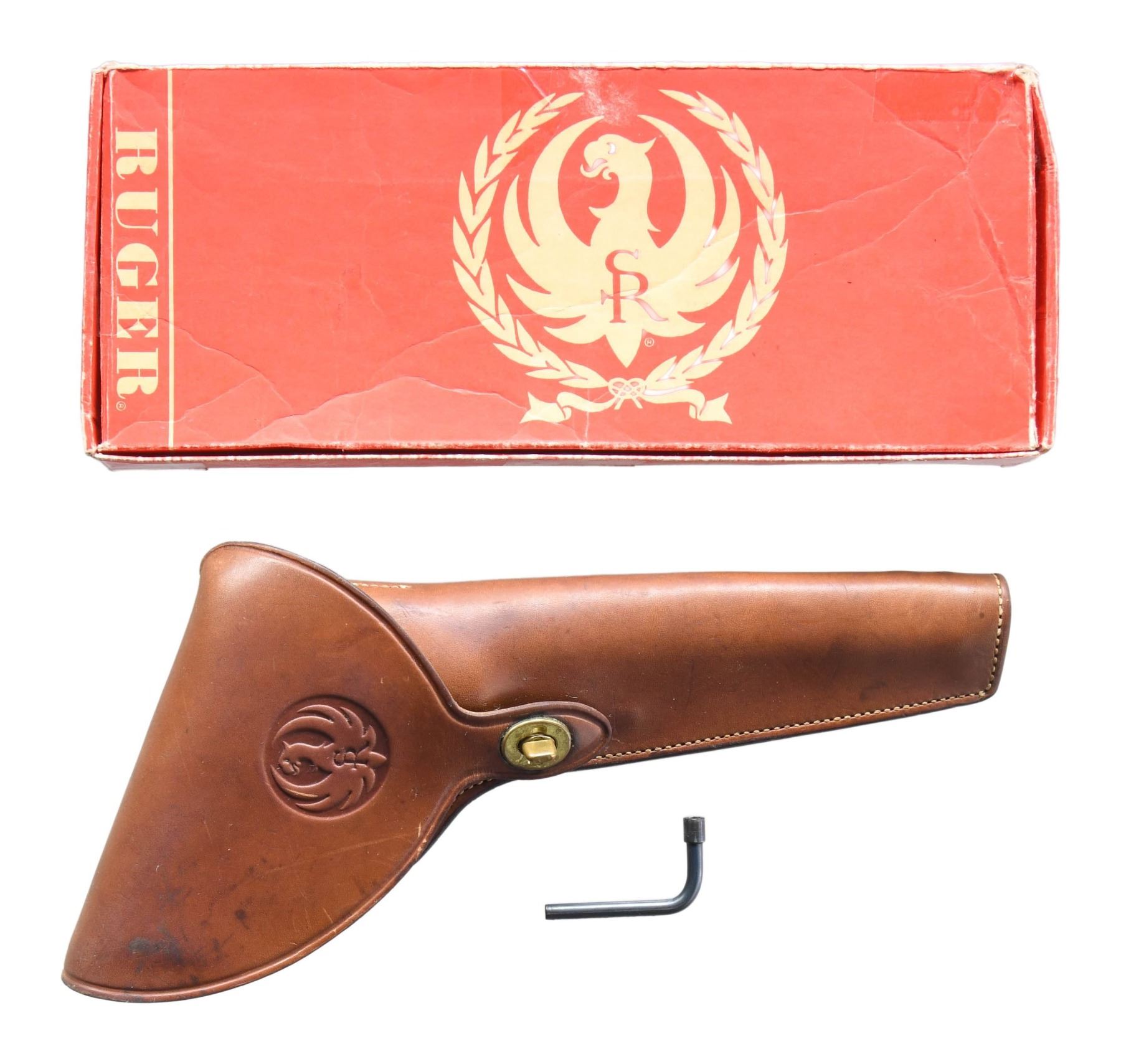 Cal. 45. S# 145-43700. Bbl. 7 1/2" with serrated ramped blade on base plus frame mounted adjustable rear. Mfg. 1982 as blued adj. sight model with factory walnut grips having silver eagle medallions; alloy grip frame. Barrel has "warning marks"; initiated late 1977 to early 1978. UNATTACHED ACCESSORIES: fair original matching numbered red hinged box having packaging tape added for corner reinforcement. Worn 1973 dated owner’s manual & good Ruger’s nipple wrench. Good to very good Ruger (made by Bianchi) flap holster marked for Old Army. CONDITION: good plus overall having slight cyl. turn line, occasional spots of peppery oxidation, stained sides of hammer, light loading assembly wear, faint high point wear, red paint on front sight, occasional faint marks, light grip wear plus very good to excellent bore & chambers. (01-28130/NW). ANTIQUE. $450-600.