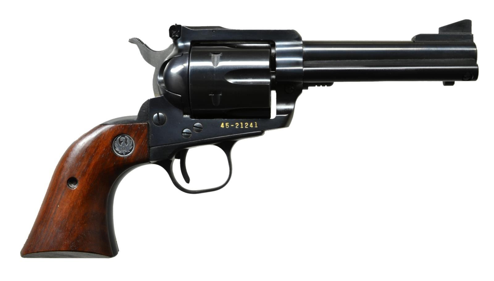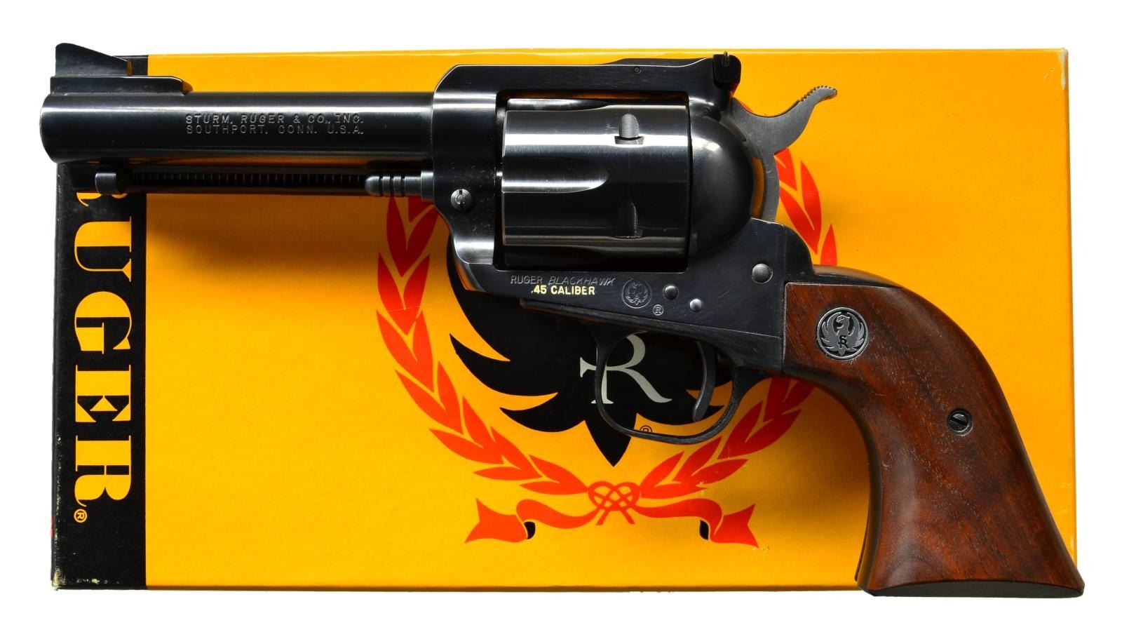 Cal. 45 Colt. S# 45-21241. Bbl. 4 5/8" w/ ramped base front sight & frame mounted adj. rear. Mfg. 1973 (1971-1973) w/ silver eagle medallion walnut grips. Original lockwork w/out factory safety update. White crayon added to some markings. UNATTACHED ACCESSORIES: near excellent original 2 piece yellow box w/ all original packaging plus matching number in red grease pencil on side of lid. CONDITION: great collector example w/ all aspects near excellent including bore & grips. (22-3524/NW). MODERN. $800-1,200.