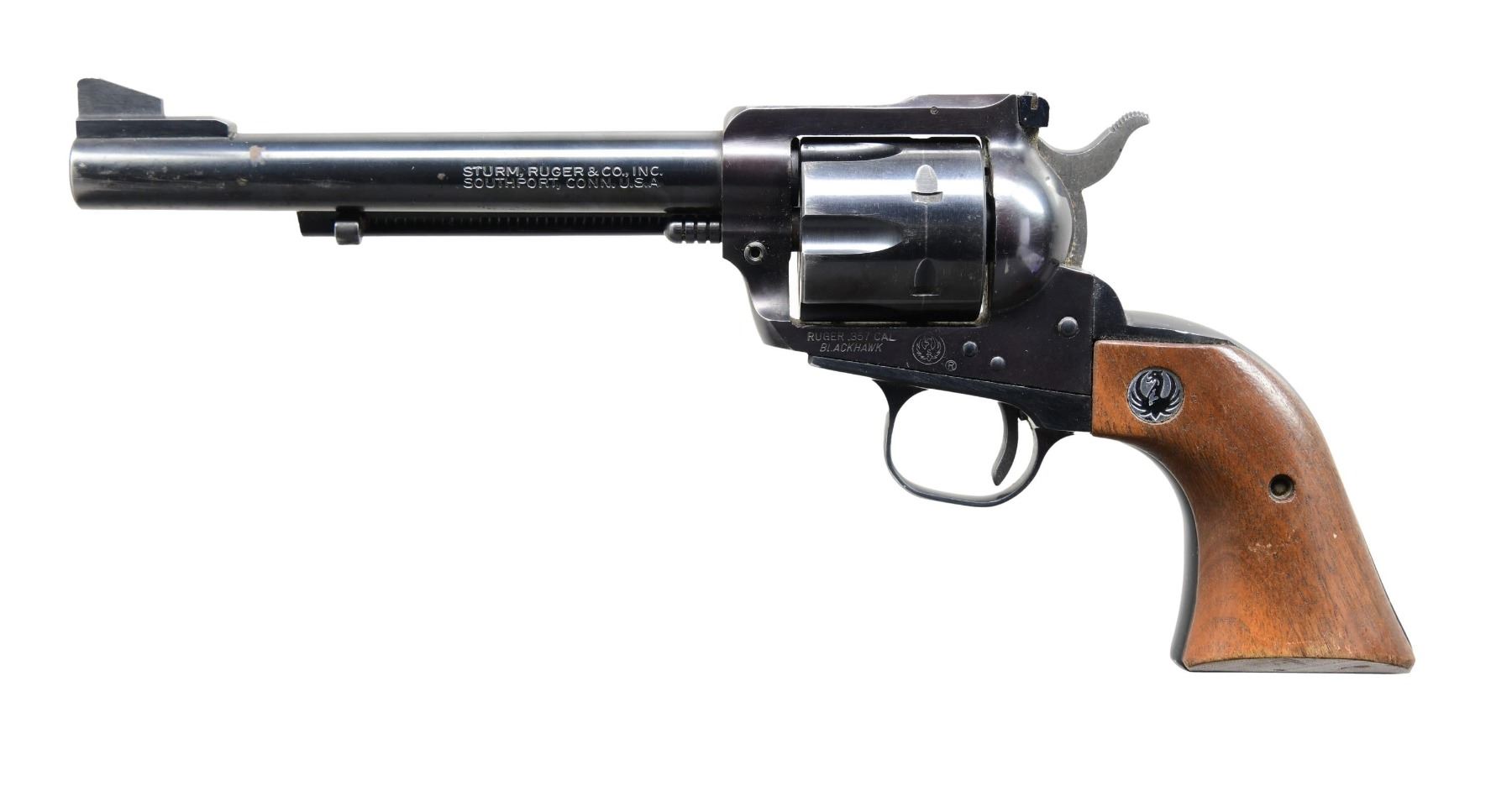 Cal. 357 Mag. S# 30-49848 (1970). Bbl. 6.5". Blade front sight and adjustable rear sight. Six-shot fluted cylinder. Two-piece walnut grips with black eagle medallions. CONDITION: good to very good metal finish, with occasional spots of oxidation with areas of wear and marks. Very good grips with wear and marks near the butt. Very good bore. (24-3915/MD). CURIO. $300-400.