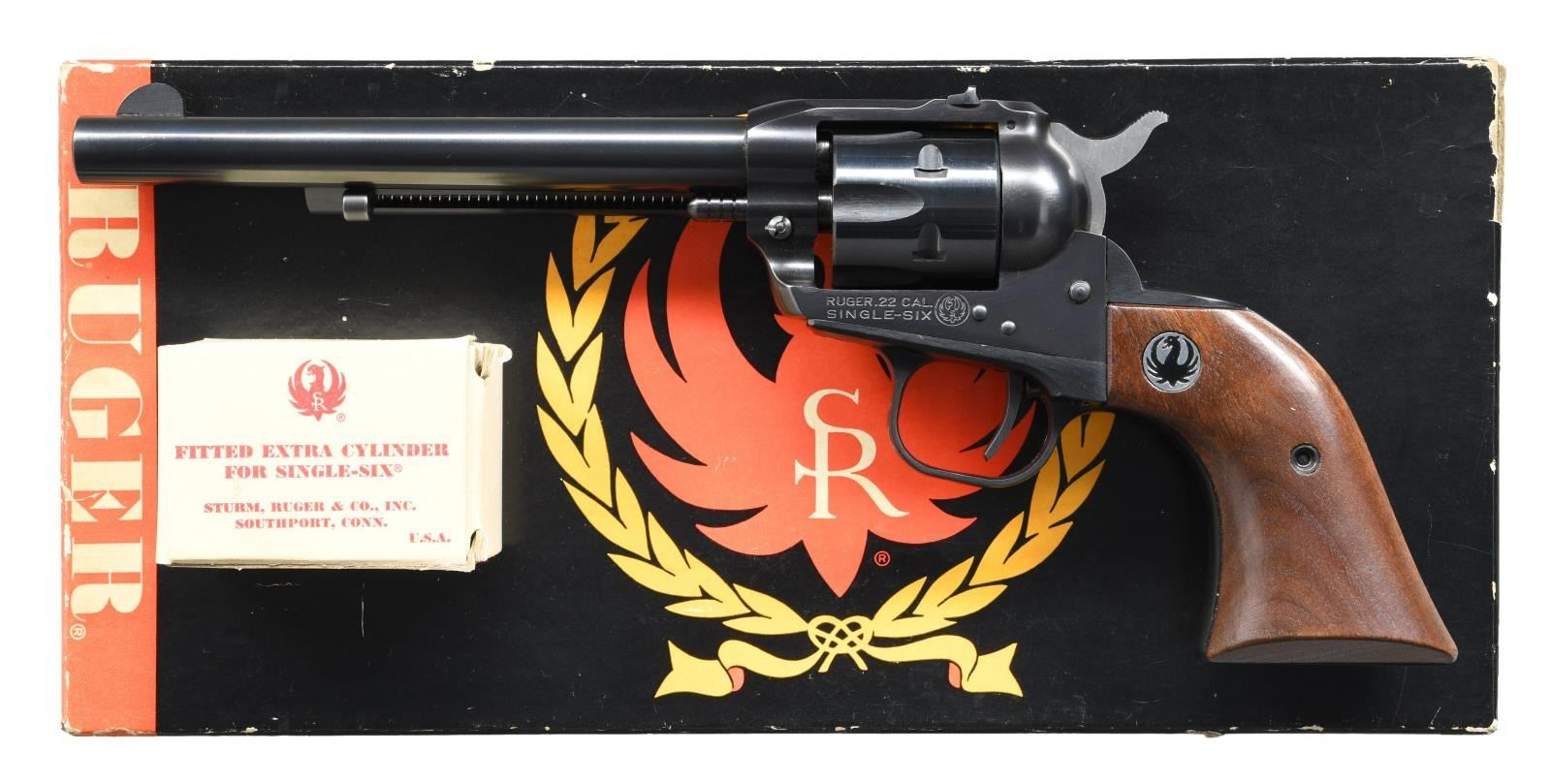 Cal. 22 LR / 22 Mag. S# 486850. Bbl. 6 1/2" with factory blade sight plus frame mounted fixed rear. Mfg. 1967 (1961-1973); XR3-RED frame with wood grips having black eagle medallions. Has factory safety update conversion installed; original parts included. Alloy ejector housing and drilled through base pin latch. Matching numbered 22 LR cylinder. UNATTACHED ACCESSORIES: very good to excellent original "W.M.R." marked box with matching number grease penciled on edge plus "13-C" added to label by black marker. 3-1-67 manual, owner's portion of warranty card, extra matching numbered 22 Mag. cylinder, red felt cylinder bag, cylinder box and original internal parts. CONDITION: all aspects near excellent including bore and grips. (23-1513/NW). CURIO. $450-600.