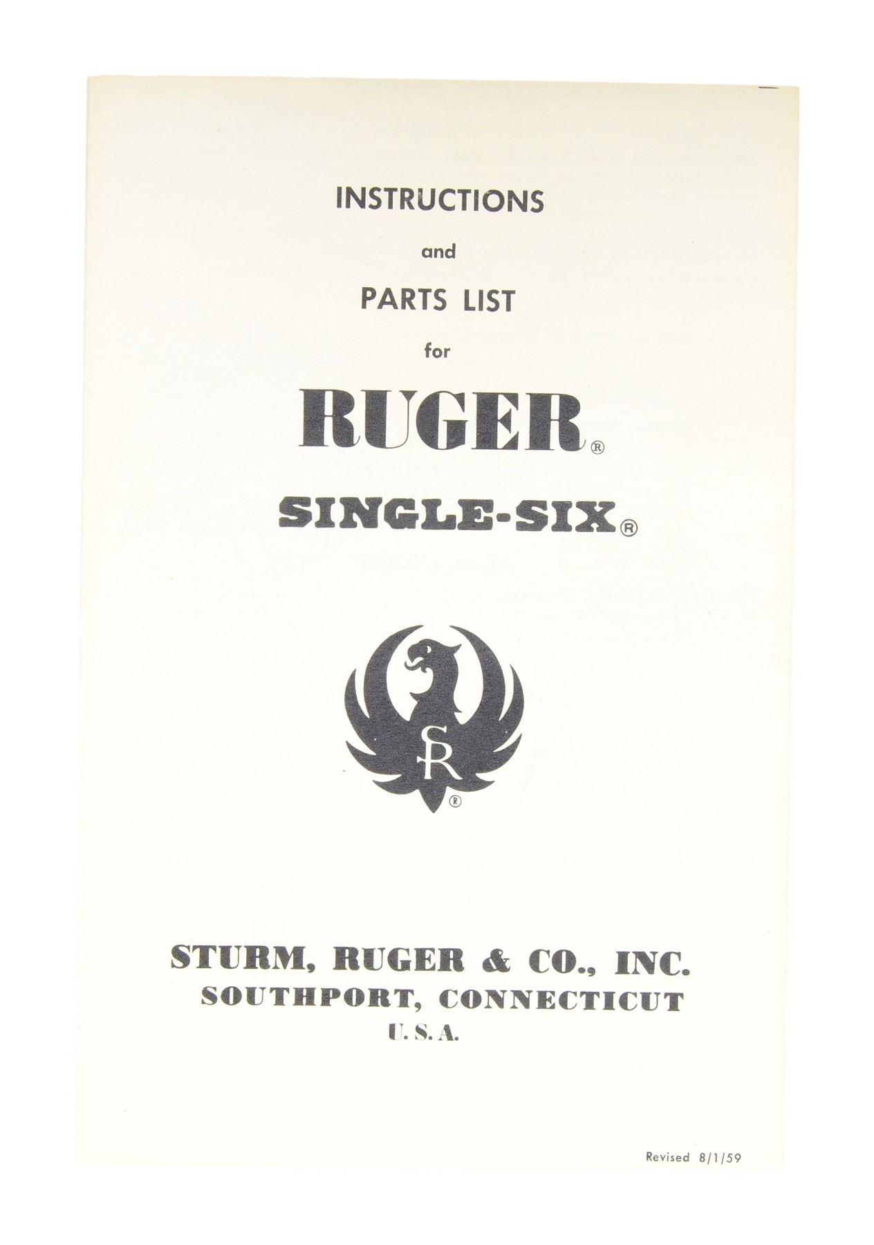 Please note as of 4/9/25 this item description has been updated. Please revisit this description and contact us with any questions. Cal. 22 LR. S# 165722. This Ruger Single-Six revolver features a blued finish. It has a 5.5-inch barrel, a fixed front sight, and a windage drift adjustable rear sight. The revolver is equipped with a single-action trigger and a spur hammer. The six-round cylinder is fluted. The grips are smooth wood with Ruger medallions. Has not had factory safety update; original lockwork plus steel ejector housing. UNATTACHED ACCESSORIES: original 2 piece box with 8-1-59 dated manual. CONDITION: Overall condition is excellent with 90% original finish remaining on the barrel and frame. The grips are in very good condition with minor wear. The bore is bright with strong rifling. CURIO (23-6567) $400-600.