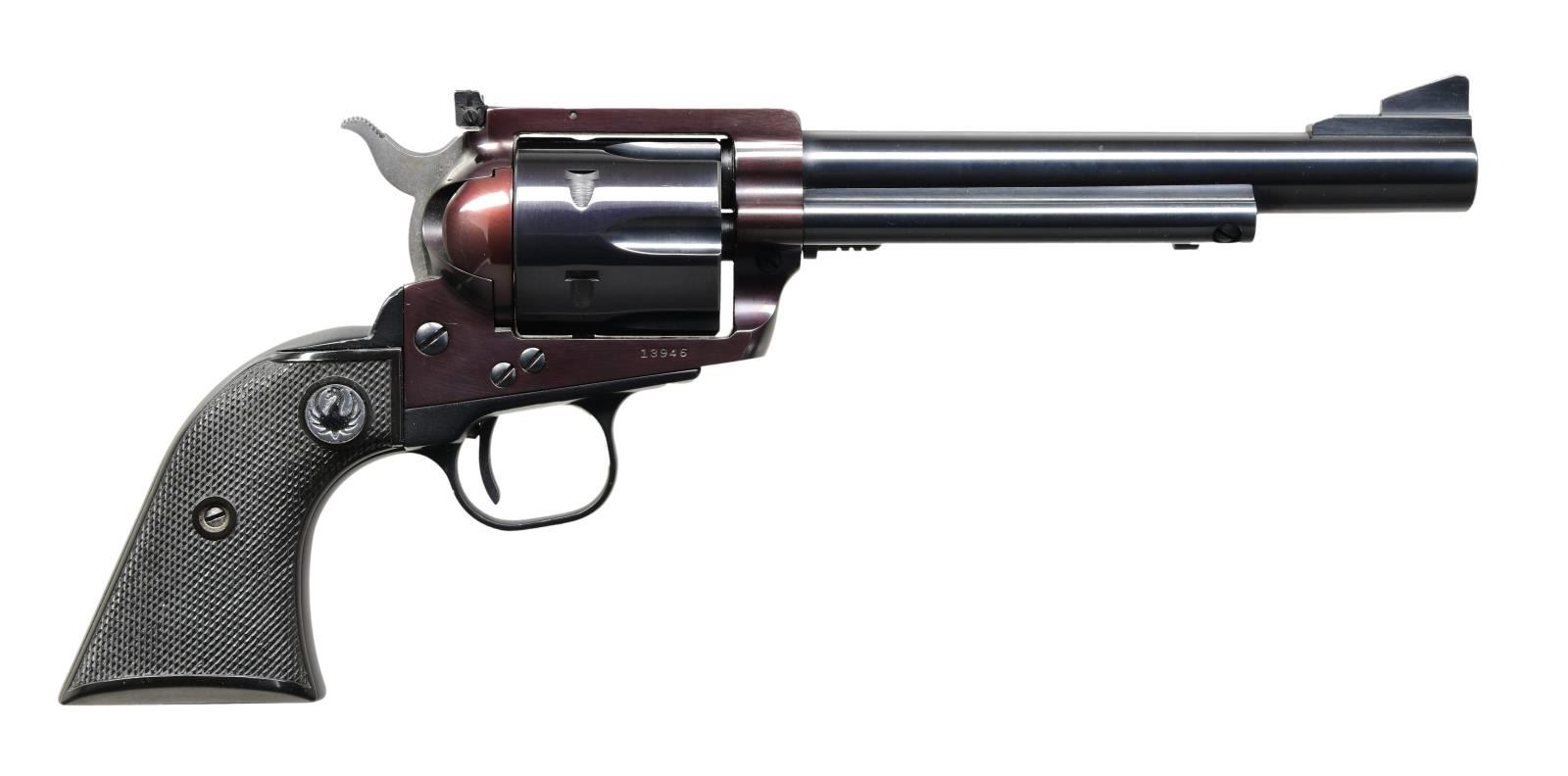 Cal. 44 Mag. S# 13946. Bbl. 6 1/2" with serrated blade sight on ramped base; micro-adjustable rear sight on flat top cylinder frame. Mfg. 1958 (1956-1962) as Type 3 with an XR3 grip frame and checkered black hard rubber grips with black eagle medallions. Retains the original lockwork without a factory safety update. Steel offset slotted ejector housing, drilled through base pin latch, collared base pin, no "INC." in barrel address, and flat ejector rod head. Face of the cylinder is stamped "946". CONDITION: slight impact mark on top of front sight; balance has fine factory quality refinish with exceptional plum hue to cylinder frame and loading gate. Near-excellent bore and grips. (23-6264/NW). CURIO. $650-900.