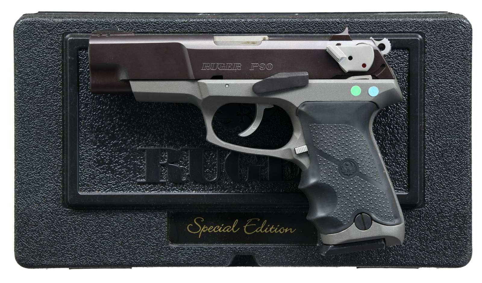WITH CASE. Cal. .45 ACP. S# 663-61141. 4 3/8". Model P90 Special Edition manufactured by Ruger in 2004. Dual-tone finish with Ruger textured black rubber 1 piece wrap around grip. Pinned front sight, dovetailed square notch rear sight, and safety/decocker on left side of slide. MAGS 2 8 rd. UNATTACHED ACCESSORIES: matching factory hard case containing factory paperwork, lock, and spare magazine. CONDITION: excellent, with metal components retaining virtually all of their original factory finishes, exhibiting a couple of very small spots of mild discoloration on the frame. Magazine base shows some scattered handling marks, but otherwise is sturdy and serviceable. Mirror bore, exhibiting strong rifling throughout. Grip is very good. Case is very good overall. (23-2432/MLW). MODERN. $300-500.