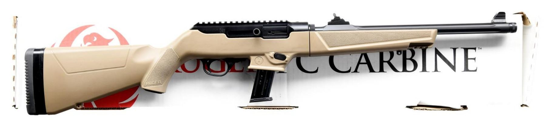 Cal. 9mm. S# 912-20743. Bbl 16" fluted & threaded. Blade front sight w/ protective ears. Aperture rear sight. Takedown pistol caliber carbine. Receiver has picatinny rail for optic mounting. Matte black finish. FDE finished stock w/ bottom mounted sling studs & picatinny rail at front. MAGS: 1-16 rd. UNATTACHED ACCESSORIES: matching numbered box, paperwork, manual, trigger lock, spare buttplate, mag well & tools. CONDITION: all aspects near excellent. PROVENANCE: The Collection of Gun Sport Ltd owned by Jon R. Thomas. (23-3552/MJC). MODERN. $500-800.