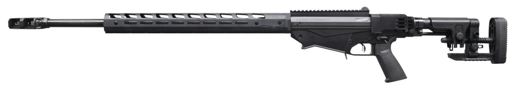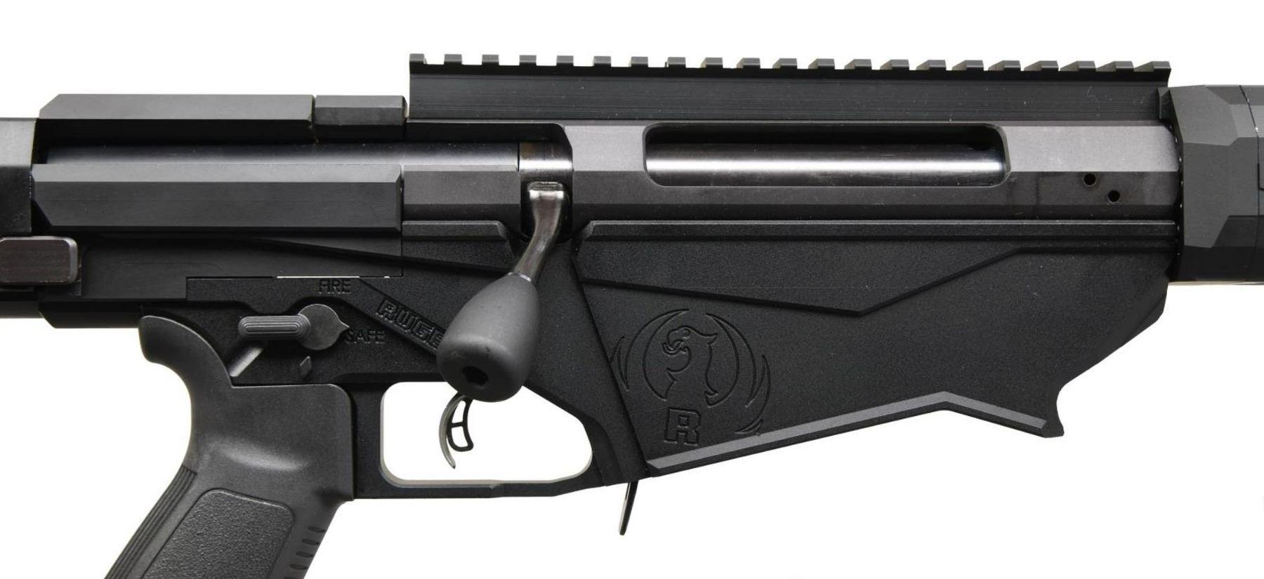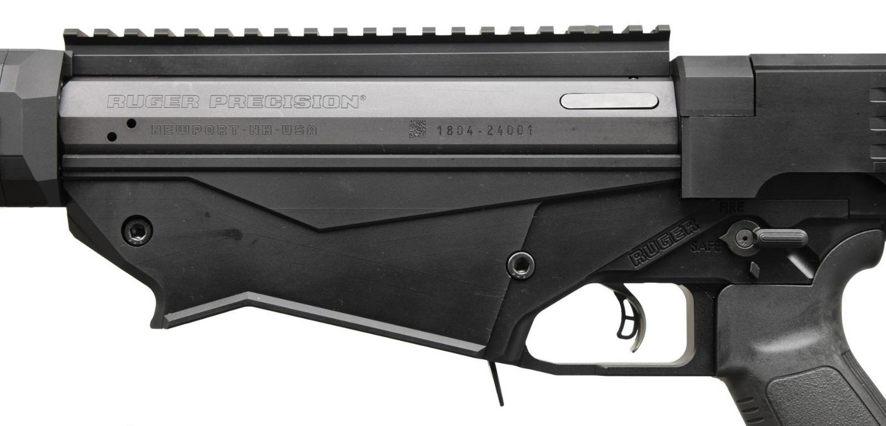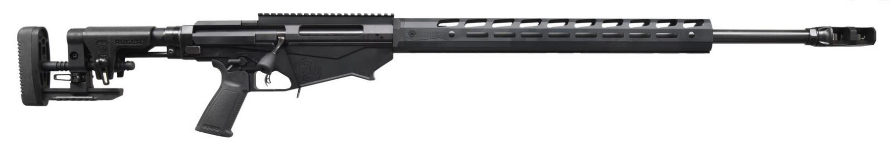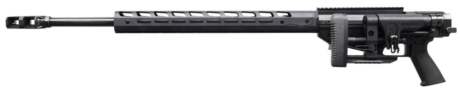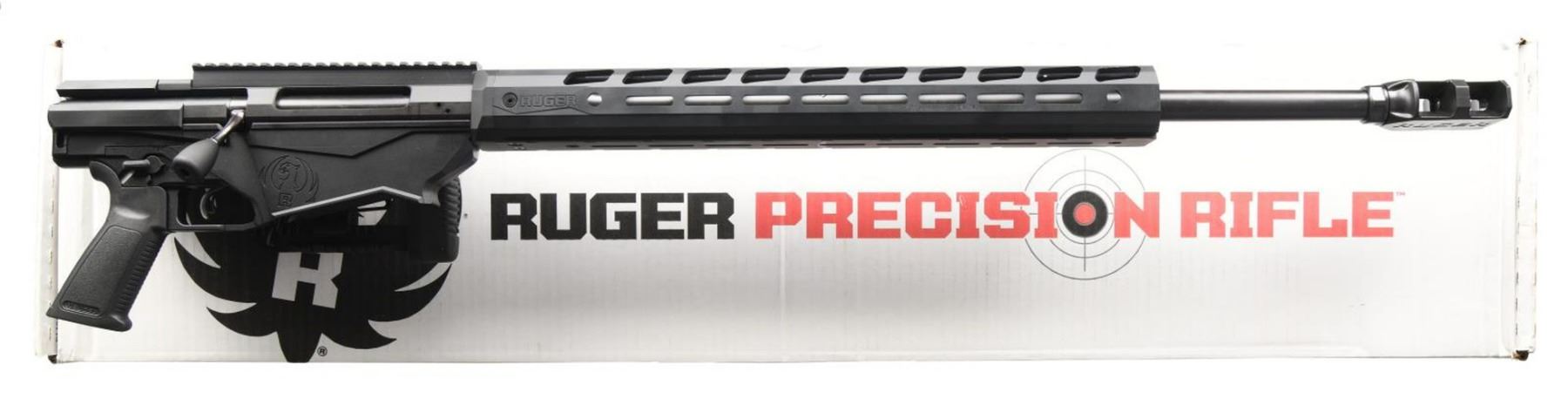 Cal. 300 Win. Mag. S# 1804-24001. Bbl. 26" hammer forged 1 in 9 RH twist heavy weight target with 5R rifling; 5/8-24 threaded muzzle having efficient large port muzzle brake. Mfg. 2021 at Ruger's Newport, NH facility as Model 18081 having black anodized finish on its fully adjustable folding stock. Free float handguard with M-Lok slots, 12.7 to 16.2 inch LOP stock, 15.2 pound weight, 2.25 to 5 pound Marksman Adjustable trigger, ambidextrous safety, large bolt knob attached by 5/16-24 threads allowing user changing for other designs and current MSRP of $2,539. MAGS: 2 factory 15 rd. UNATTACHED ACCESSORIES: factory box and packaging. CONDITION: all aspects near excellent appearing new and unfired. PROVENANCE: The Collection of Gun Sport Ltd owned by Jon R. Thomas. (23-3361/NW). MODERN. $1,500-2,000.