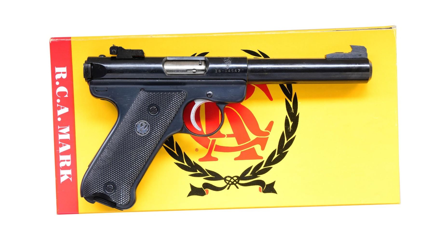 1) RCA MARK II TARGET WITH "COD BOX". Cal. 22 LR. S# 18-04547. Mfg. 1982 as Catalog# MK-512. Blued finish. Bbl. 5.5". Adjustable rear sight & fixed front sight. Top of pistol has gold inlaid RCA & engraved "1540". The grips are checkered black polymer. MAGS: 1-10 Rds. UNATTACHED ACCESSORIES: shipping box, "cod box" & yellow Ruger box w/ paperwork. CONDITION: Overall near excellent condition; bore is bright with strong rifling. (24-2900/MD). 2) MARK III 22/45 HUNTER WITH MATCHING BOX. Cal. 22 LR. S# 270-16228. Mfg. 2008 as Model 10127 & Catalog No. P512HMKIII. Blued finish with 5.5" fluted barrel & Hi-Viz sights. The grips are checkered black synthetic with a red Ruger medallion. MAGS: 2-10 Rds. UNATTACHED ACCESSORIES: Factory box, instruction manual, additional magazine, and gun lock. CONDITION: Overall near excellent condition. The bore is bright and clean with sharp rifling. (24-2930/MD). ALL MODERN. $600-$1,000.