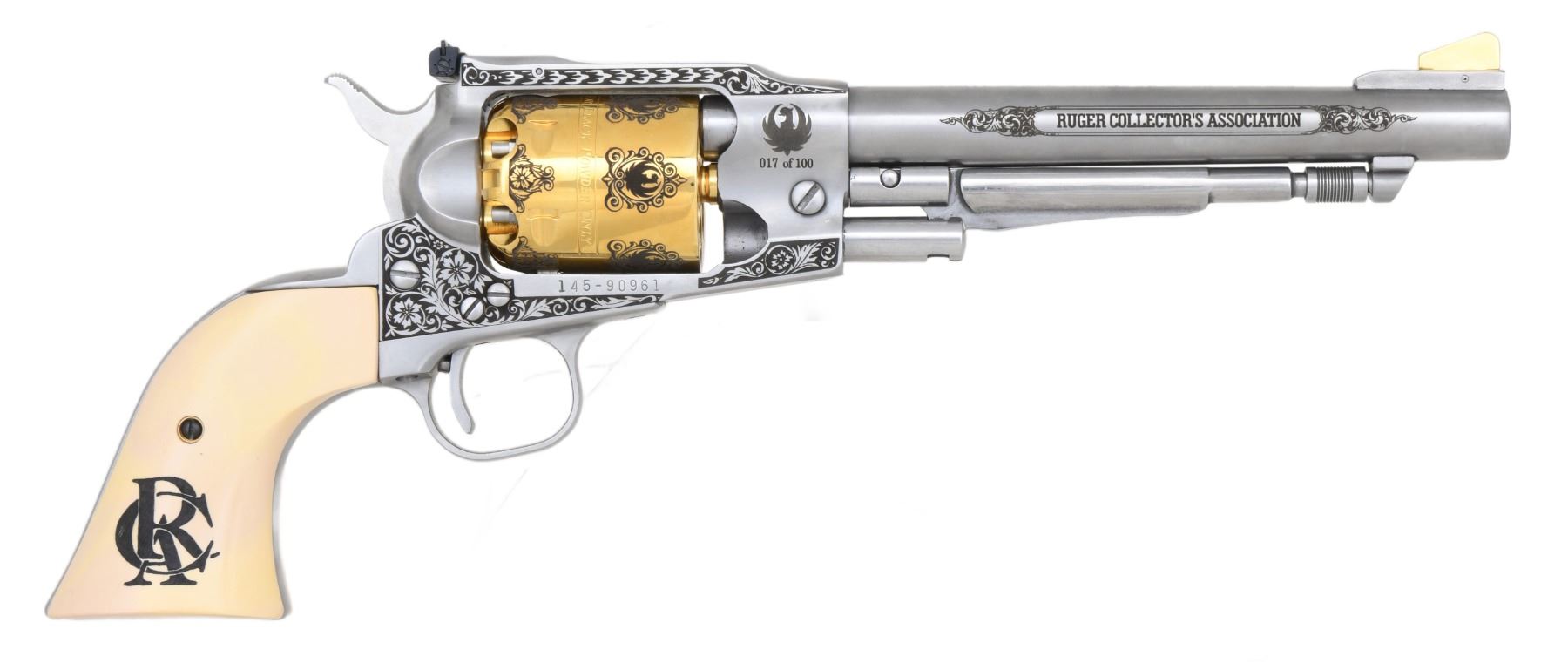 Cal. 45. S# 145-90961. Bbl. 7 1/2" with gold plated serrated blade on ramped base for front sight plus factory frame mounted adjustable rear sight. Mfg. 1999 in stainless with gold plated cylinder, Micarta grips having intertwined RCA initials, scroll engraving and marked "017 of 100". In 1997 a 25th RCA Anniversary model was made outside the factory with limited production runs of 250 and 2,000. This is of only 100 units and in the 50th year of Sturm, Ruger & Co. It is almost identical to the 25th model but without any engraving on the grip frame; 25th model had RCA engraved on the bottom of the trigger guard. UNATTACHED ACCESSORIES: matching numbered grey plastic factory case with paperwork and nipple wrench. CONDITION: all aspects near excellent appearing new and unfired. (01-24573/NW). ANTIQUE. $800-1,200.