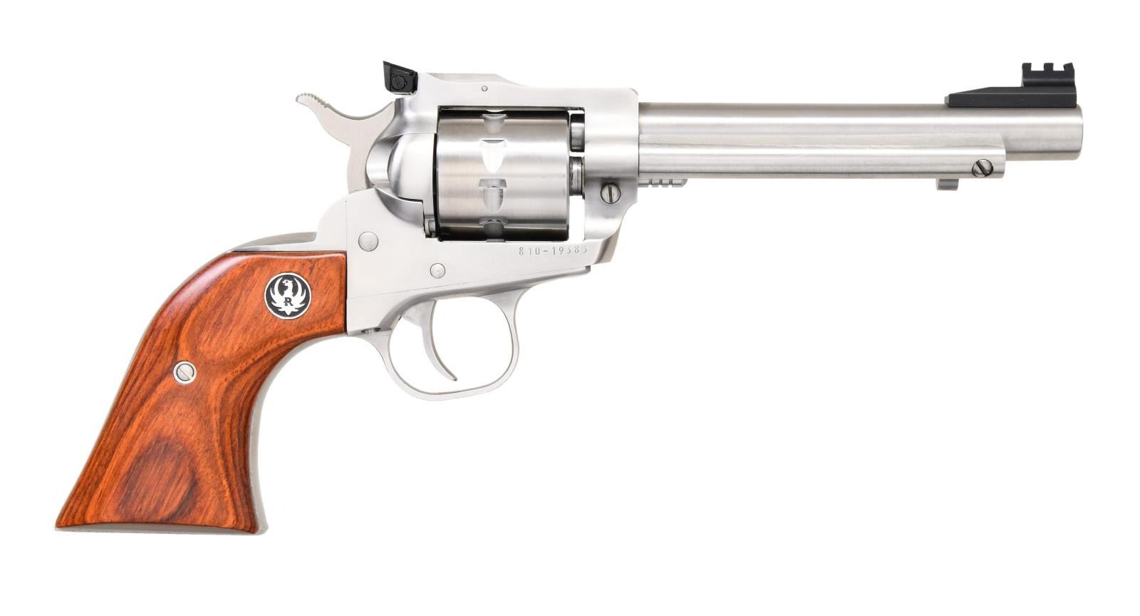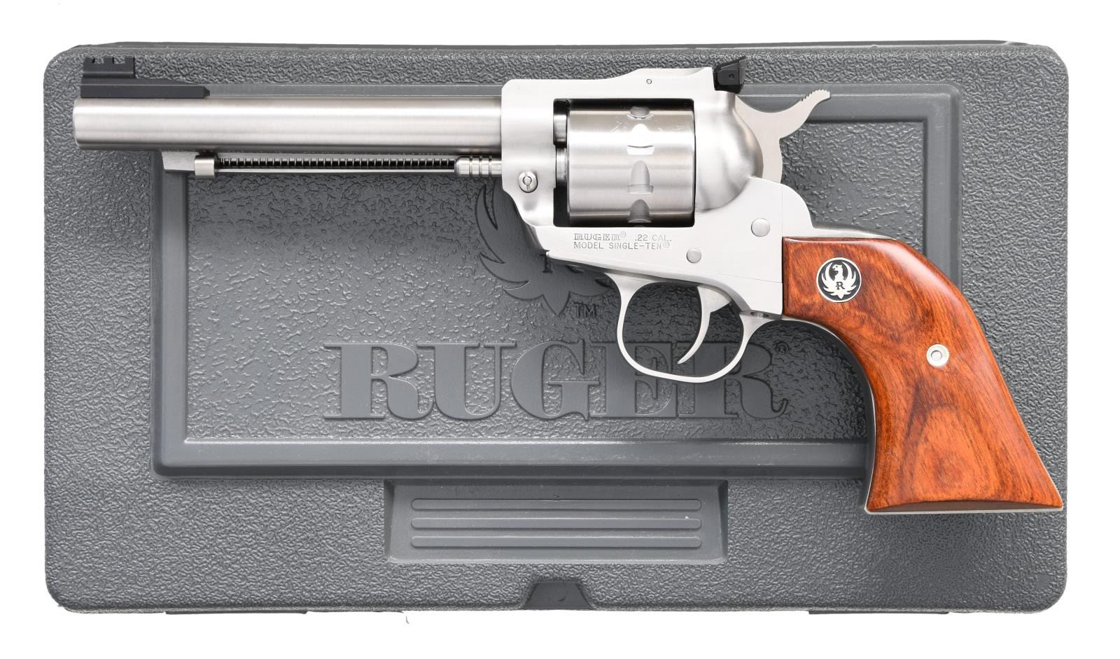 Cal. 22 LR. S# 810-19383. Bbl. 5 1/2". Fiber optic sights. Ten shot cyl. Stainless finish. Rosewood laminated grips w/ silver Ruger medallions. UNATTACHED ACCESSORIES: matching numbered factory hardcase w/ manual, paperwork, trigger lock & fired case. CONDITION: all aspects near excellent. (23-6649/MJC). MODERN. $400-600.